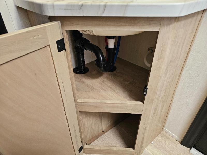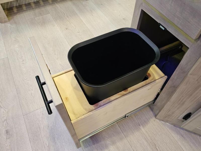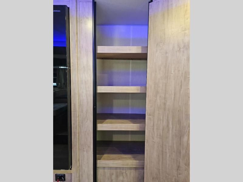 Walk-in pantry for storing snacks, dry goods, and camping essentials.