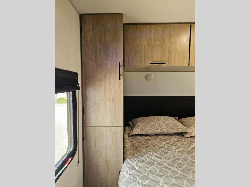 Front private bedroom features an RV king bed with dual wardrobes for personal storage.