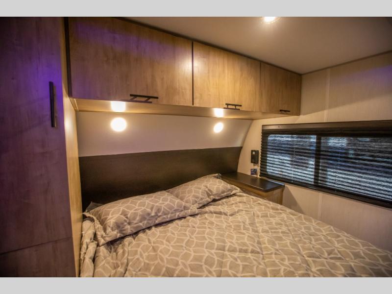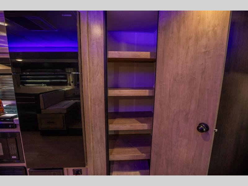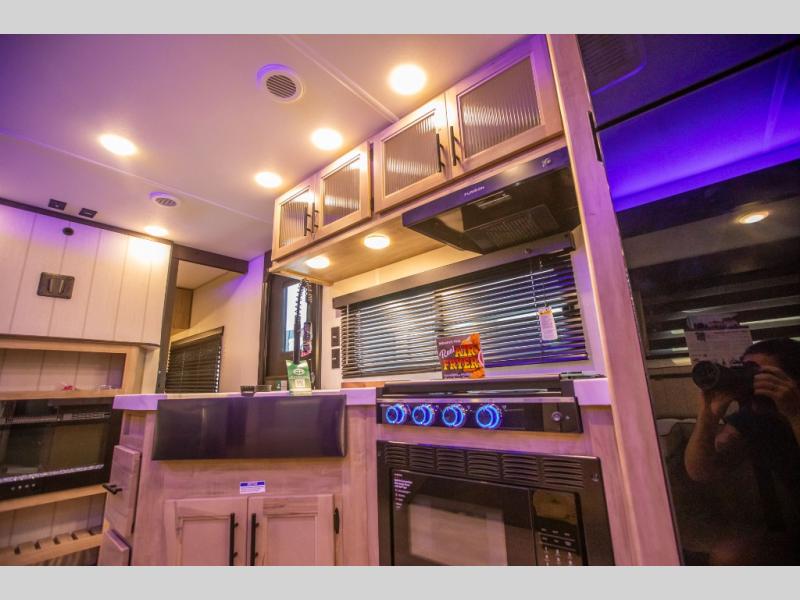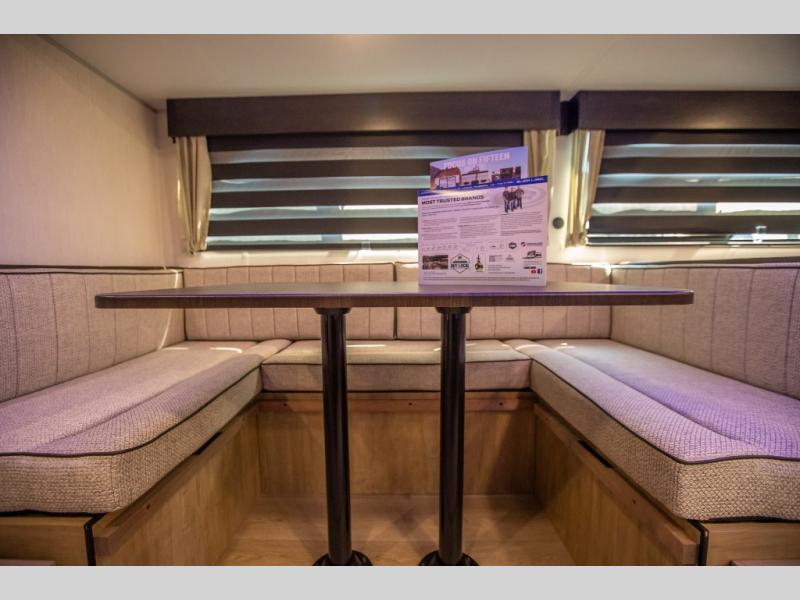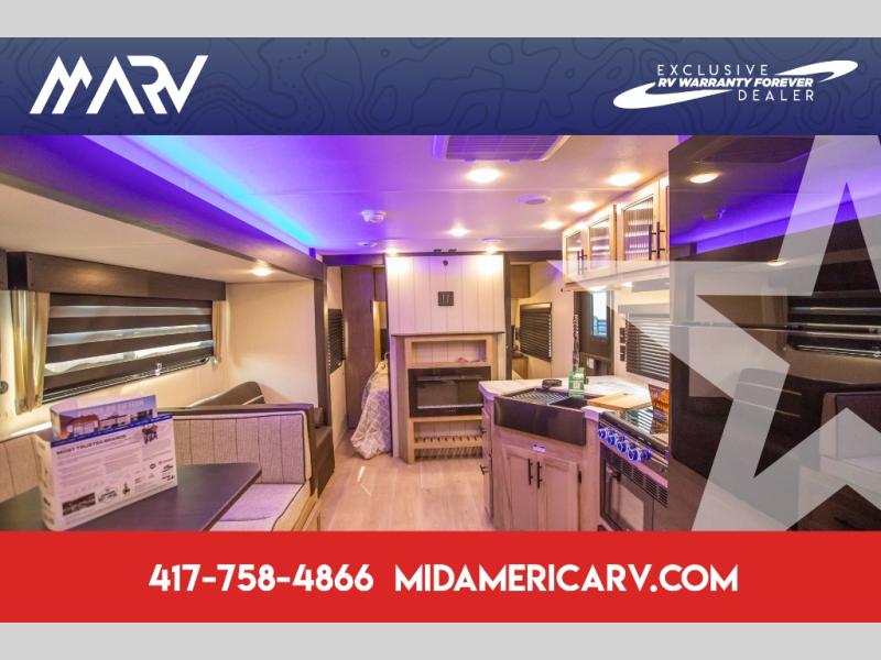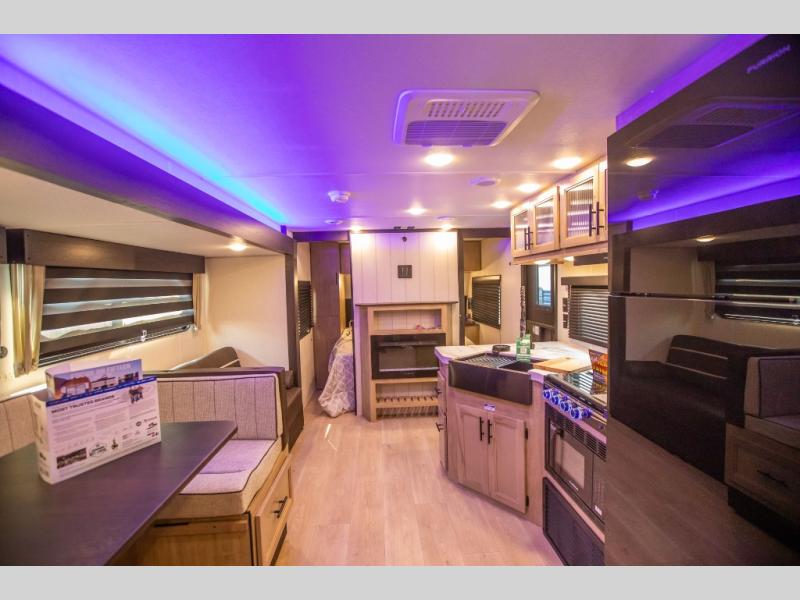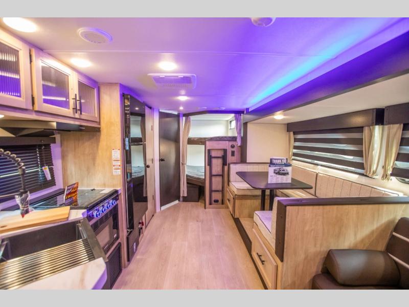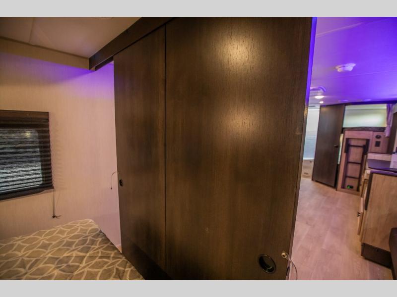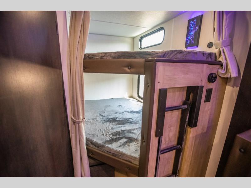 Come on inside this Cherokee Grey Wolf travel trailer and experience the convenience of a smooth flow of traffic in and out with two entry doors. The rear door leads into a full bath which is great for accessibility. Once inside, you will notice the large U-shaped dinette and the sofa which sit on the slide and create a spacious footprint for moving about, as well as great places to play games and socialize with your friends and family. A walk-in pantry provides plenty of storage allowing you to stock up on your favorite snacks and dry goods for your family adventure. At night, there is sleeping space for everyone between the double-size bunks and the RV king bed, plus the furniture.