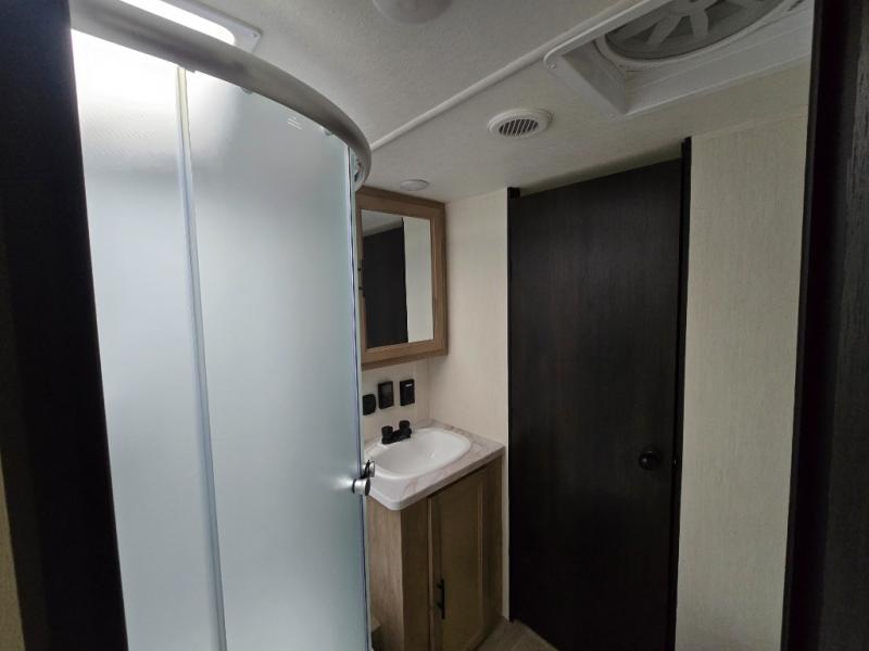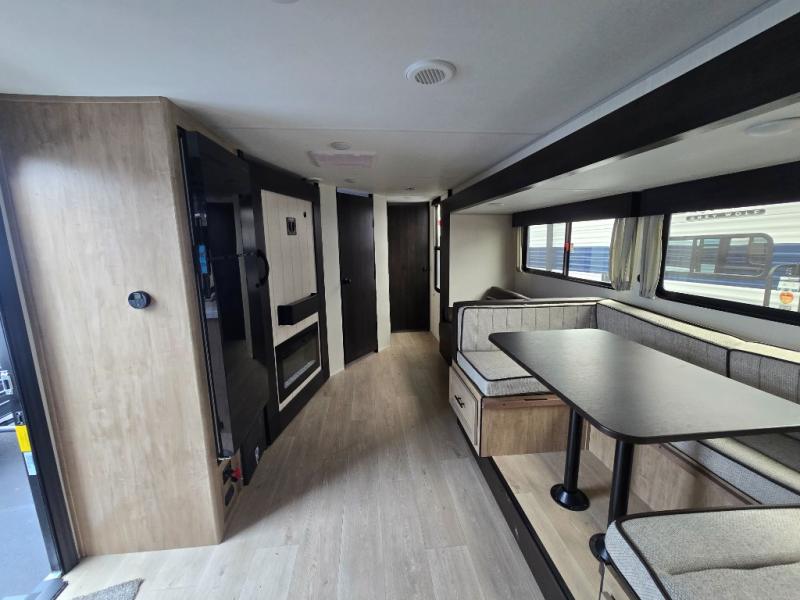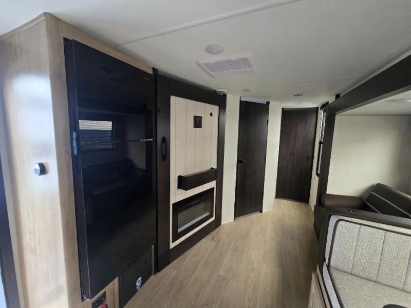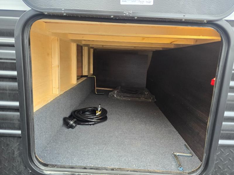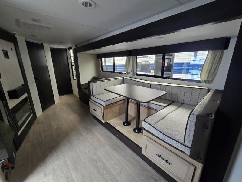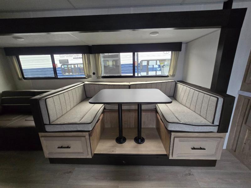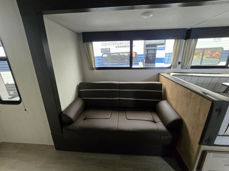 Come on inside this Cherokee Grey Wolf travel trailer and experience the convenience of a smooth flow of traffic in and out with two entry doors. The rear door leads into a full bath which is great for accessibility. Once inside, you will notice the large U-shaped dinette and the sofa which sit on the slide and create a spacious footprint for moving about, as well as great places to play games and socialize with your friends and family. A walk-in pantry provides plenty of storage allowing you to stock up on your favorite snacks and dry goods for your family adventure. At night, there is sleeping space for everyone between the double-size bunks and the RV king bed, plus the furniture.