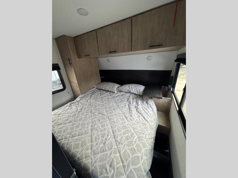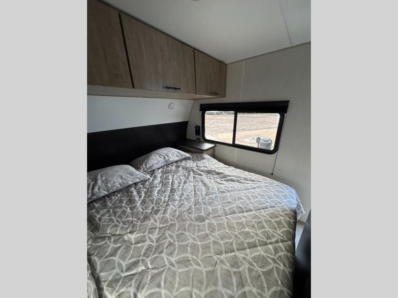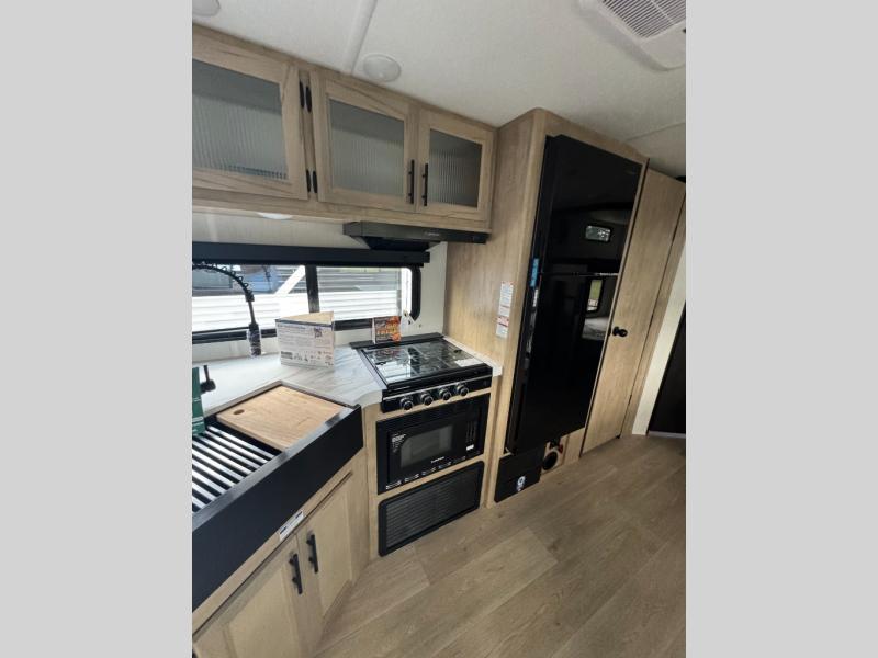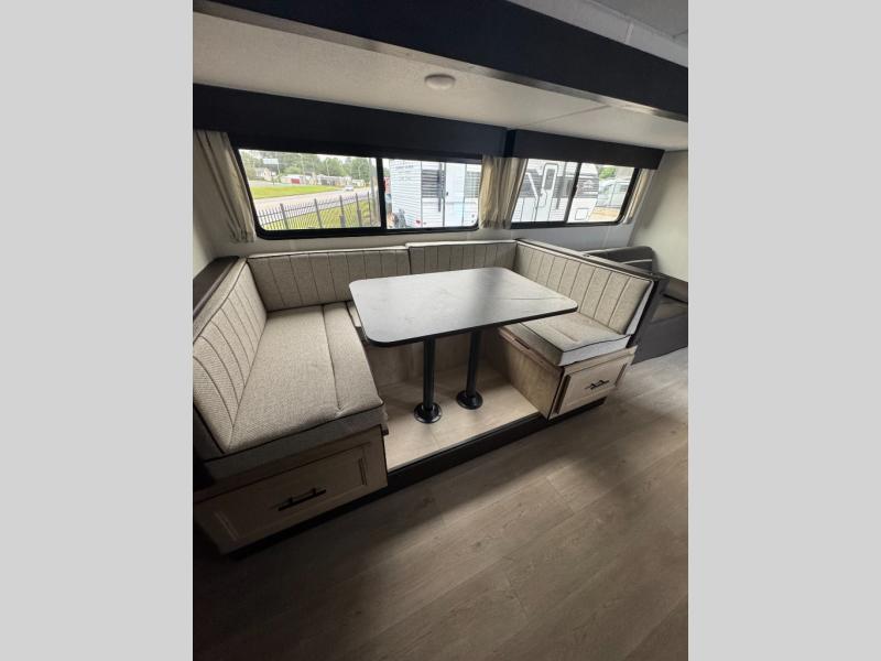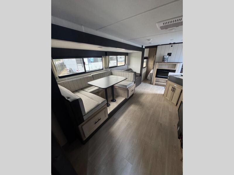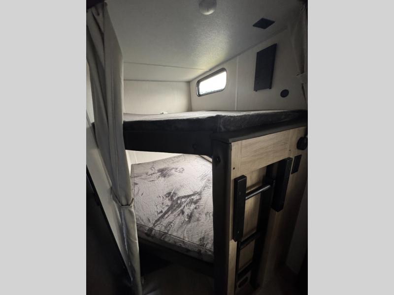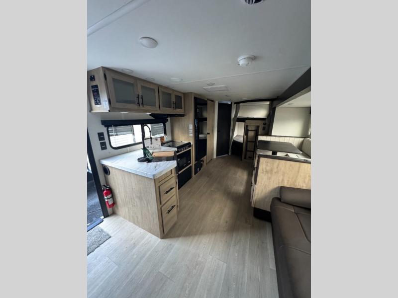 Come on inside this Cherokee Grey Wolf travel trailer and experience the convenience of a smooth flow of traffic in and out with two entry doors. The rear door leads into a full bath which is great for accessibility. Once inside, you will notice the large U-shaped dinette and the sofa which sit on the slide and create a spacious footprint for moving about, as well as great places to play games and socialize with your friends and family. A walk-in pantry provides plenty of storage allowing you to stock up on your favorite snacks and dry goods for your family adventure. At night, there is sleeping space for everyone between the double-size bunks and the RV king bed, plus the furniture.