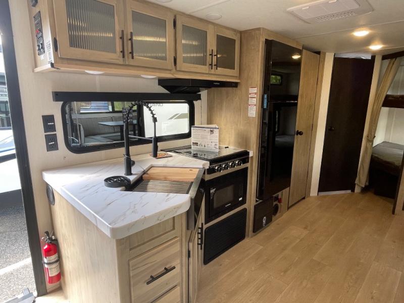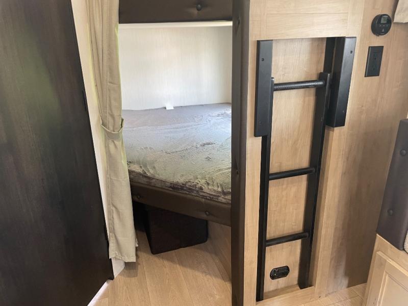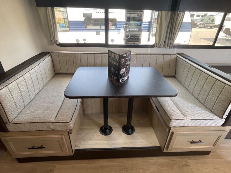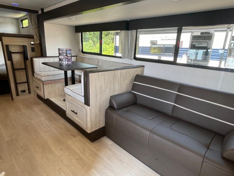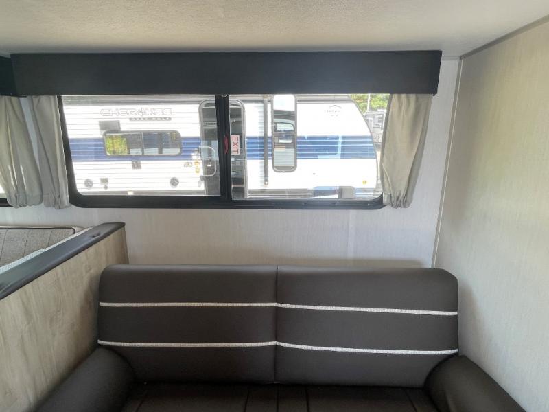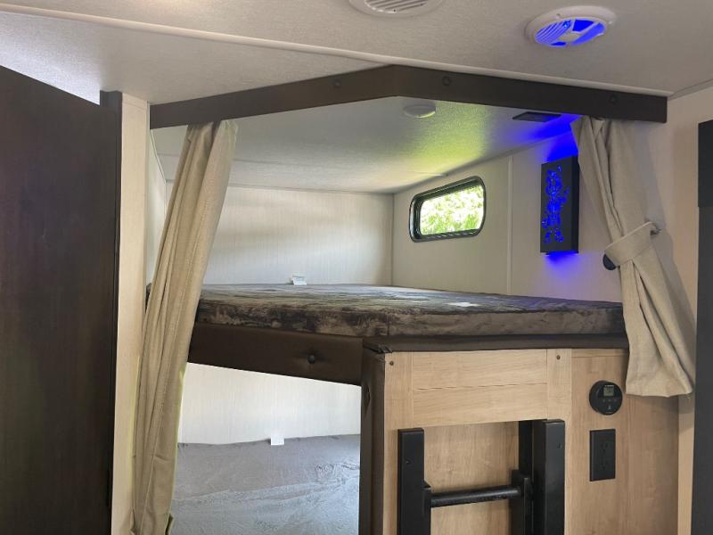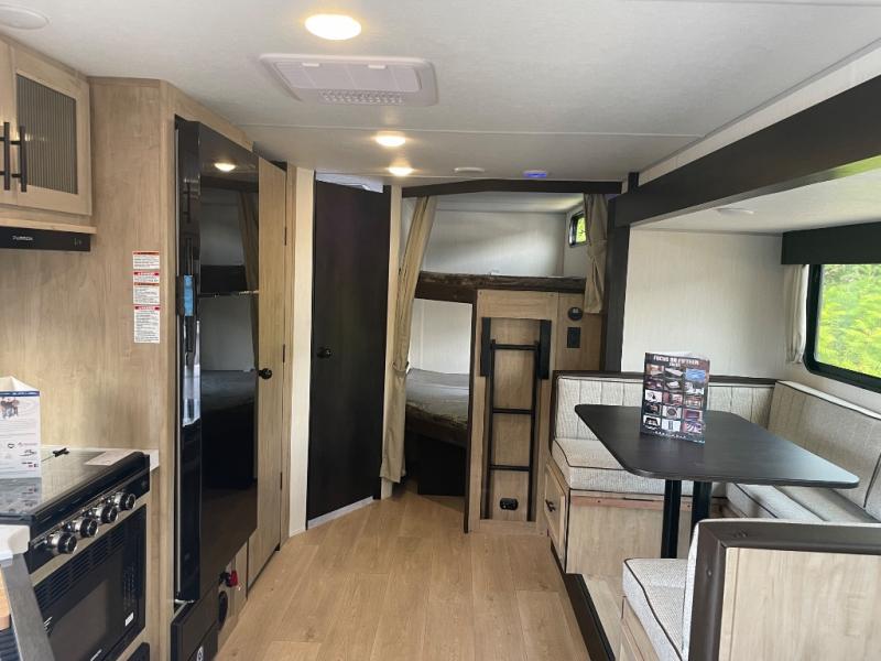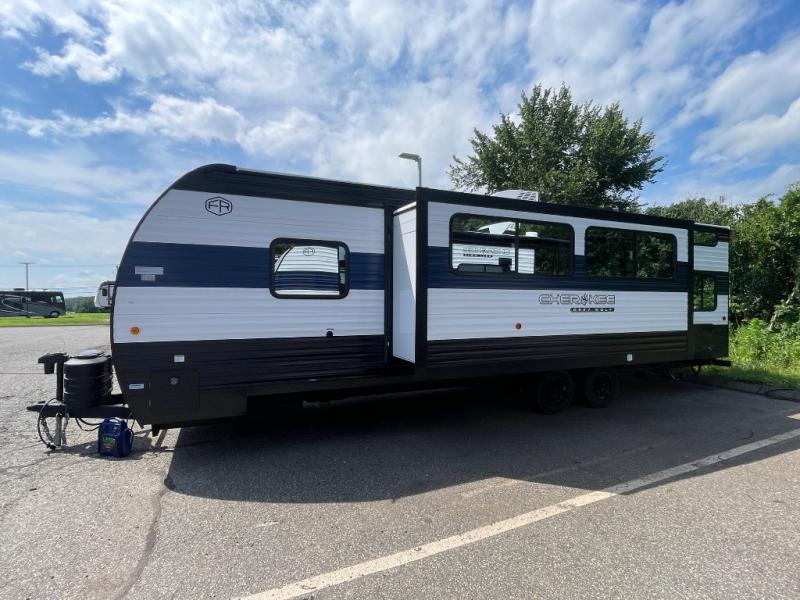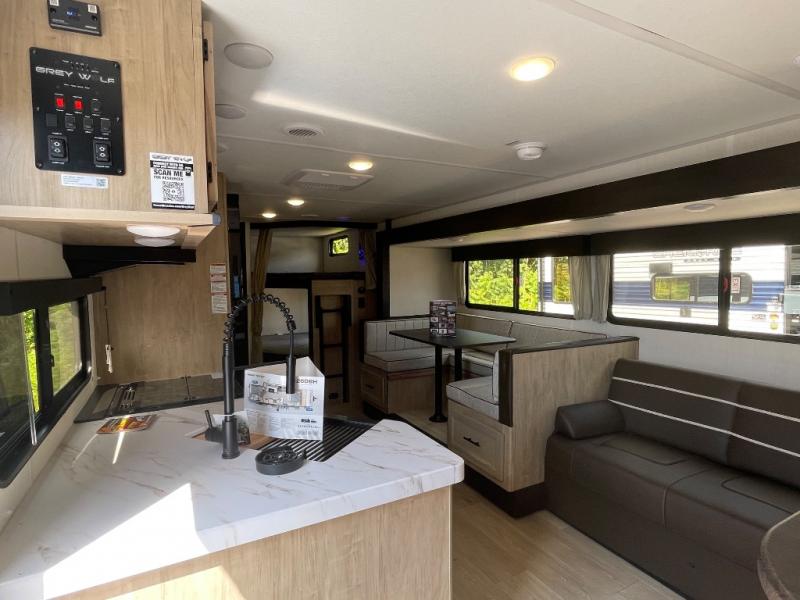Come on inside this Cherokee Grey Wolf travel trailer and experience the convenience of a smooth flow of traffic in and out with two entry doors. The rear door leads into a full bath which is great for accessibility. Once inside, you will notice the large U-shaped dinette and the sofa which sit on the slide and create a spacious footprint for moving about, as well as great places to play games and socialize with your friends and family. A walk-in pantry provides plenty of storage allowing you to stock up on your favorite snacks and dry goods for your family adventure. At night, there is sleeping space for everyone between the double-size bunks and the RV king bed, plus the furniture.