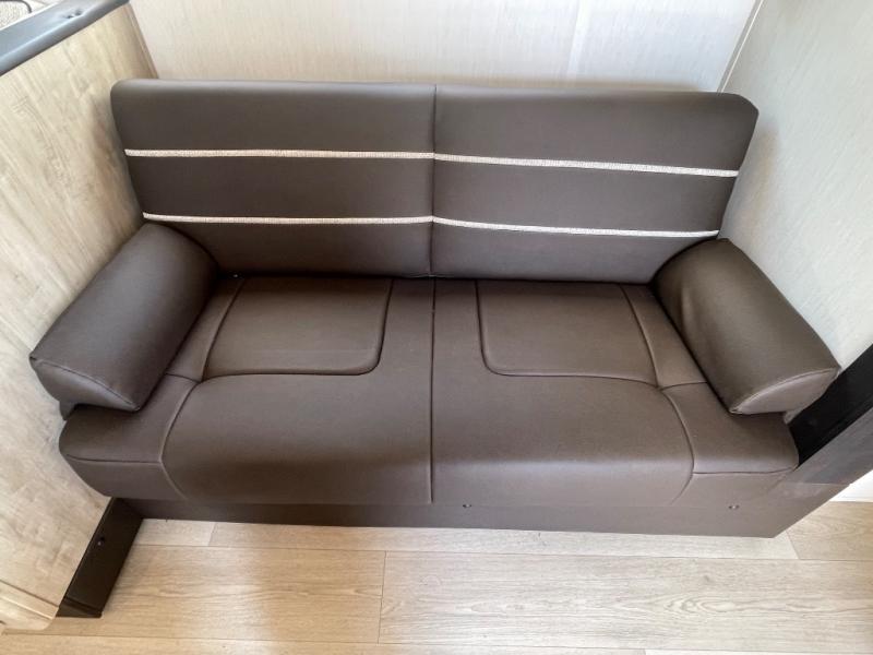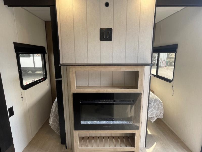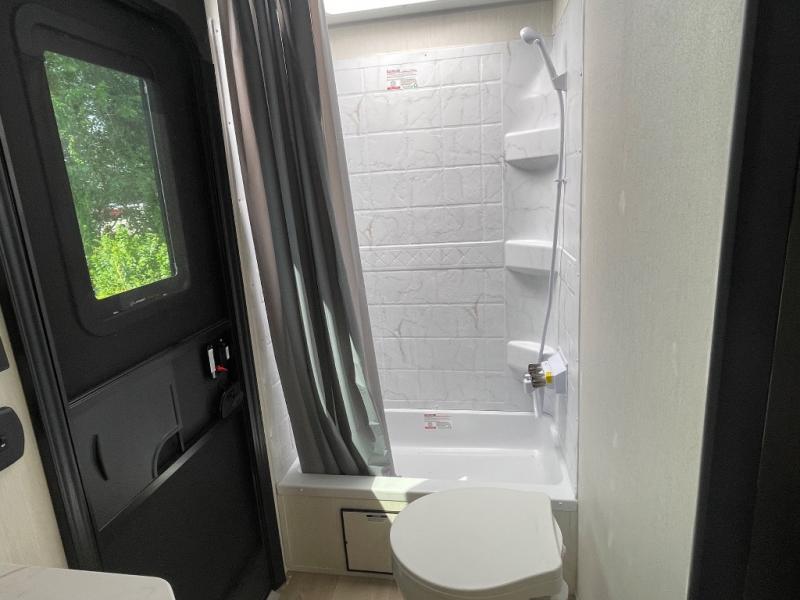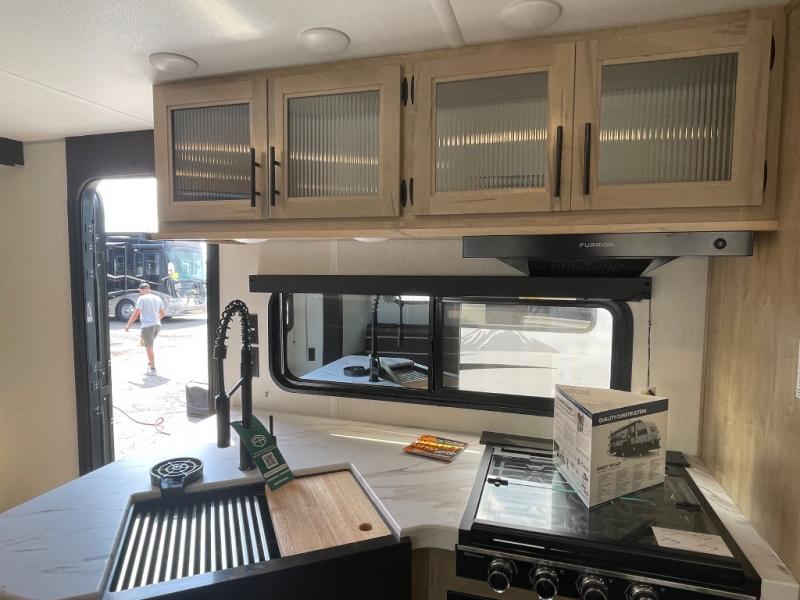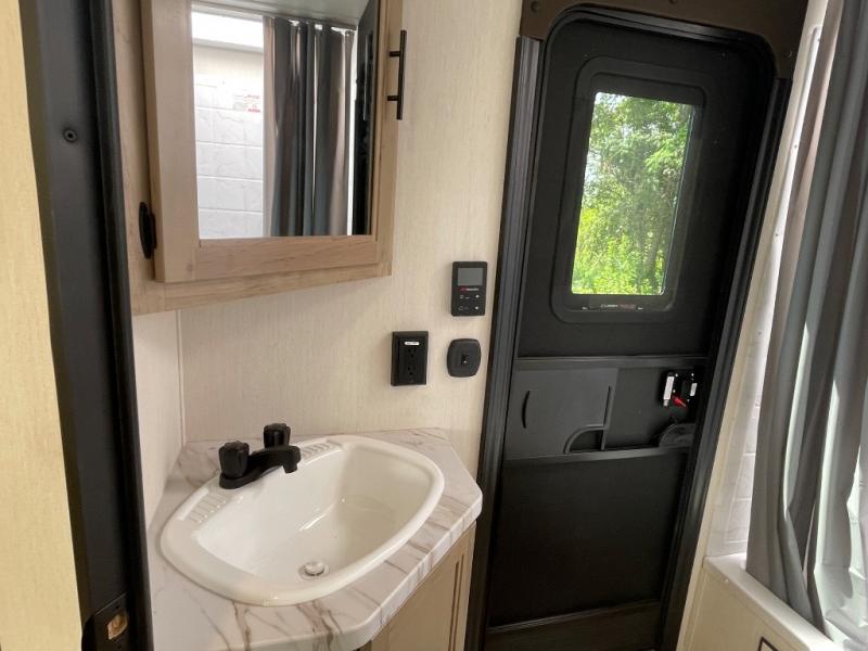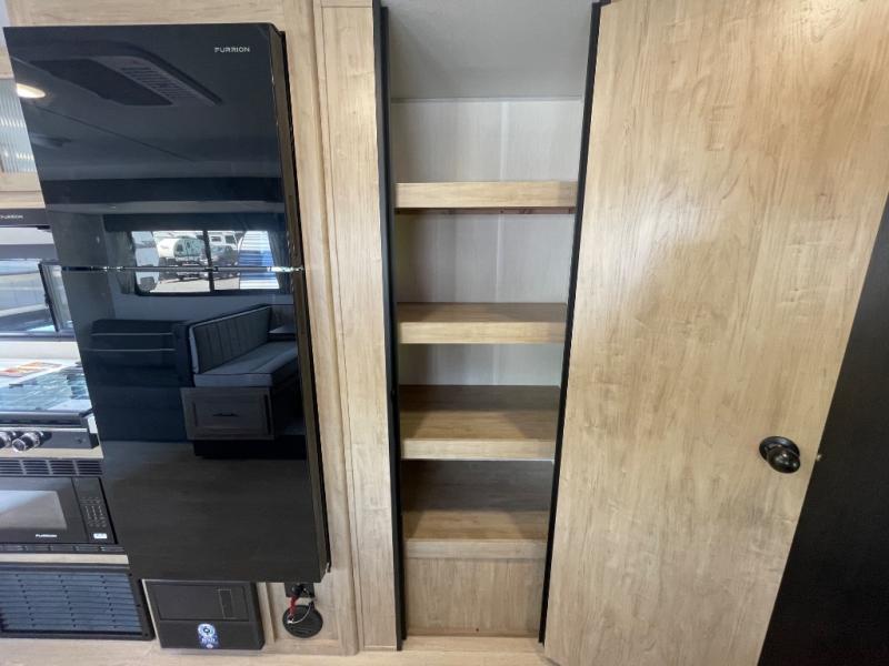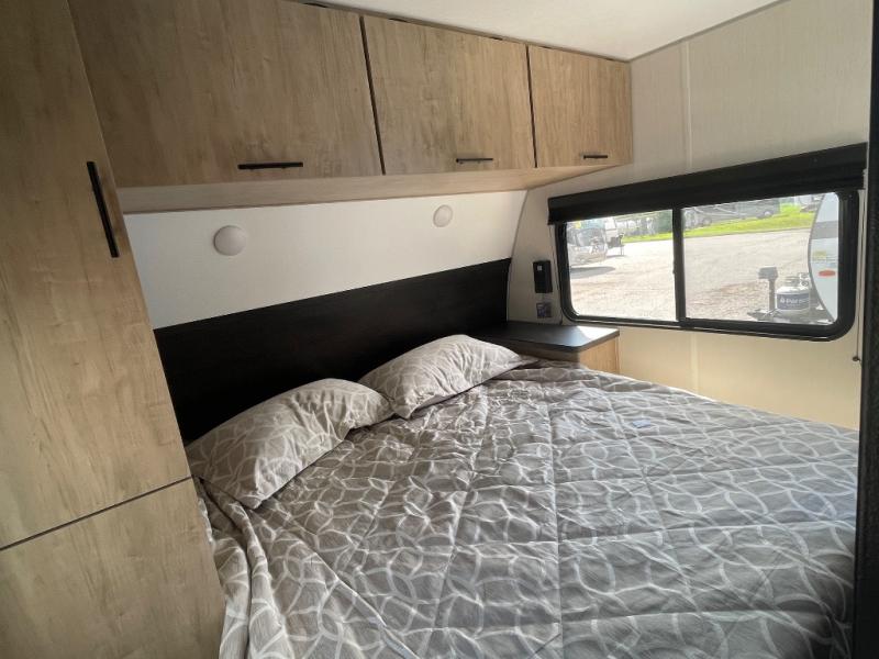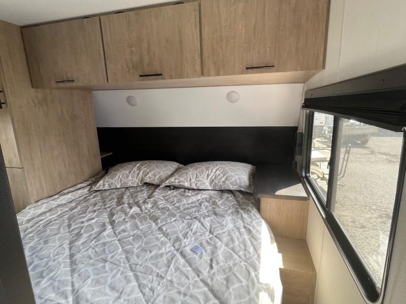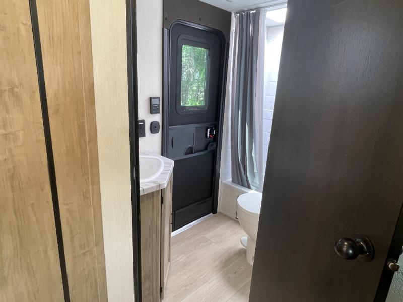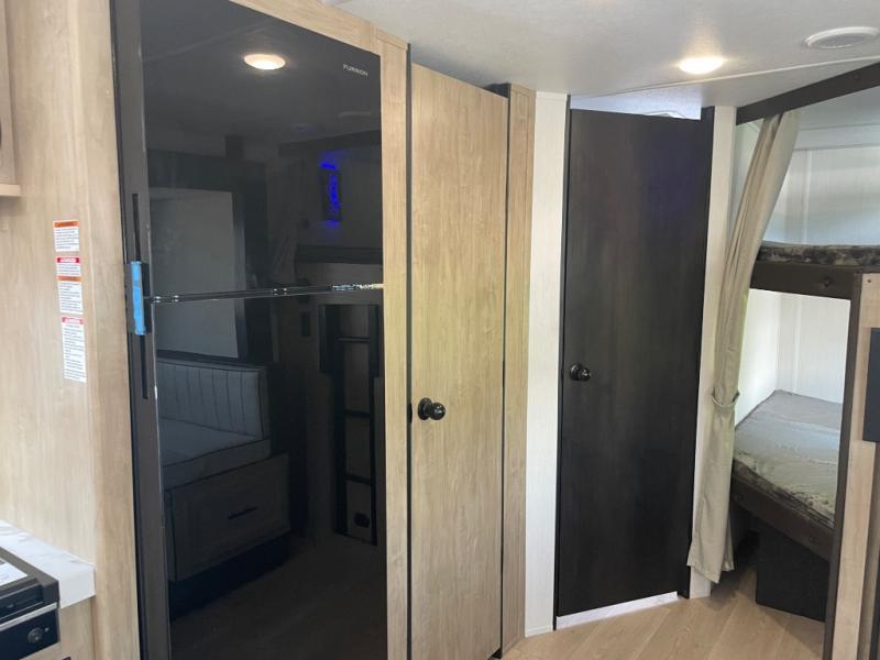 Come on inside this Cherokee Grey Wolf travel trailer and experience the convenience of a smooth flow of traffic in and out with two entry doors. The rear door leads into a full bath which is great for accessibility. Once inside, you will notice the large U-shaped dinette and the sofa which sit on the slide and create a spacious footprint for moving about, as well as great places to play games and socialize with your friends and family. A walk-in pantry provides plenty of storage allowing you to stock up on your favorite snacks and dry goods for your family adventure. At night, there is sleeping space for everyone between the double-size bunks and the RV king bed, plus the furniture.