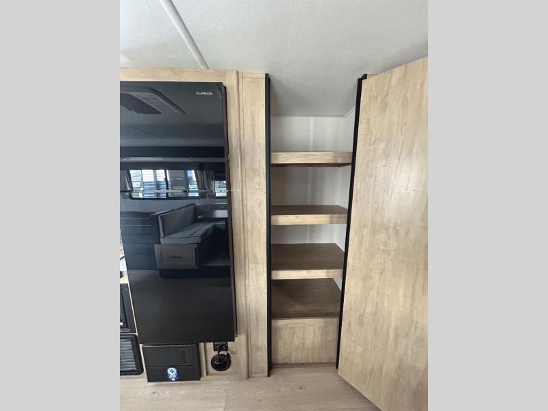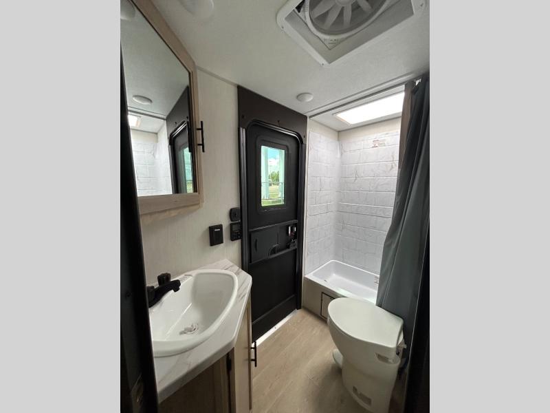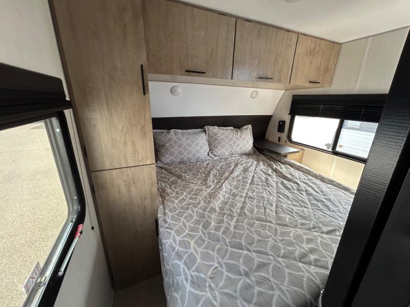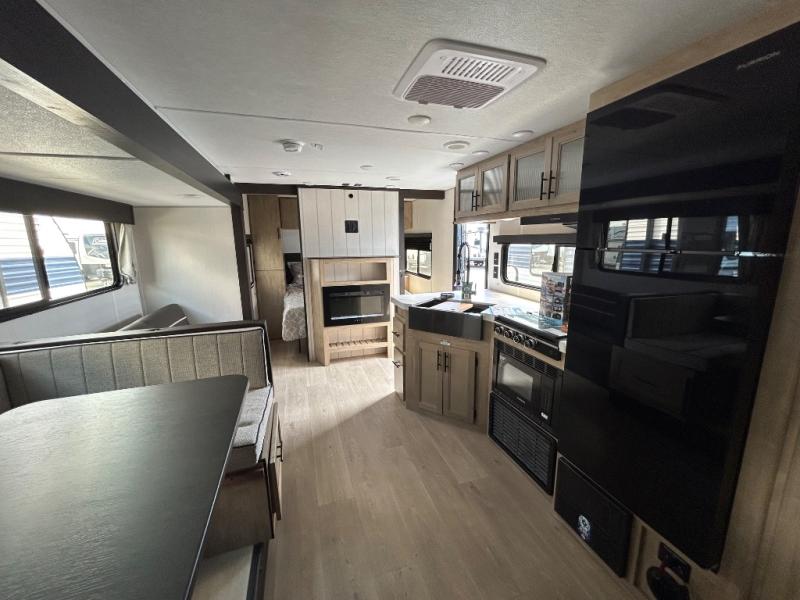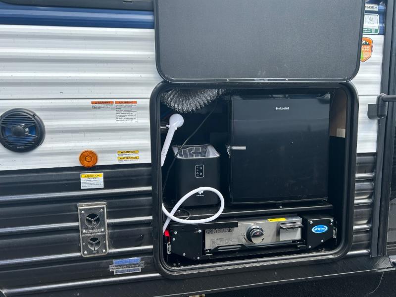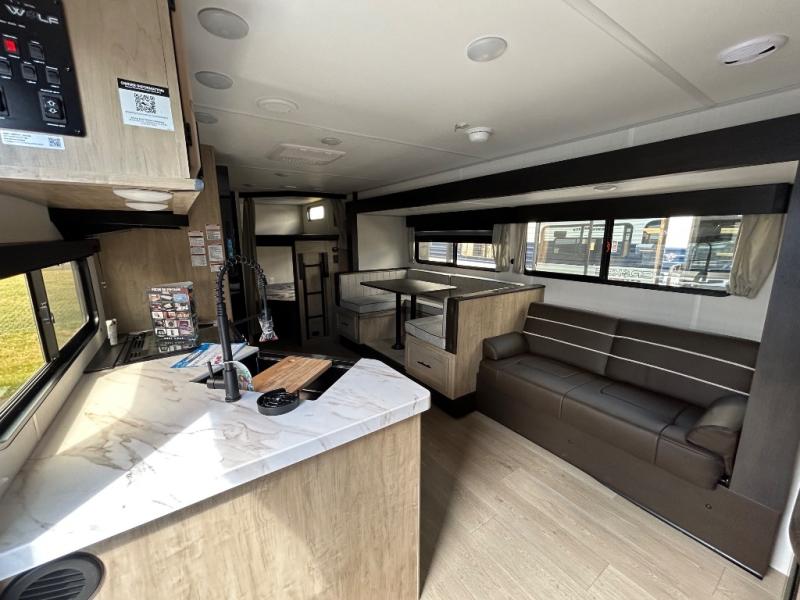 Come on inside this Cherokee Grey Wolf travel trailer and experience the convenience of a smooth flow of traffic in and out with two entry doors. The rear door leads into a full bath which is great for accessibility. Once inside, you will notice the large U-shaped dinette and the sofa which sit on the slide and create a spacious footprint for moving about, as well as great places to play games and socialize with your friends and family. A walk-in pantry provides plenty of storage allowing you to stock up on your favorite snacks and dry goods for your family adventure. At night, there is sleeping space for everyone between the double-size bunks and the RV king bed, plus the furniture.