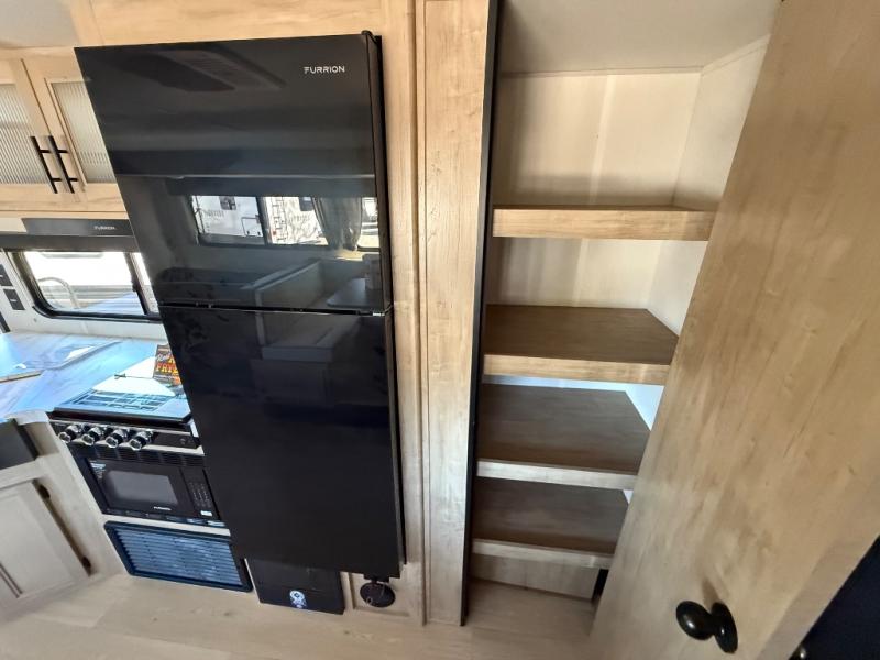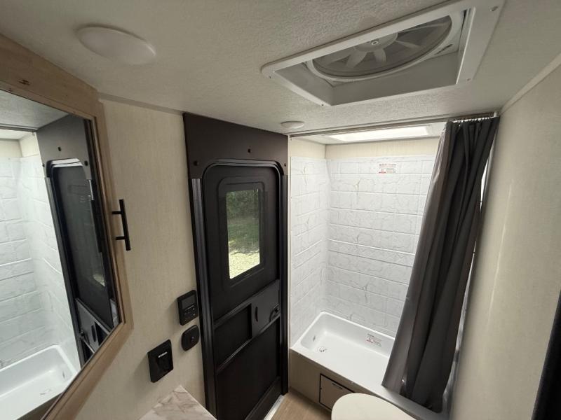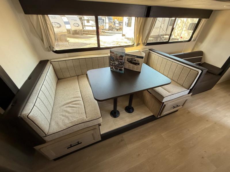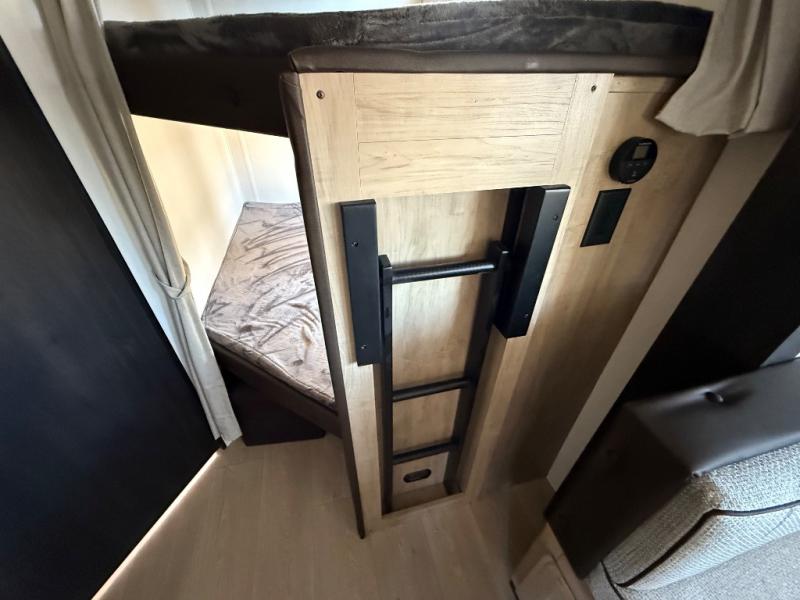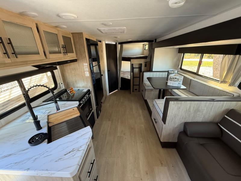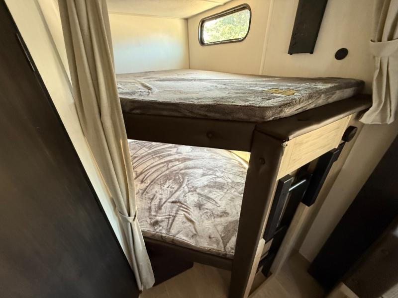 Come on inside this Cherokee Grey Wolf travel trailer and experience the convenience of a smooth flow of traffic in and out with two entry doors. The rear door leads into a full bath which is great for accessibility. Once inside, you will notice the large U-shaped dinette and the sofa which sit on the slide and create a spacious footprint for moving about, as well as great places to play games and socialize with your friends and family. A walk-in pantry provides plenty of storage allowing you to stock up on your favorite snacks and dry goods for your family adventure. At night, there is sleeping space for everyone between the double-size bunks and the RV king bed, plus the furniture.