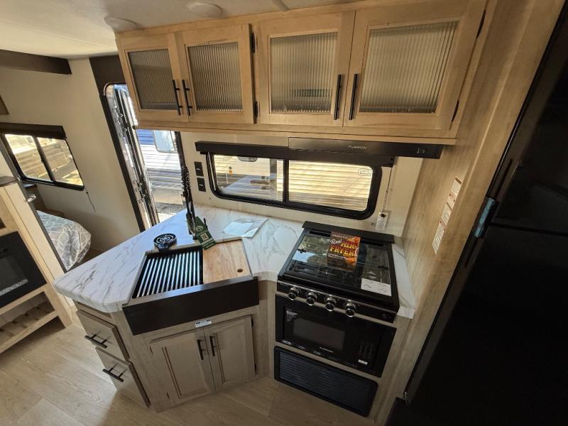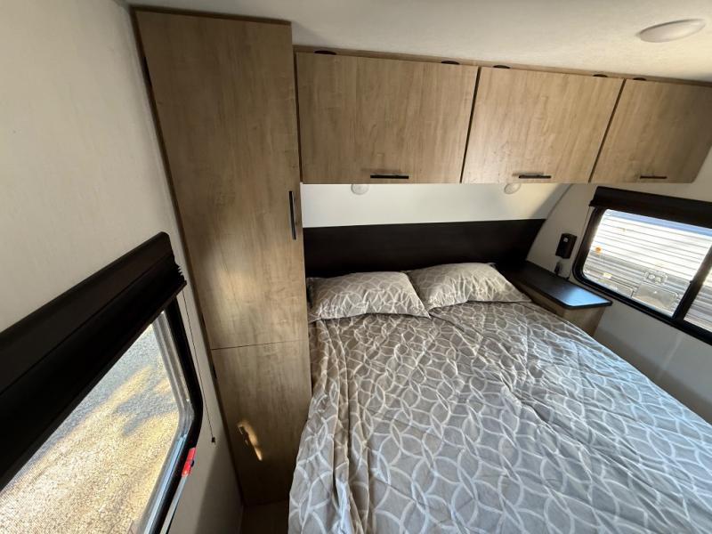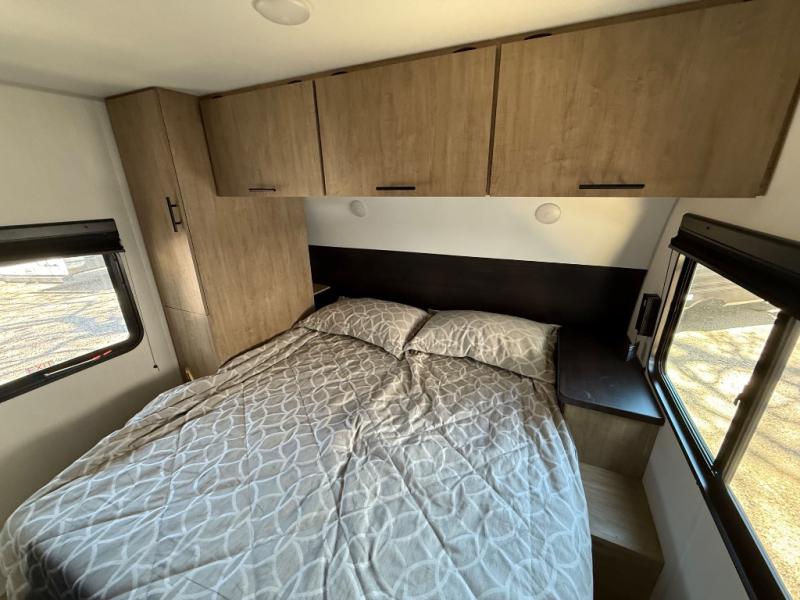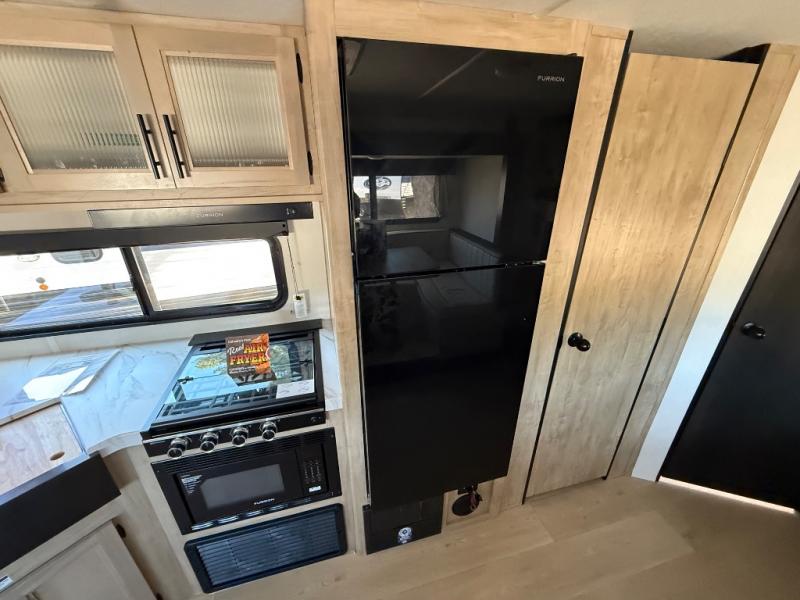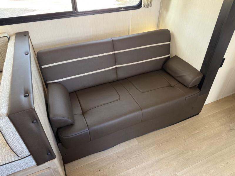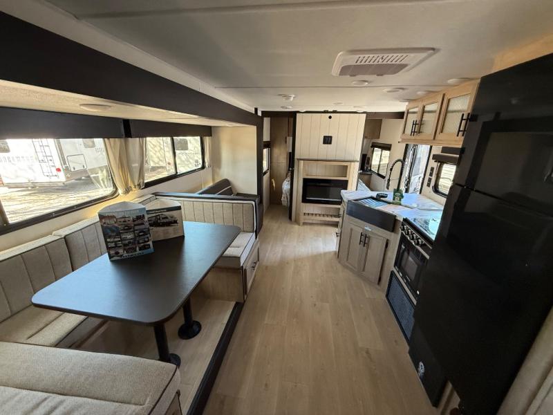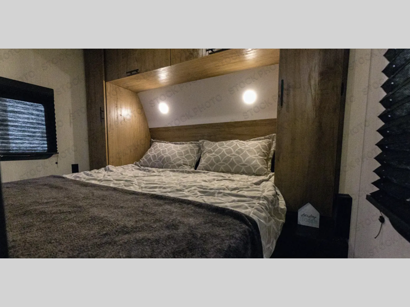 Come on inside this Cherokee Grey Wolf travel trailer and experience the convenience of a smooth flow of traffic in and out with two entry doors. The rear door leads into a full bath which is great for accessibility. Once inside, you will notice the large U-shaped dinette and the sofa which sit on the slide and create a spacious footprint for moving about, as well as great places to play games and socialize with your friends and family. A walk-in pantry provides plenty of storage allowing you to stock up on your favorite snacks and dry goods for your family adventure. At night, there is sleeping space for everyone between the double-size bunks and the RV king bed, plus the furniture.