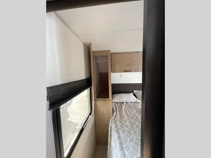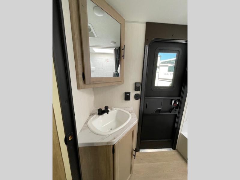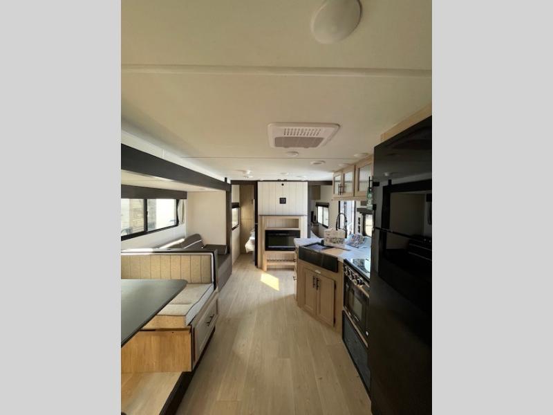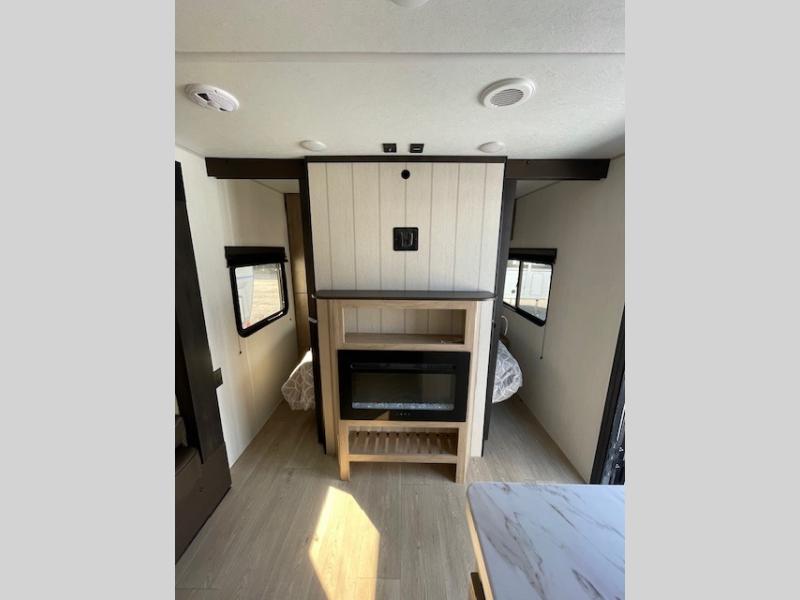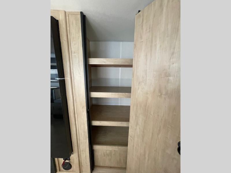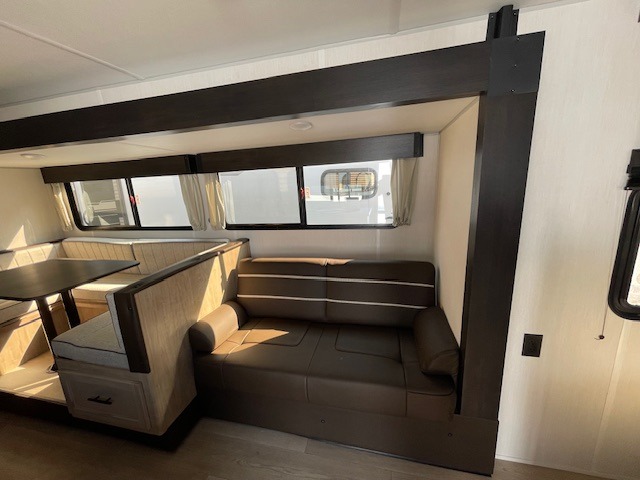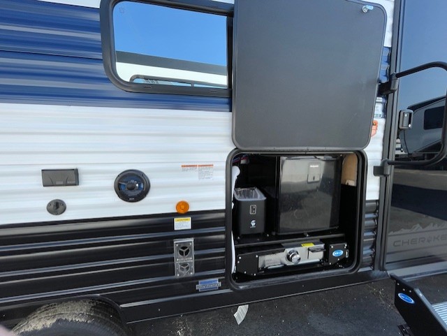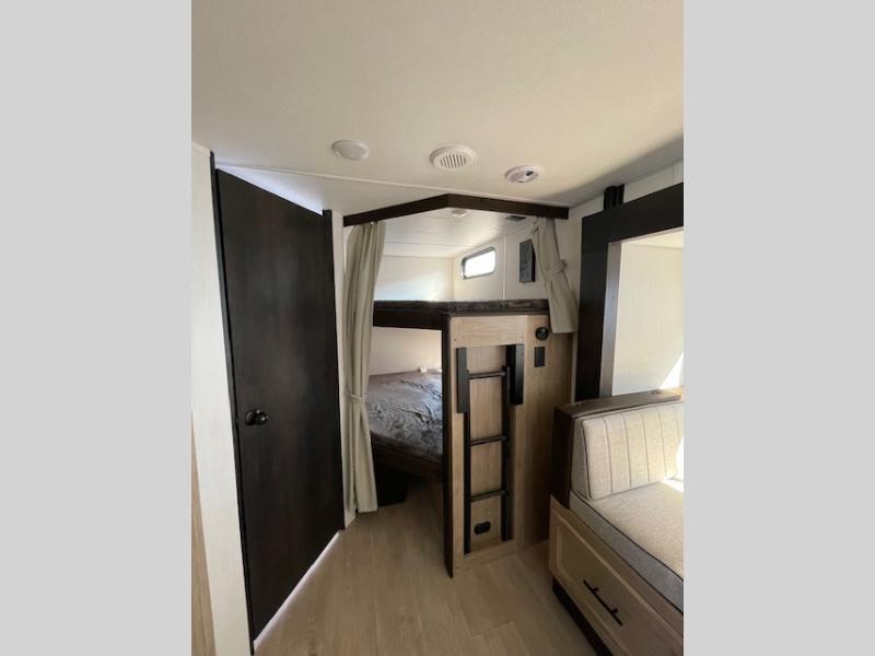 Come on inside this Cherokee Grey Wolf travel trailer and experience the convenience of a smooth flow of traffic in and out with two entry doors. The rear door leads into a full bath which is great for accessibility. Once inside, you will notice the large U-shaped dinette and the sofa which sit on the slide and create a spacious footprint for moving about, as well as great places to play games and socialize with your friends and family. A walk-in pantry provides plenty of storage allowing you to stock up on your favorite snacks and dry goods for your family adventure. At night, there is sleeping space for everyone between the double-size bunks and the RV king bed, plus the furniture.