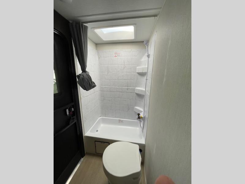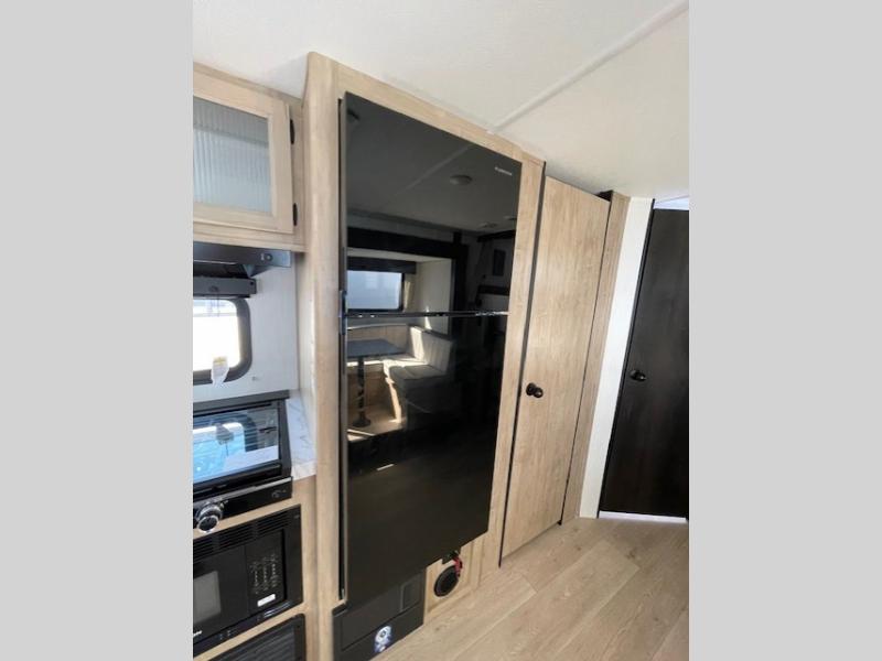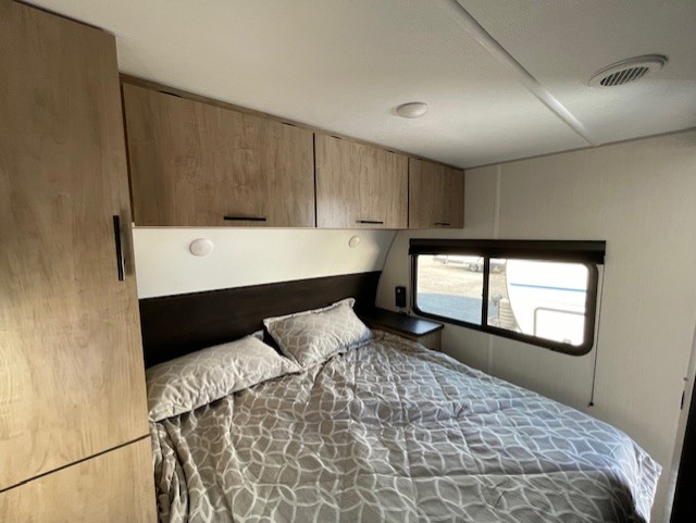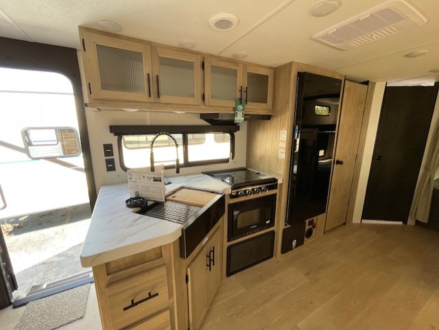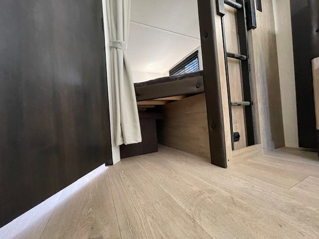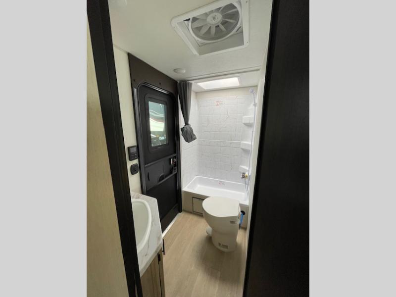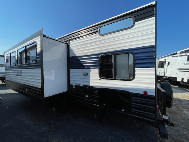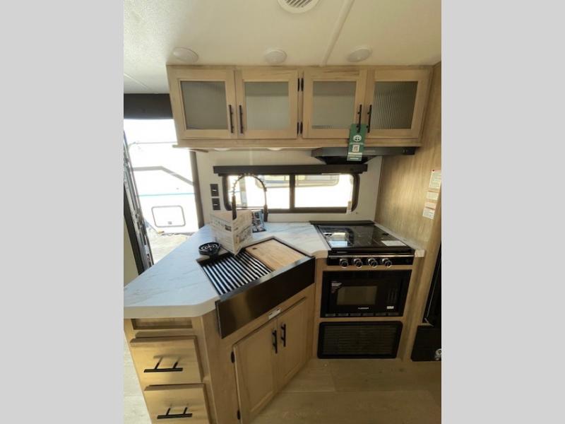 Come on inside this Cherokee Grey Wolf travel trailer and experience the convenience of a smooth flow of traffic in and out with two entry doors. The rear door leads into a full bath which is great for accessibility. Once inside, you will notice the large U-shaped dinette and the sofa which sit on the slide and create a spacious footprint for moving about, as well as great places to play games and socialize with your friends and family. A walk-in pantry provides plenty of storage allowing you to stock up on your favorite snacks and dry goods for your family adventure. At night, there is sleeping space for everyone between the double-size bunks and the RV king bed, plus the furniture.