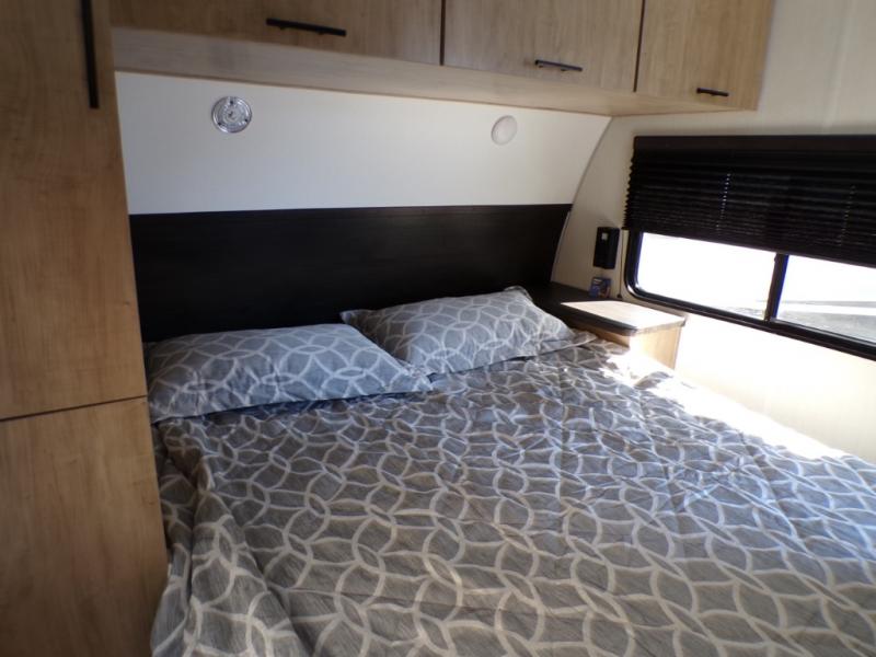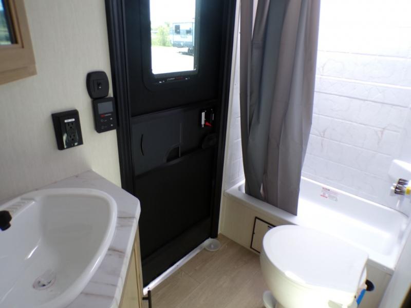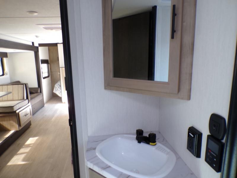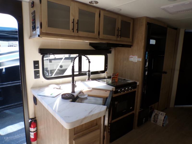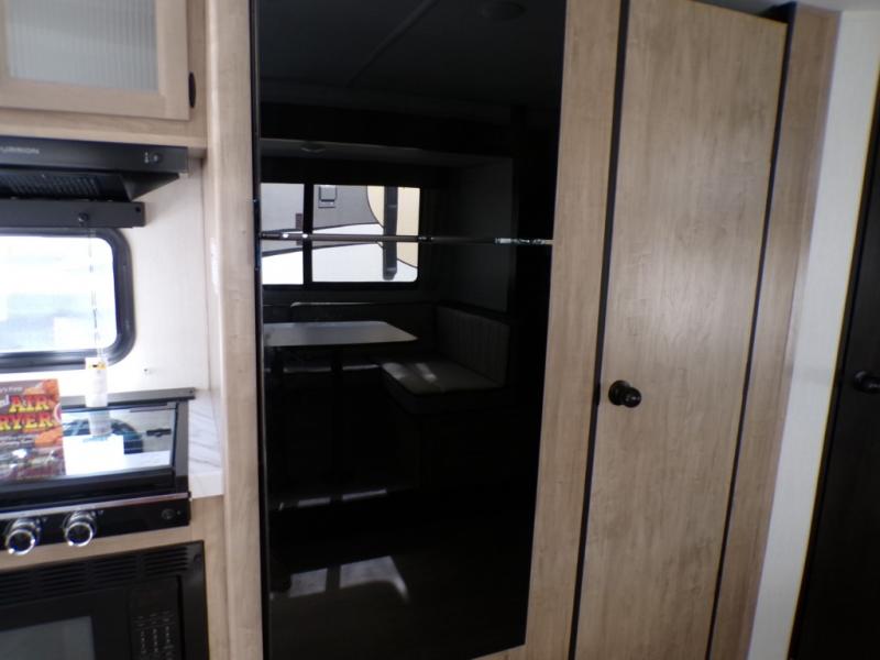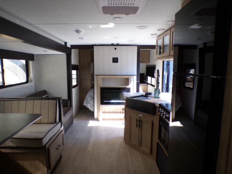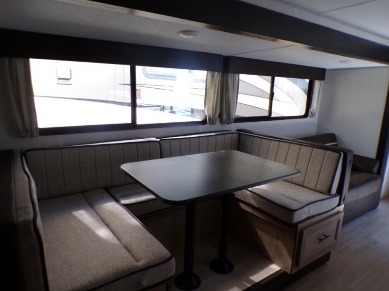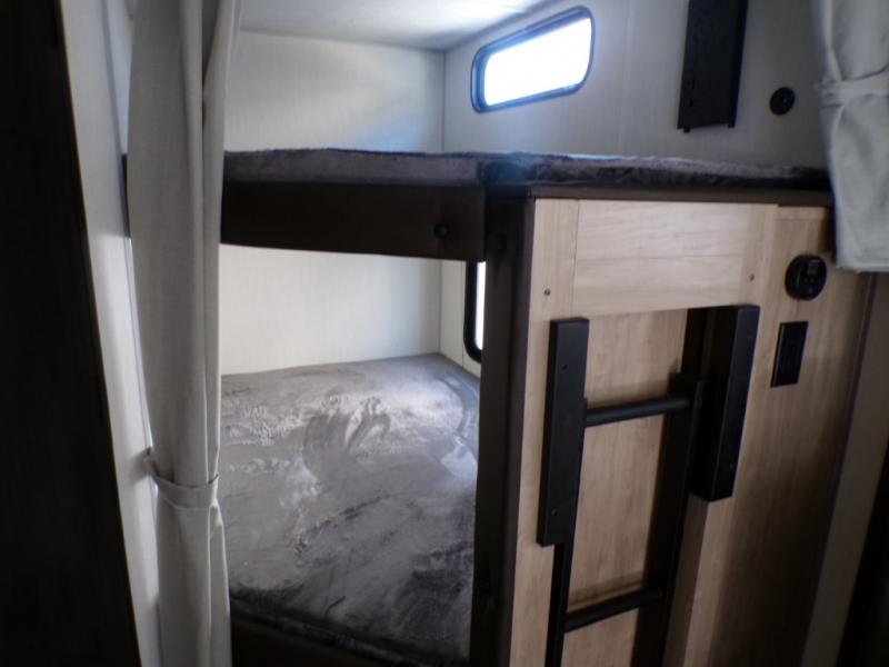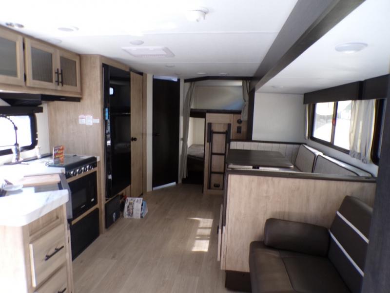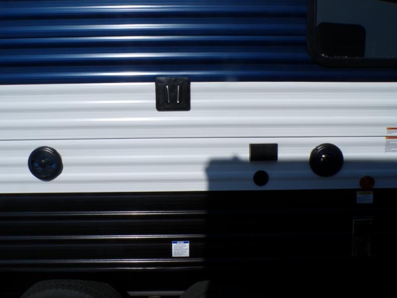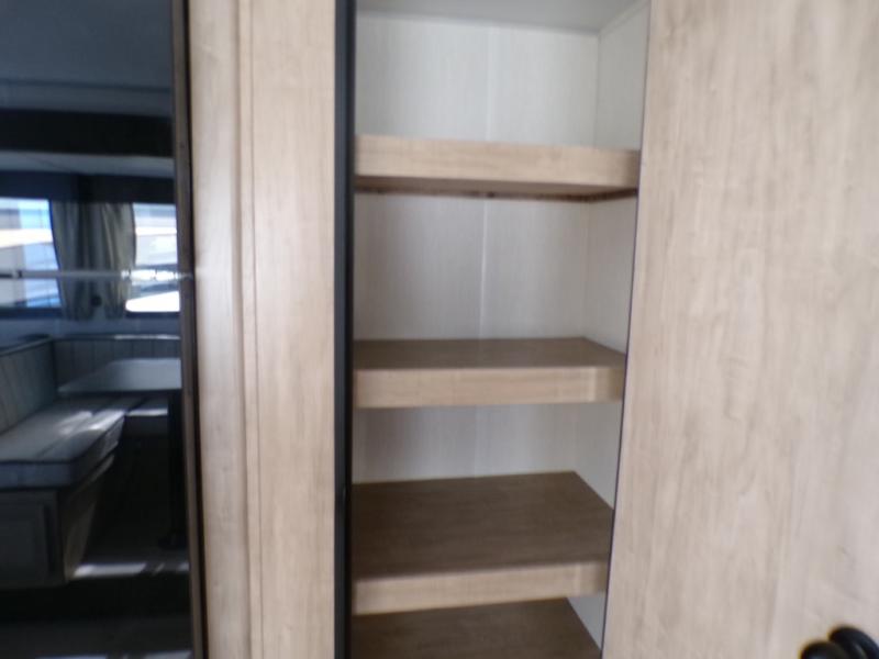 Come on inside this Cherokee Grey Wolf travel trailer and experience the convenience of a smooth flow of traffic in and out with two entry doors. The rear door leads into a full bath which is great for accessibility. Once inside, you will notice the large U-shaped dinette and the sofa which sit on the slide and create a spacious footprint for moving about, as well as great places to play games and socialize with your friends and family. A walk-in pantry provides plenty of storage allowing you to stock up on your favorite snacks and dry goods for your family adventure. At night, there is sleeping space for everyone between the double-size bunks and the RV king bed, plus the furniture.