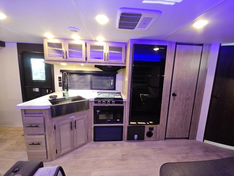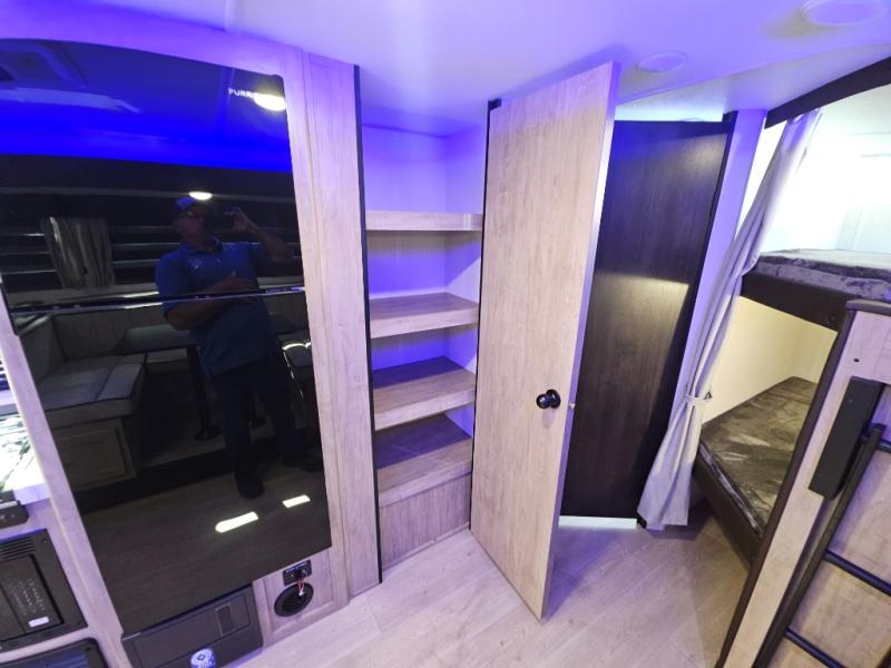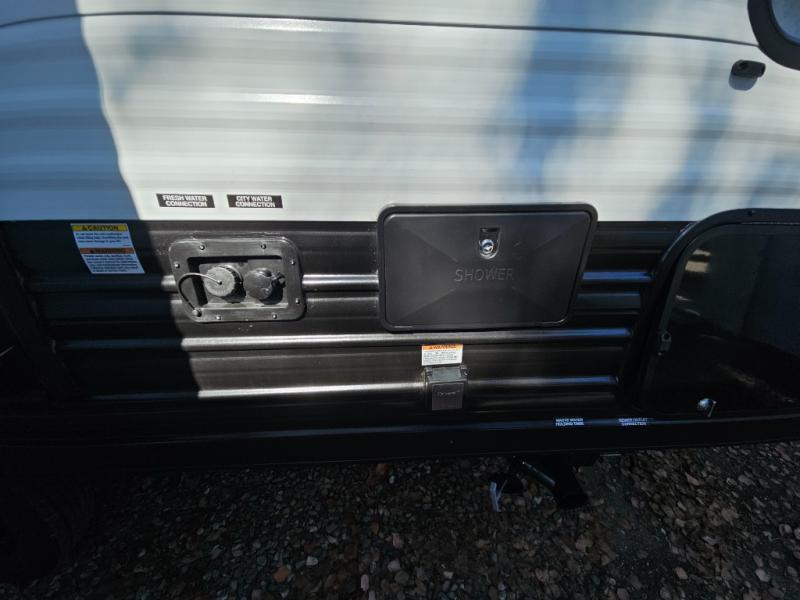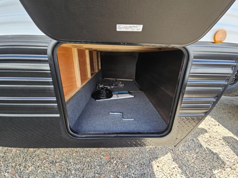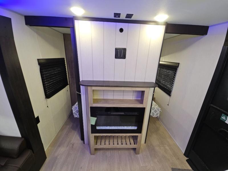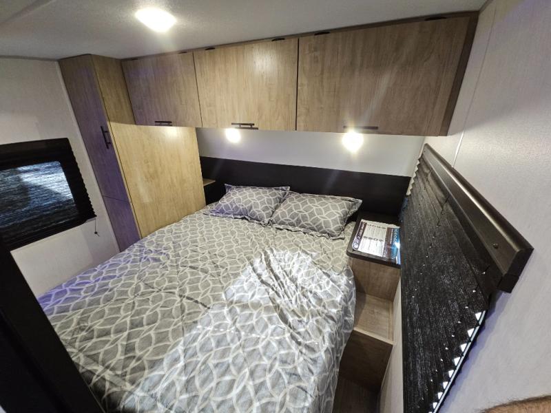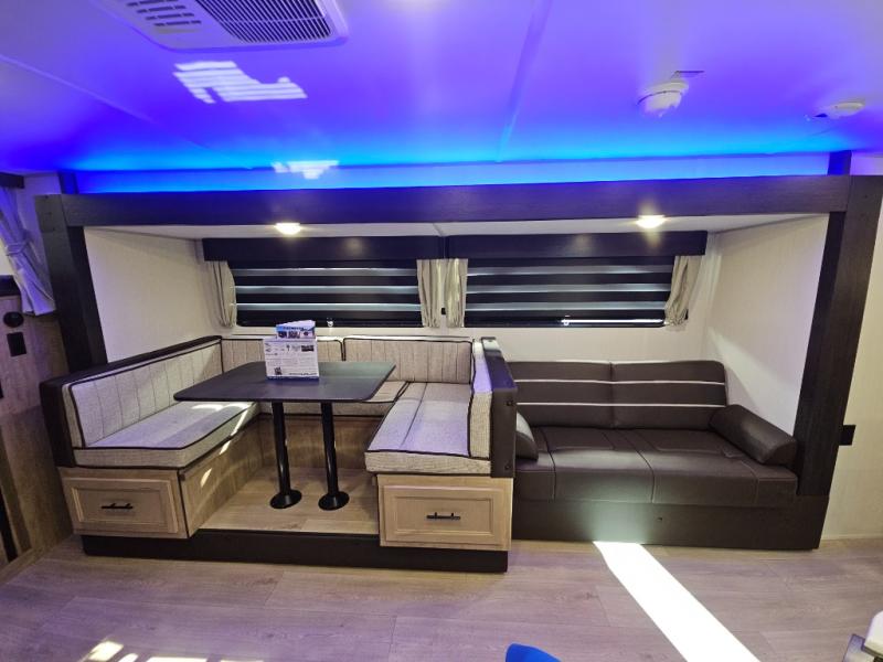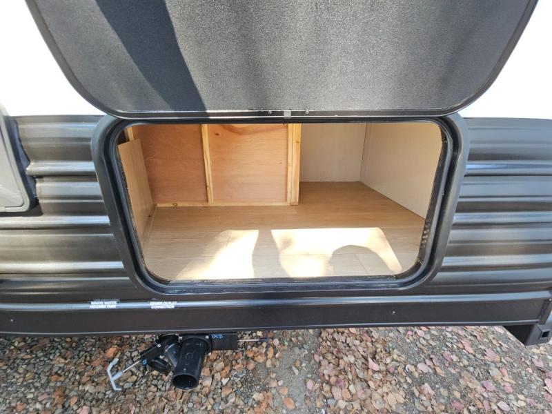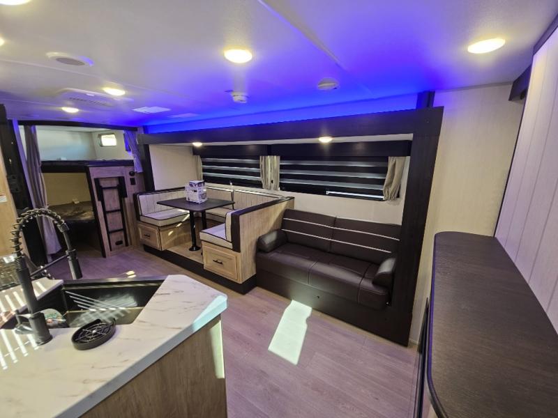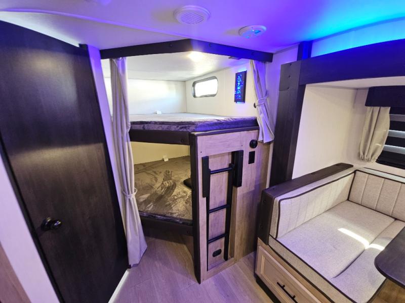 Come on inside this Cherokee Grey Wolf travel trailer and experience the convenience of a smooth flow of traffic in and out with two entry doors. The rear door leads into a full bath which is great for accessibility. Once inside, you will notice the large U-shaped dinette and the sofa which sit on the slide and create a spacious footprint for moving about, as well as great places to play games and socialize with your friends and family. A walk-in pantry provides plenty of storage allowing you to stock up on your favorite snacks and dry goods for your family adventure. At night, there is sleeping space for everyone between the double-size bunks and the RV king bed, plus the furniture.
