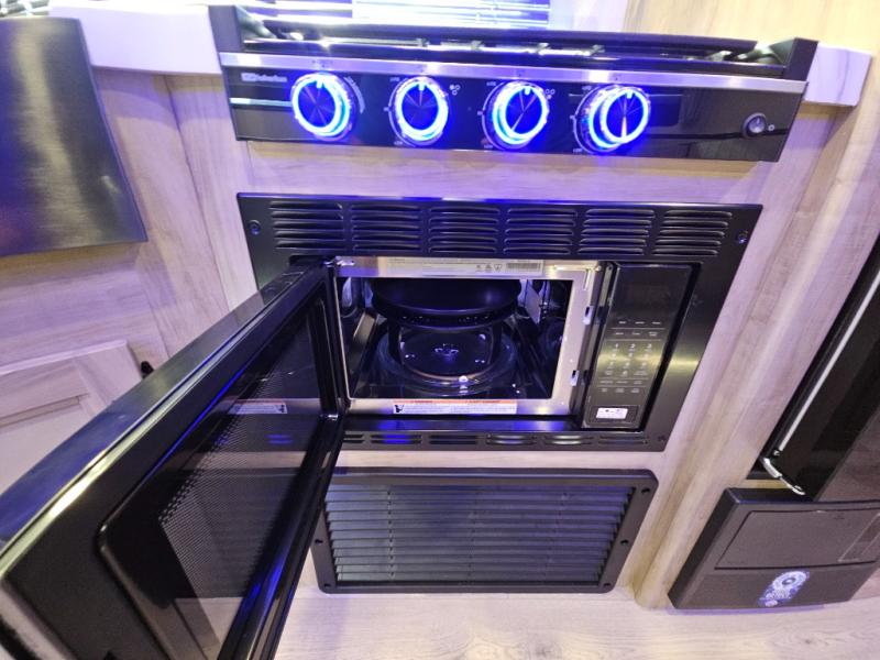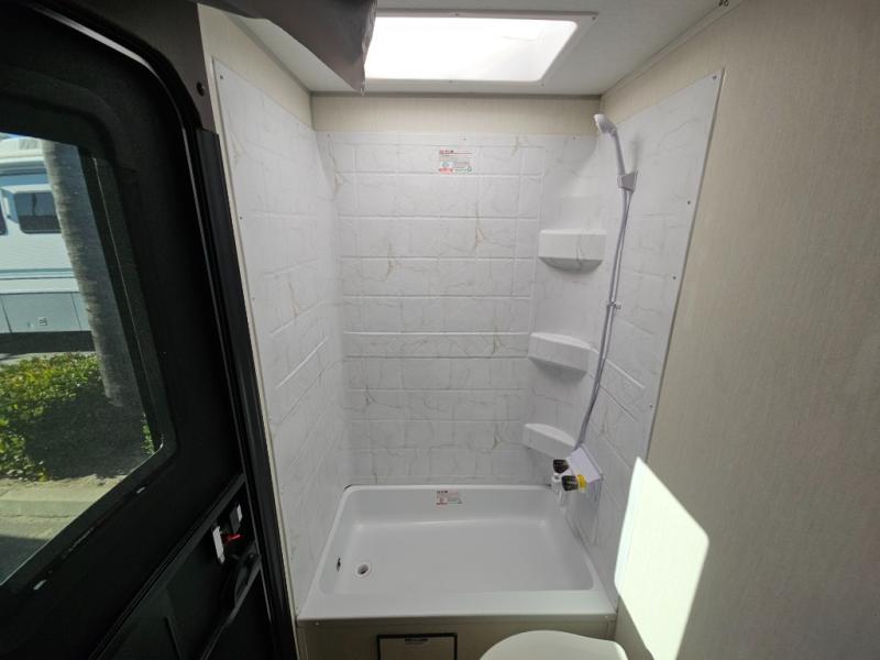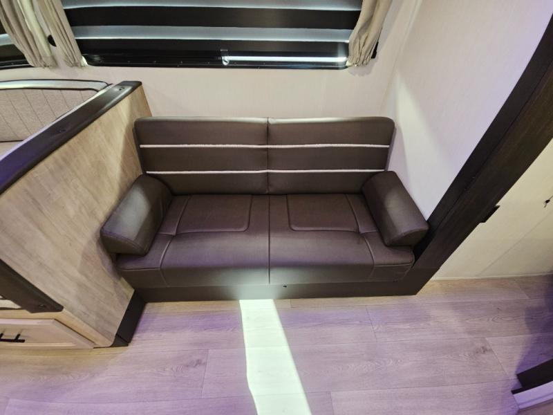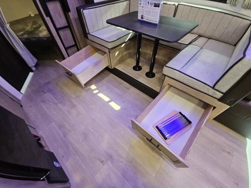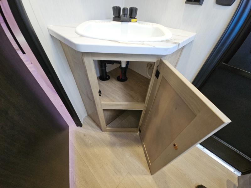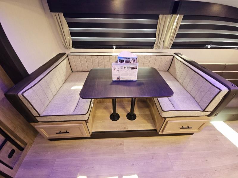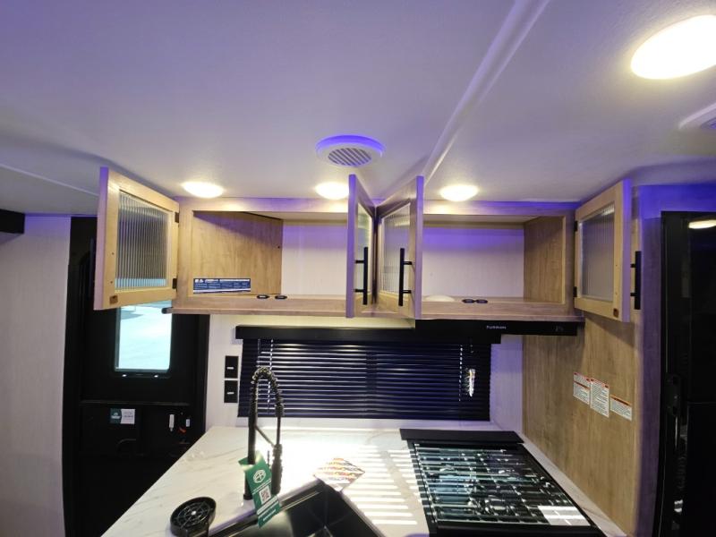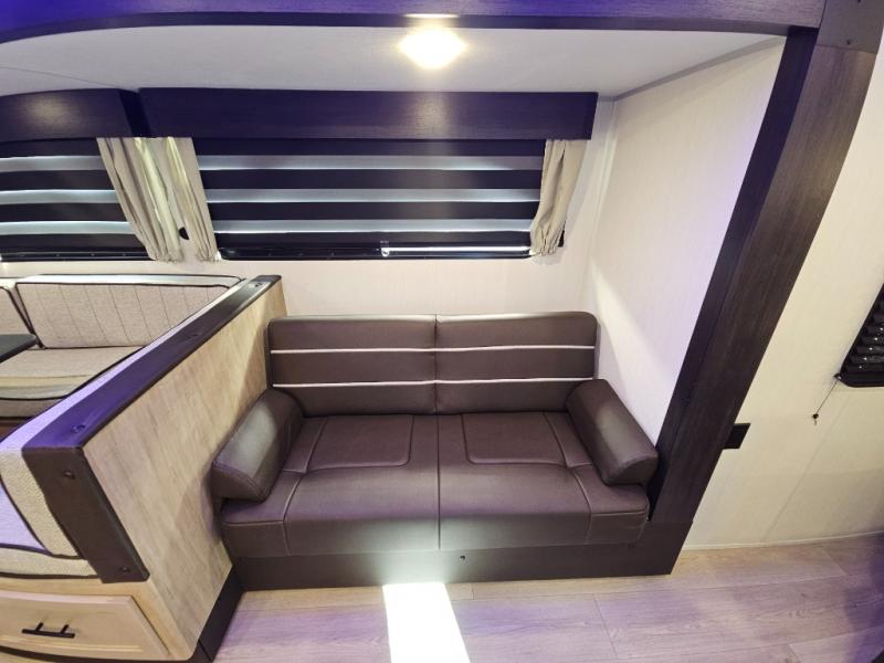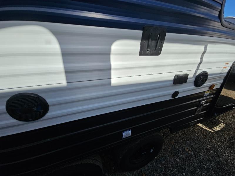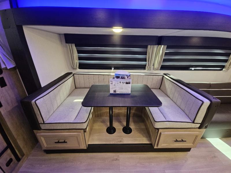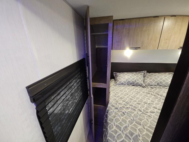 Come on inside this Cherokee Grey Wolf travel trailer and experience the convenience of a smooth flow of traffic in and out with two entry doors. The rear door leads into a full bath which is great for accessibility. Once inside, you will notice the large U-shaped dinette and the sofa which sit on the slide and create a spacious footprint for moving about, as well as great places to play games and socialize with your friends and family. A walk-in pantry provides plenty of storage allowing you to stock up on your favorite snacks and dry goods for your family adventure. At night, there is sleeping space for everyone between the double-size bunks and the RV king bed, plus the furniture.
