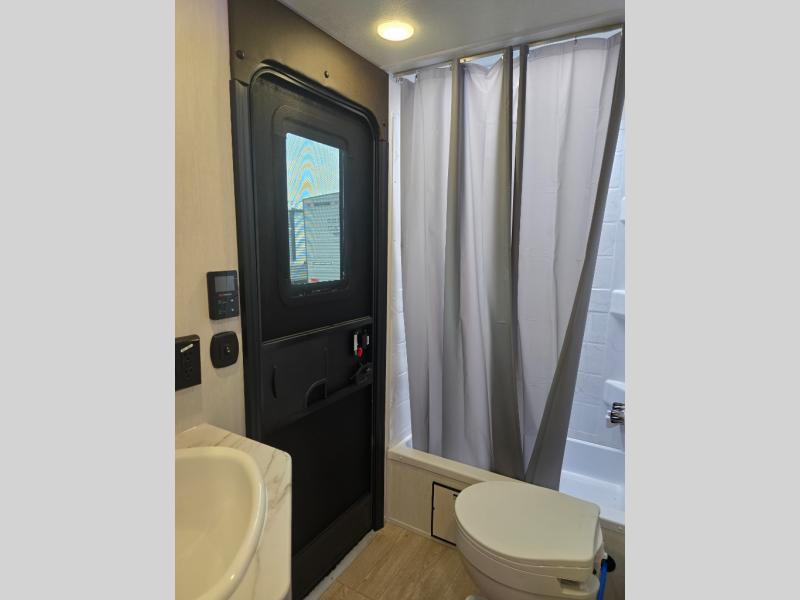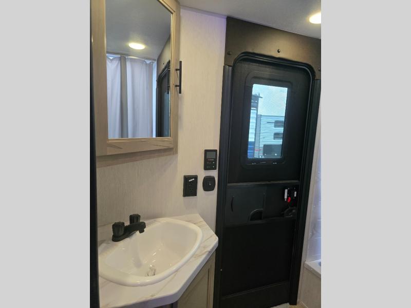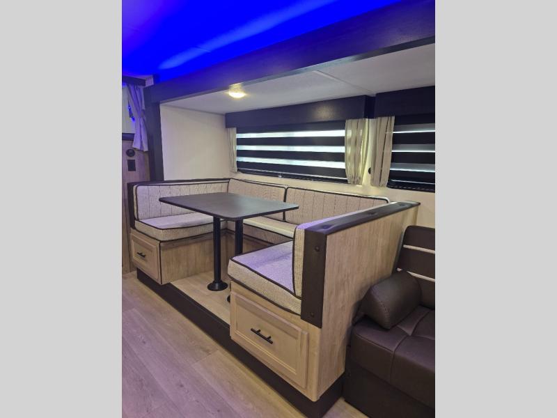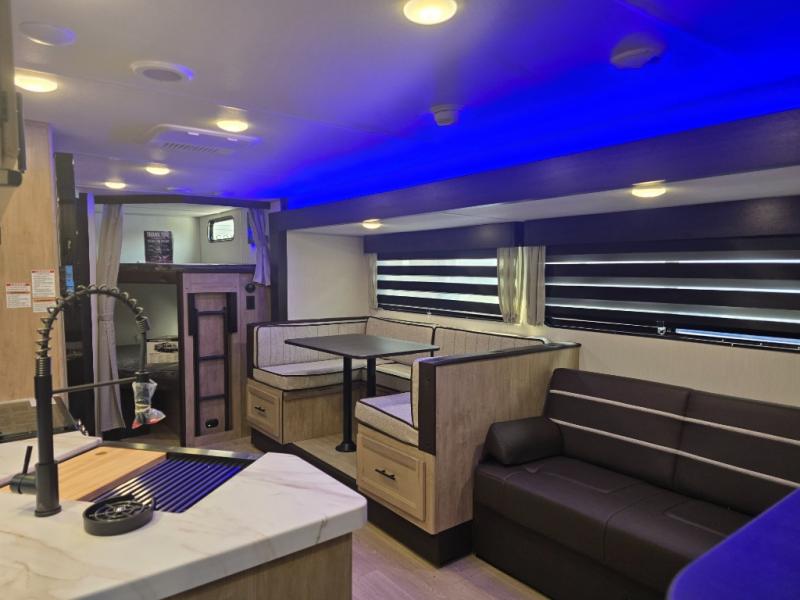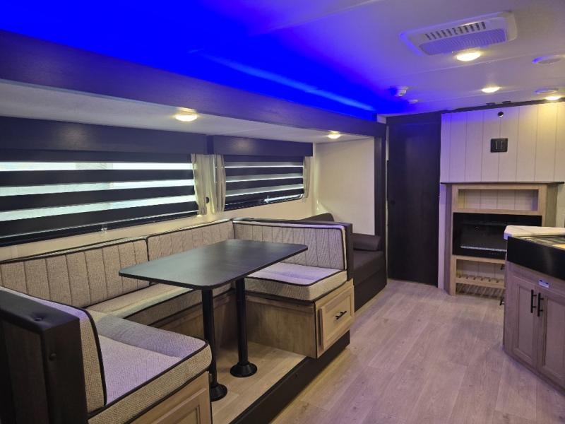 Come on inside this Cherokee Grey Wolf travel trailer and experience the convenience of a smooth flow of traffic in and out with two entry doors. The rear door leads into a full bath which is great for accessibility. Once inside, you will notice the large U-shaped dinette and the sofa which sit on the slide and create a spacious footprint for moving about, as well as great places to play games and socialize with your friends and family. A walk-in pantry provides plenty of storage allowing you to stock up on your favorite snacks and dry goods for your family adventure. At night, there is sleeping space for everyone between the double-size bunks and the RV king bed, plus the furniture.