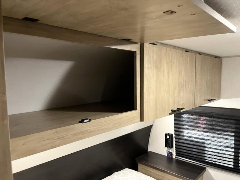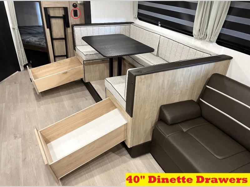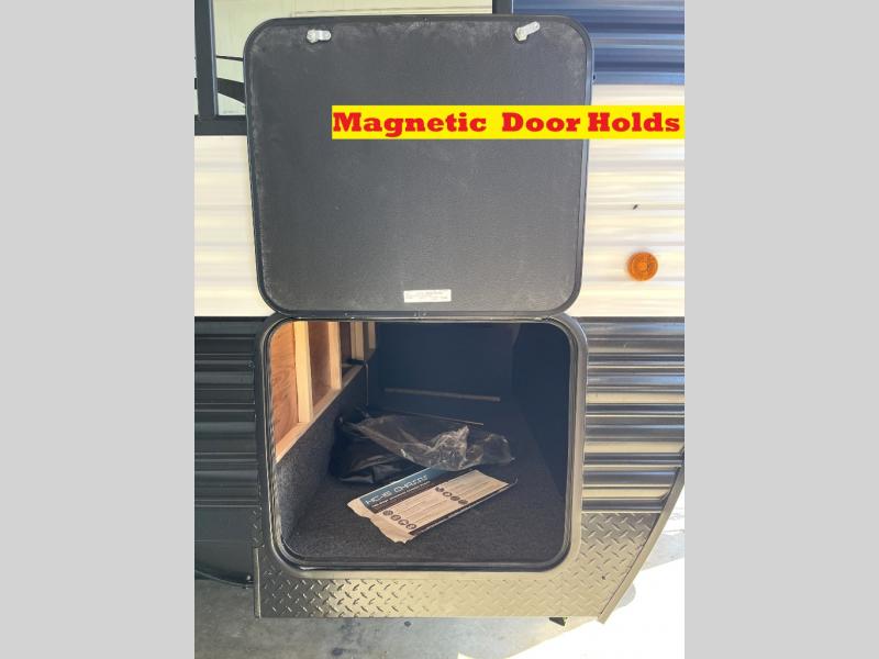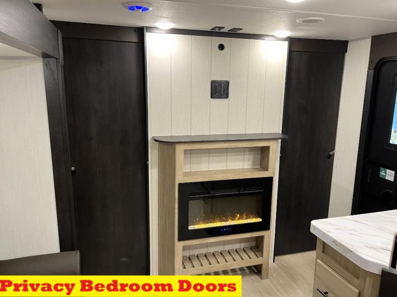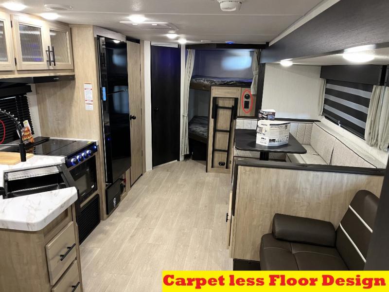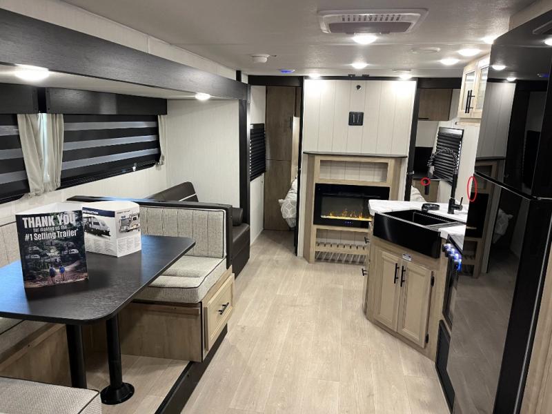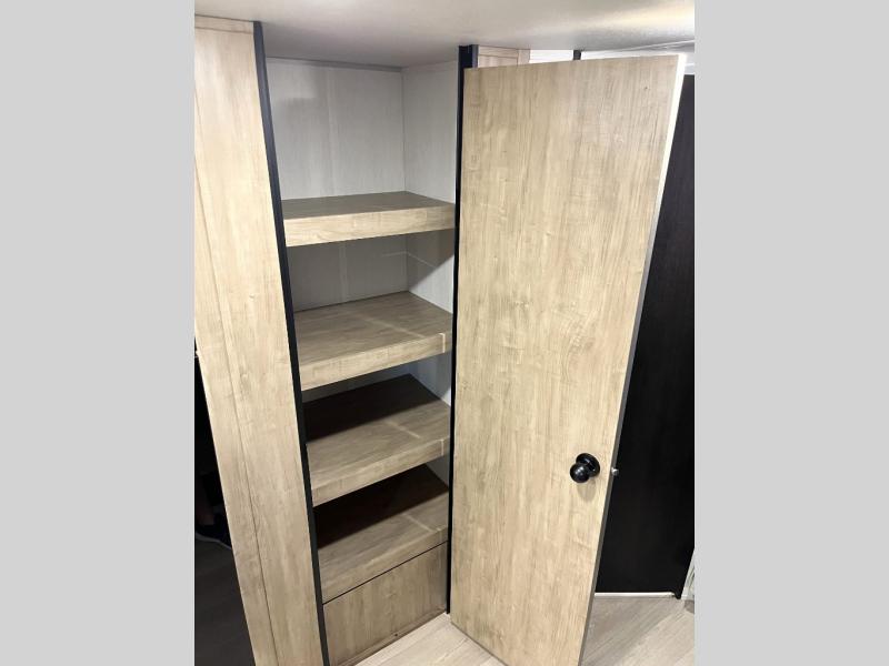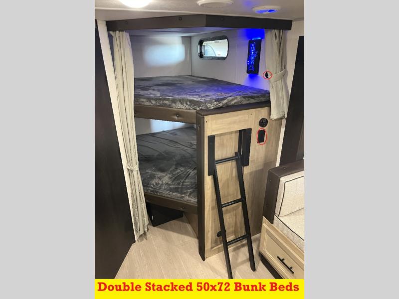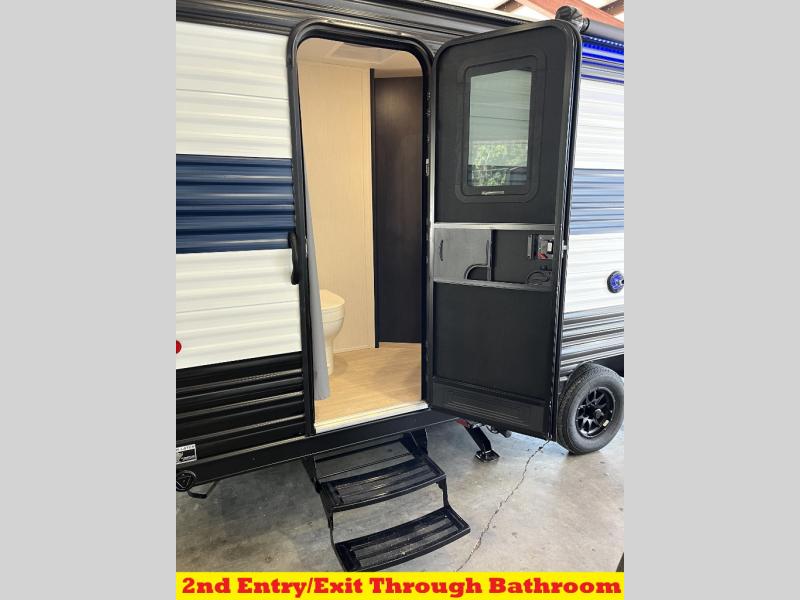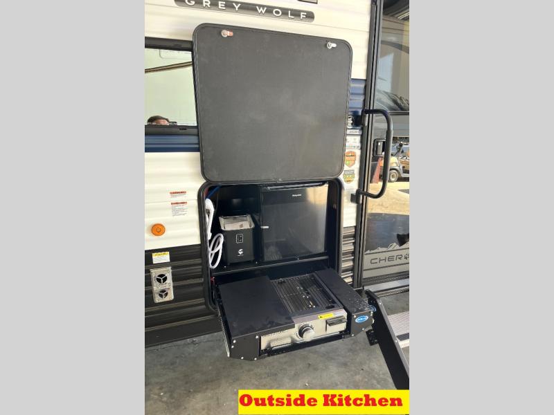 Come on inside this Cherokee Grey Wolf travel trailer and experience the convenience of a smooth flow of traffic in and out with two entry doors. The rear door leads into a full bath which is great for accessibility. Once inside, you will notice the large U-shaped dinette and the sofa which sit on the slide and create a spacious footprint for moving about, as well as great places to play games and socialize with your friends and family. A walk-in pantry provides plenty of storage allowing you to stock up on your favorite snacks and dry goods for your family adventure. At night, there is sleeping space for everyone between the double-size bunks and the RV king bed, plus the furniture.