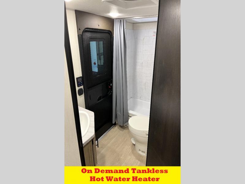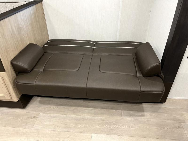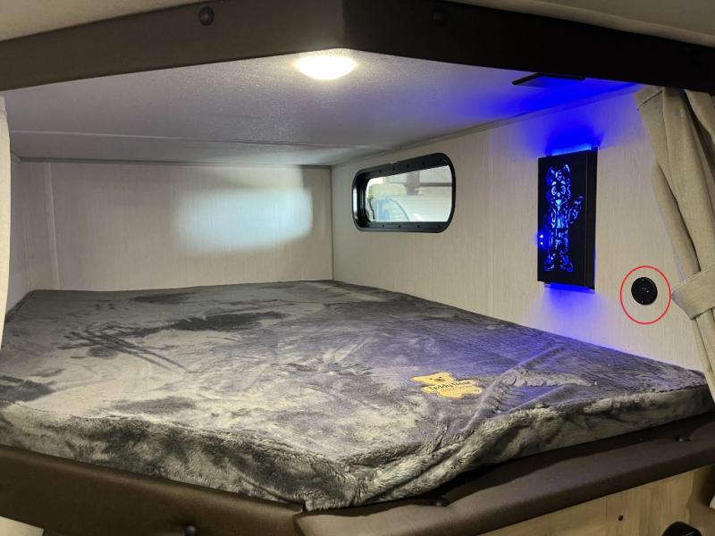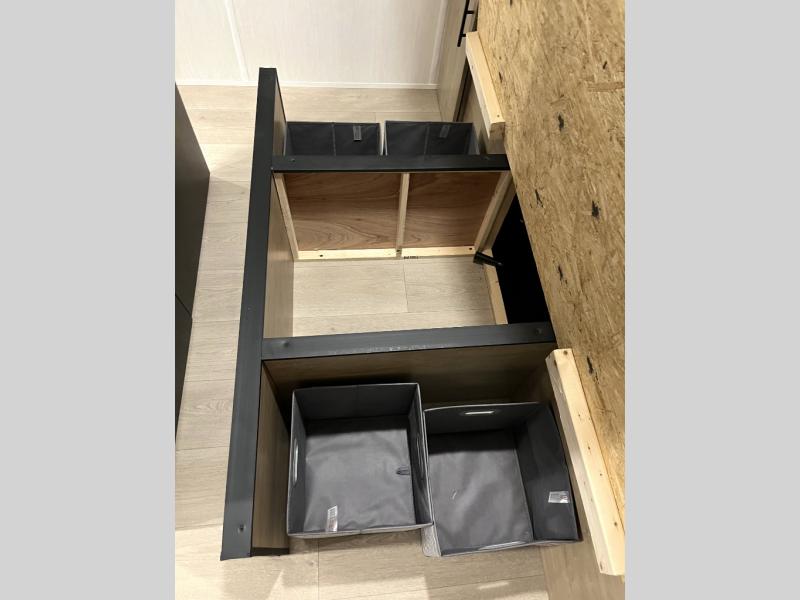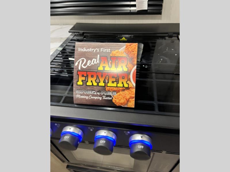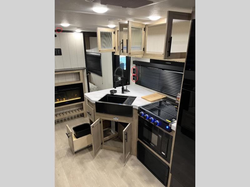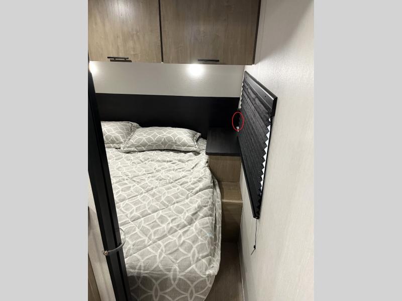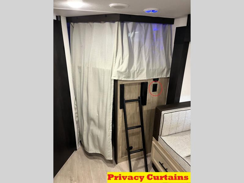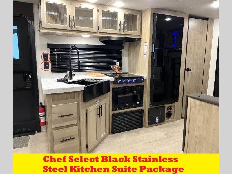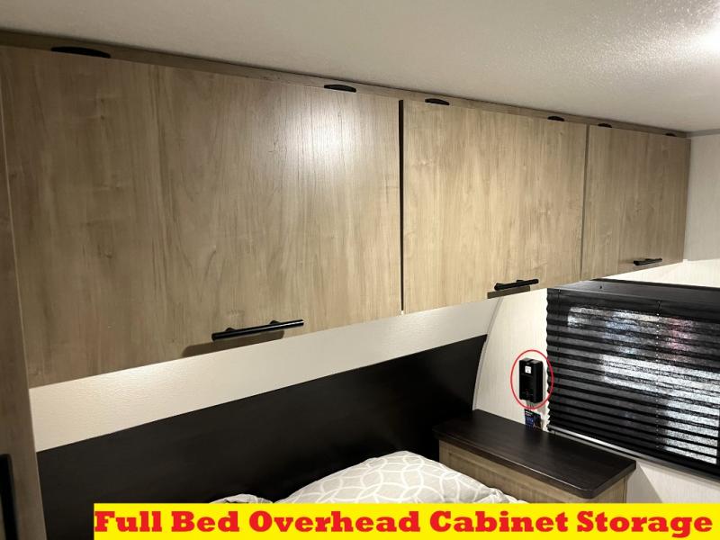 Come on inside this Cherokee Grey Wolf travel trailer and experience the convenience of a smooth flow of traffic in and out with two entry doors. The rear door leads into a full bath which is great for accessibility. Once inside, you will notice the large U-shaped dinette and the sofa which sit on the slide and create a spacious footprint for moving about, as well as great places to play games and socialize with your friends and family. A walk-in pantry provides plenty of storage allowing you to stock up on your favorite snacks and dry goods for your family adventure. At night, there is sleeping space for everyone between the double-size bunks and the RV king bed, plus the furniture.