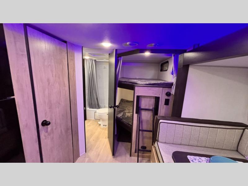 Come on inside this Cherokee Grey Wolf travel trailer and experience the convenience of a smooth flow of traffic in and out with two entry doors. The rear door leads into a full bath which is great for accessibility. Once inside, you will notice the large U-shaped dinette and the sofa which sit on the slide and create a spacious footprint for moving about, as well as great places to play games and socialize with your friends and family. A walk-in pantry provides plenty of storage allowing you to stock up on your favorite snacks and dry goods for your family adventure. At night, there is sleeping space for everyone between the double-size bunks and the RV king bed, plus the furniture.