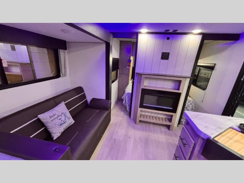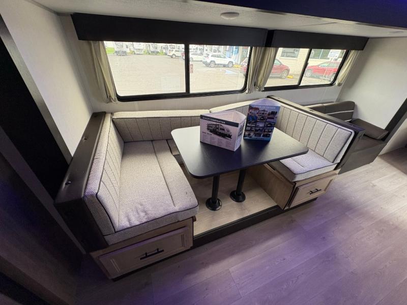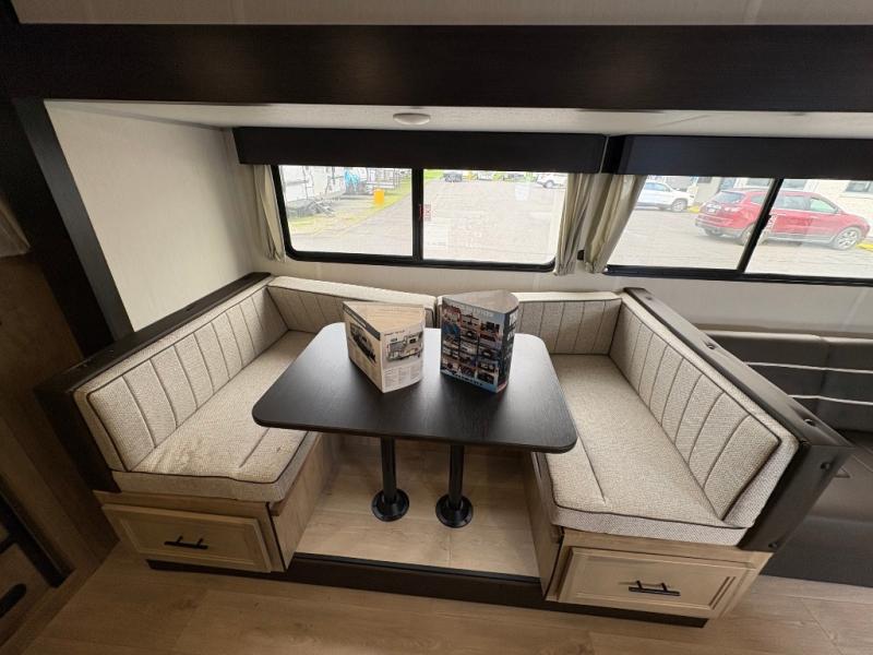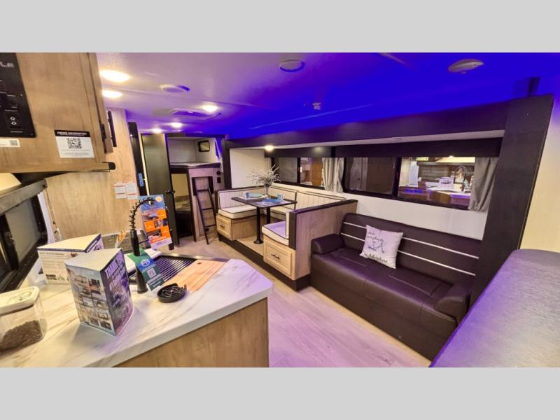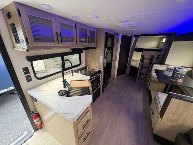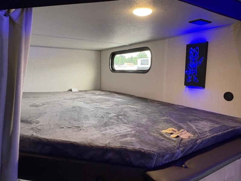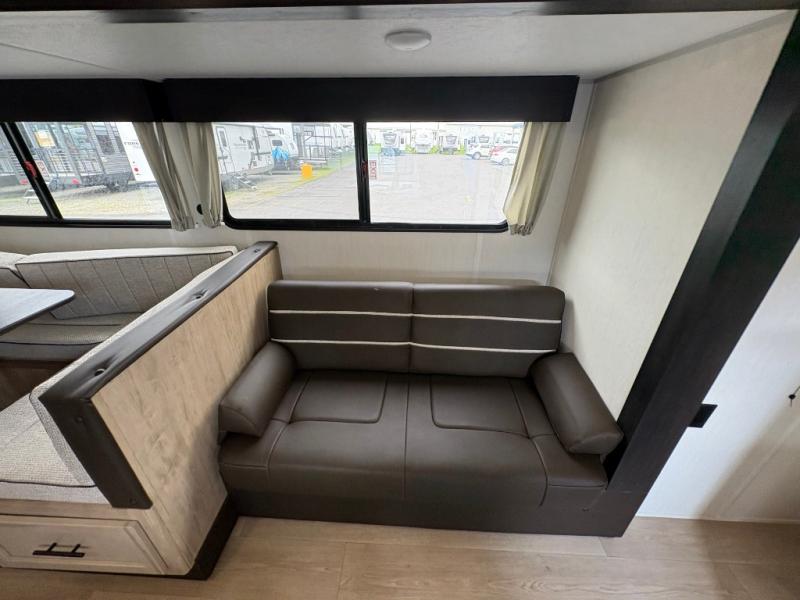 Come on inside this Cherokee Grey Wolf travel trailer and experience the convenience of a smooth flow of traffic in and out with two entry doors. The rear door leads into a full bath which is great for accessibility. Once inside, you will notice the large U-shaped dinette and the sofa which sit on the slide and create a spacious footprint for moving about, as well as great places to play games and socialize with your friends and family. A walk-in pantry provides plenty of storage allowing you to stock up on your favorite snacks and dry goods for your family adventure. At night, there is sleeping space for everyone between the double-size bunks and the RV king bed, plus the furniture.