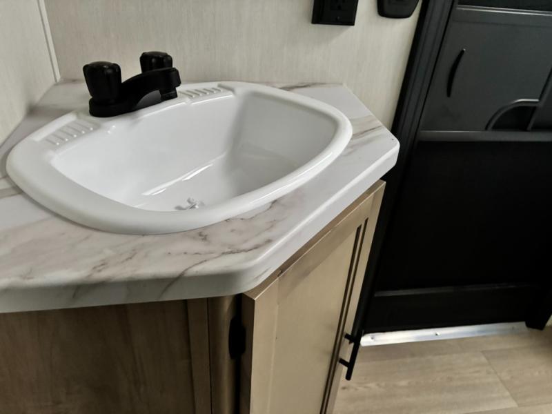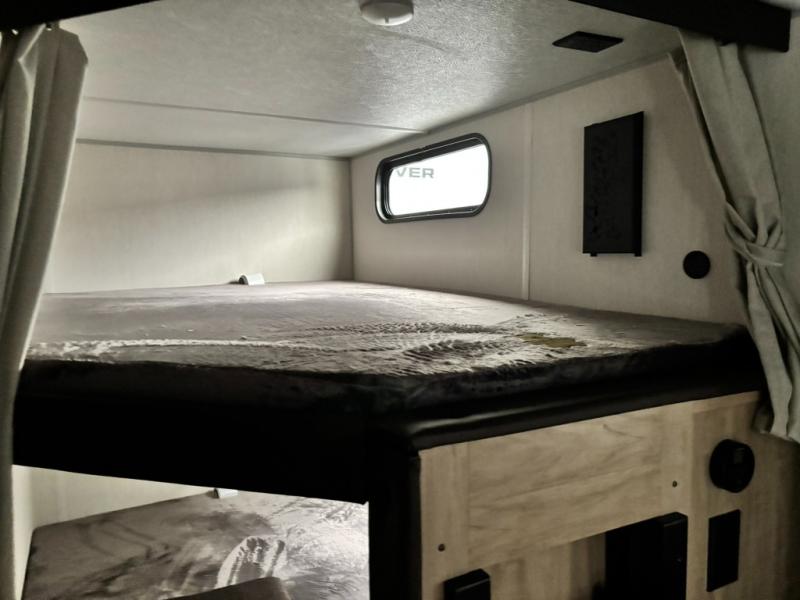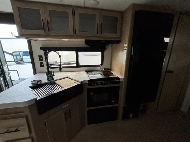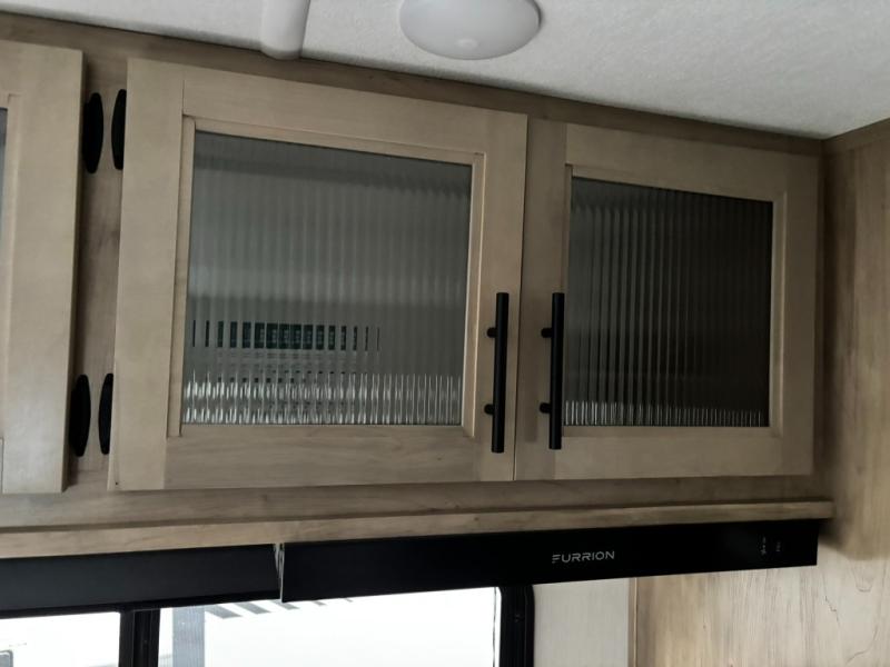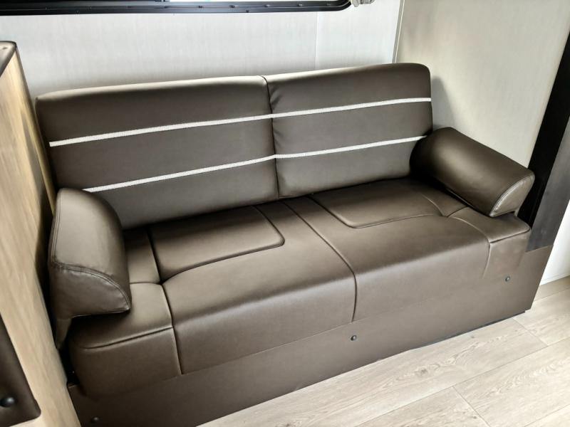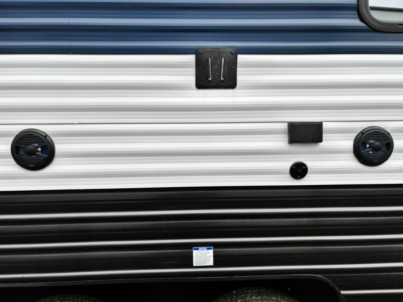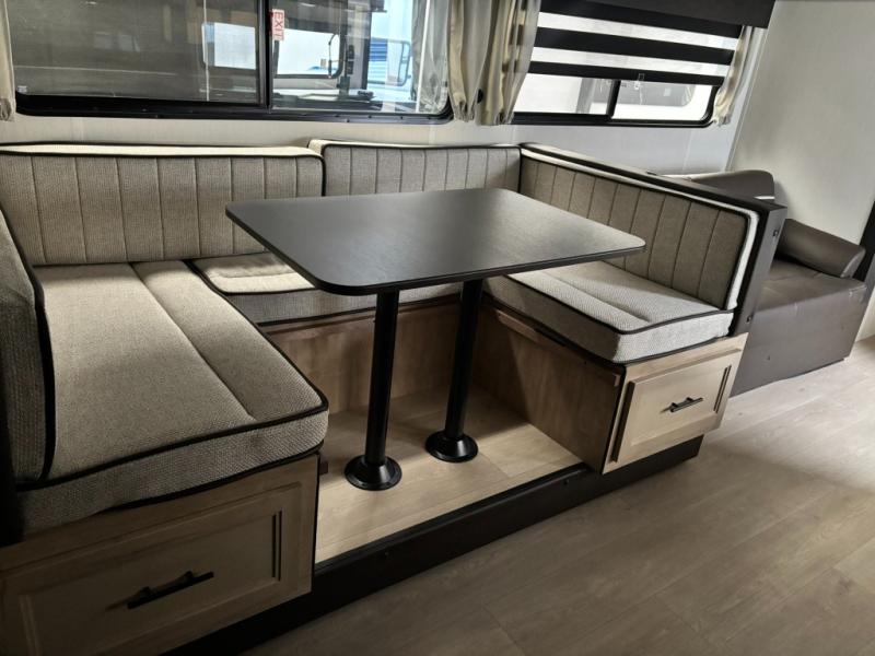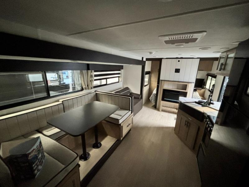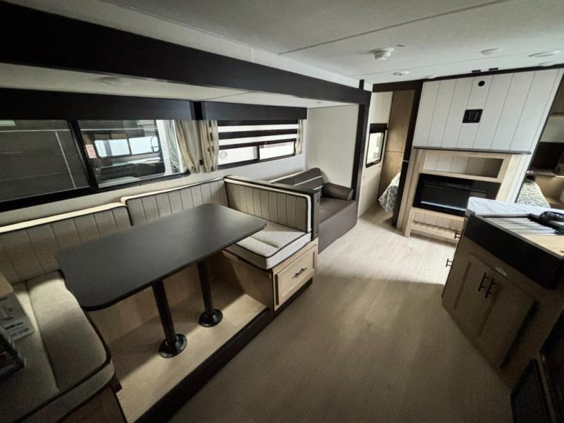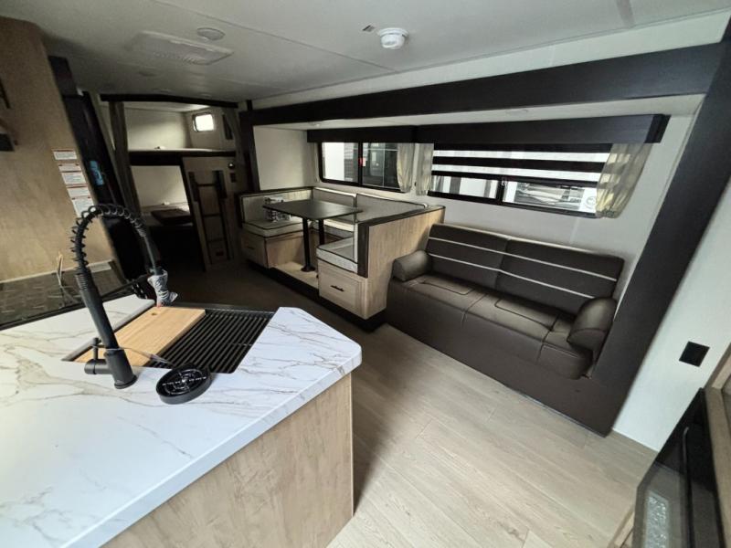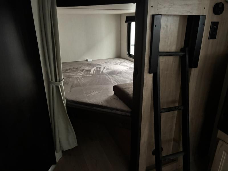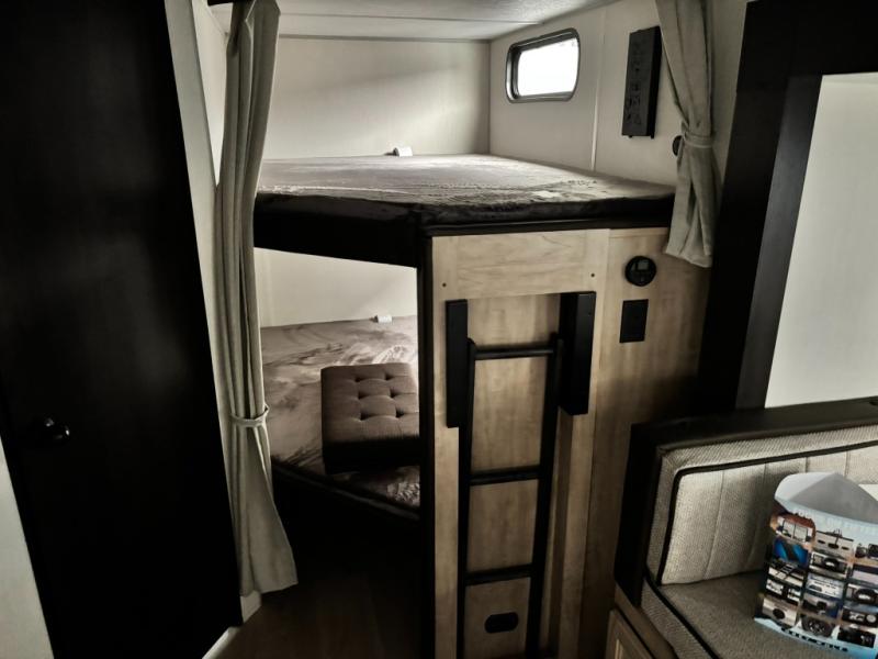 Come on inside this Cherokee Grey Wolf travel trailer and experience the convenience of a smooth flow of traffic in and out with two entry doors. The rear door leads into a full bath which is great for accessibility. Once inside, you will notice the large U-shaped dinette and the sofa which sit on the slide and create a spacious footprint for moving about, as well as great places to play games and socialize with your friends and family. A walk-in pantry provides plenty of storage allowing you to stock up on your favorite snacks and dry goods for your family adventure. At night, there is sleeping space for everyone between the double-size bunks and the RV king bed, plus the furniture.