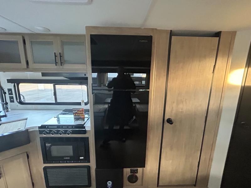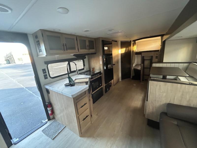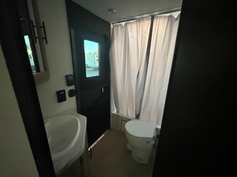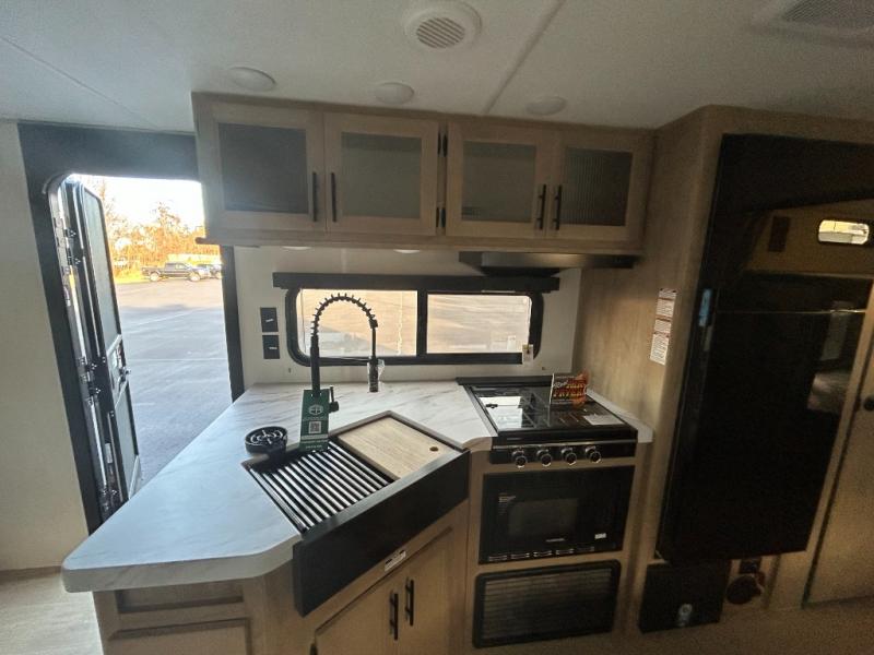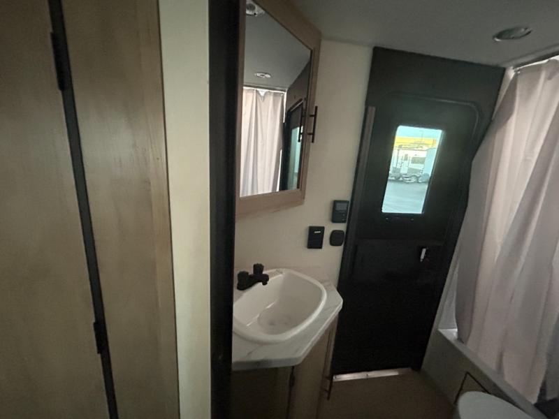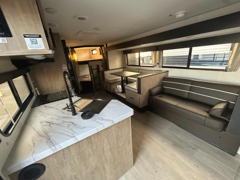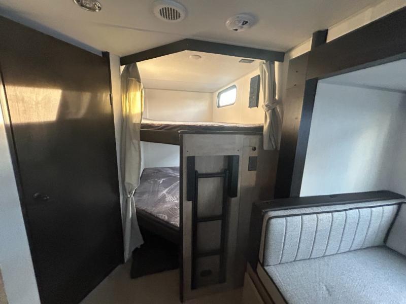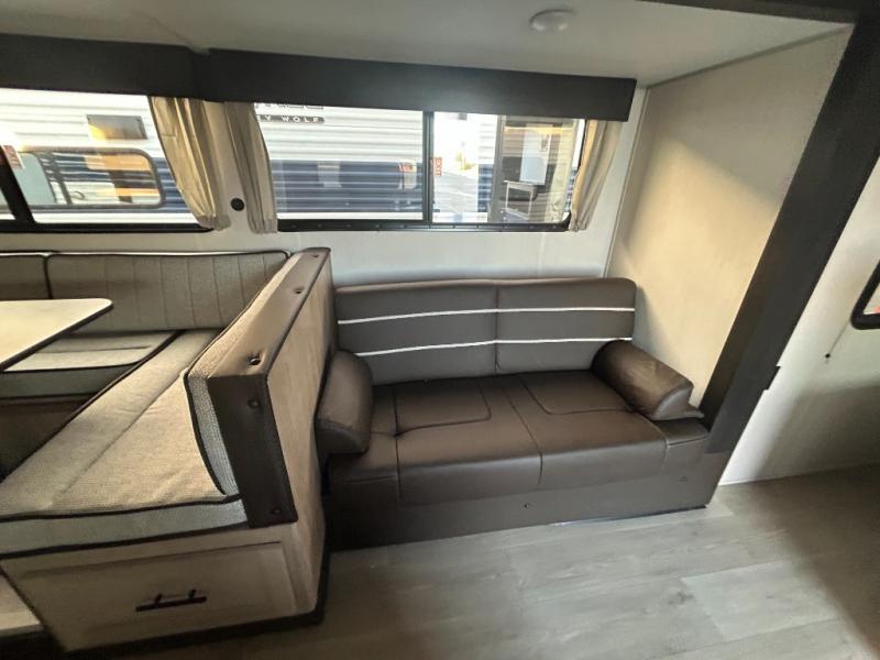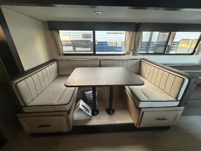 Come on inside this Cherokee Grey Wolf travel trailer and experience the convenience of a smooth flow of traffic in and out with two entry doors. The rear door leads into a full bath which is great for accessibility. Once inside, you will notice the large U-shaped dinette and the sofa which sit on the slide and create a spacious footprint for moving about, as well as great places to play games and socialize with your friends and family. A walk-in pantry provides plenty of storage allowing you to stock up on your favorite snacks and dry goods for your family adventure. At night, there is sleeping space for everyone between the double-size bunks and the RV king bed, plus the furniture.