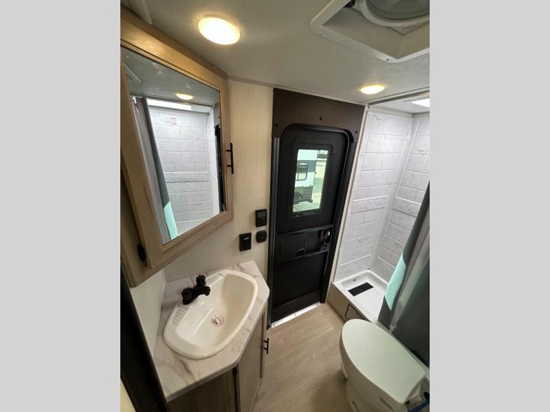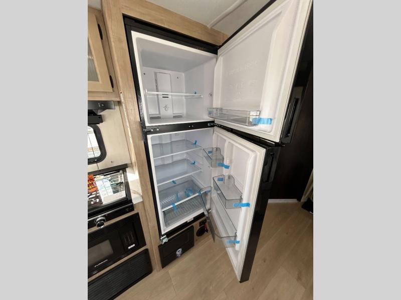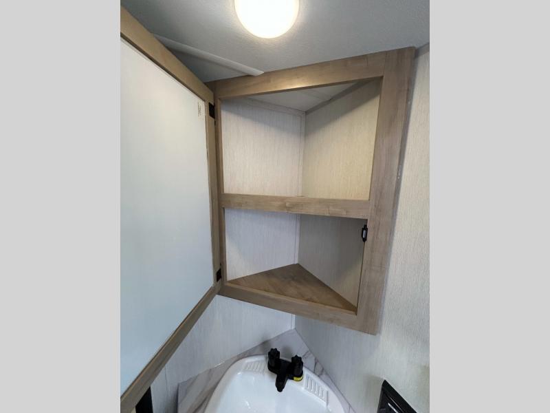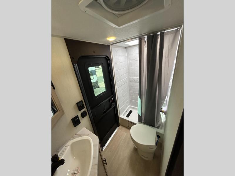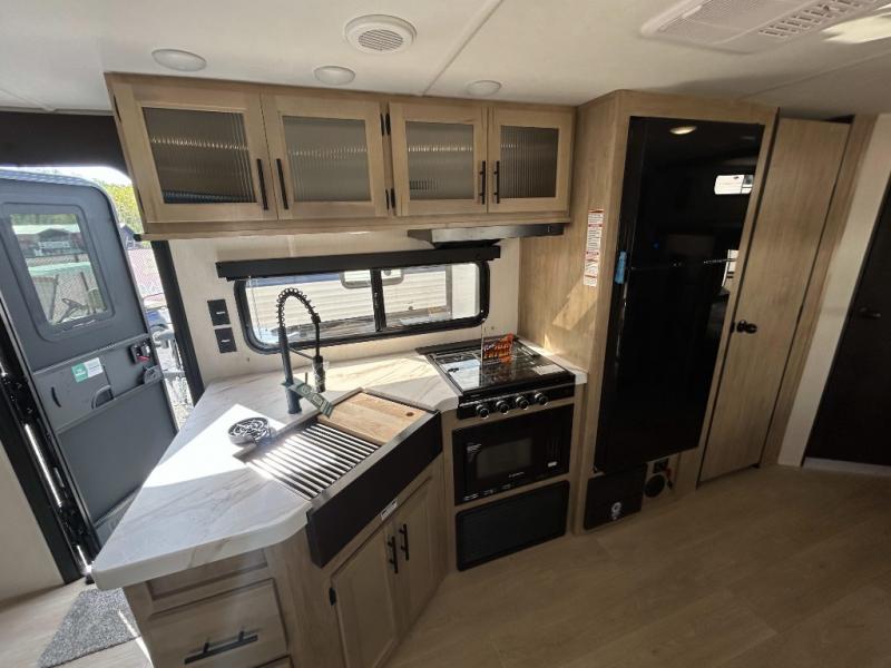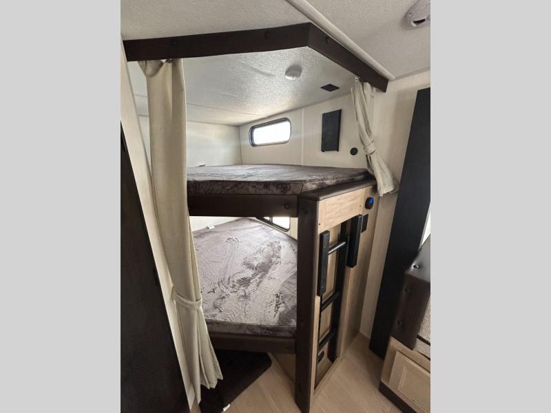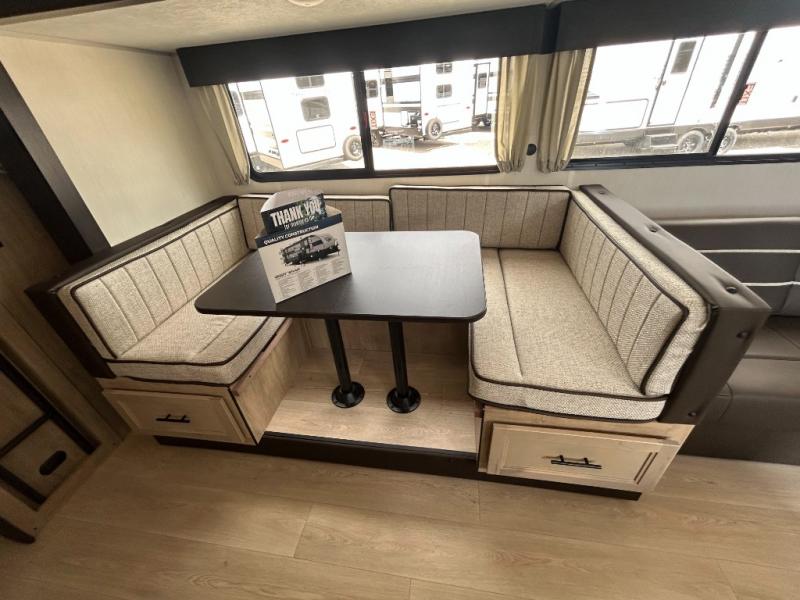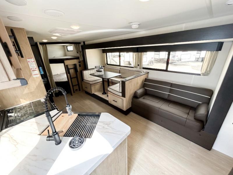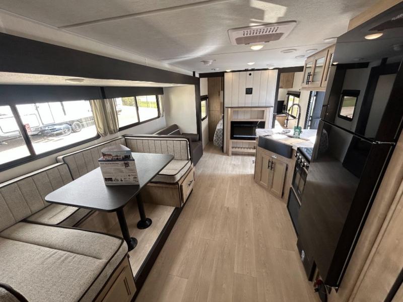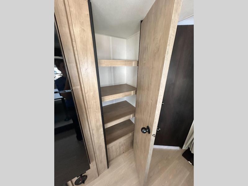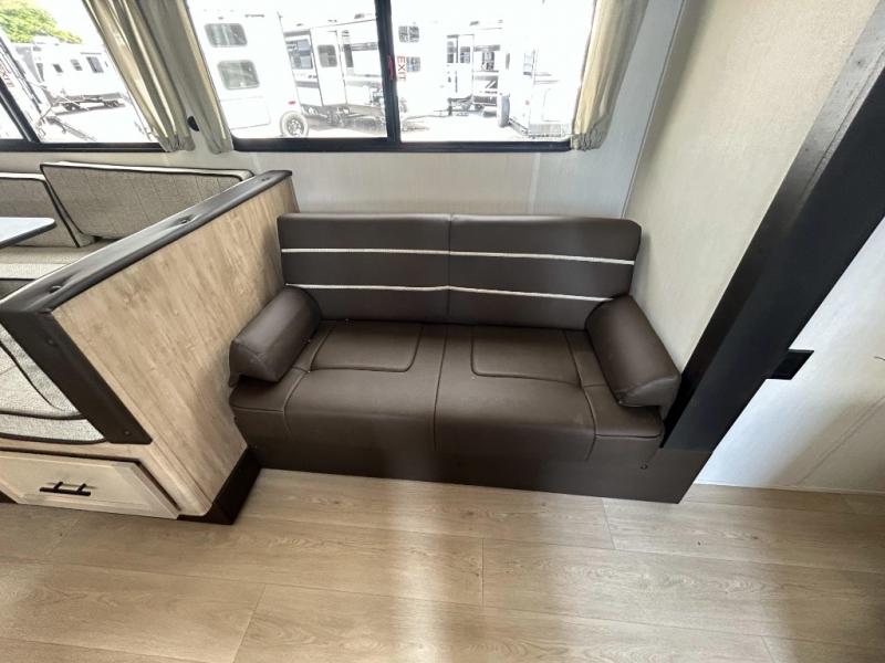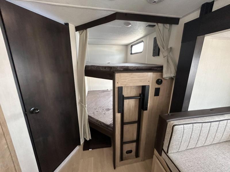 Come on inside this Cherokee Grey Wolf travel trailer and experience the convenience of a smooth flow of traffic in and out with two entry doors. The rear door leads into a full bath which is great for accessibility. Once inside, you will notice the large U-shaped dinette and the sofa which sit on the slide and create a spacious footprint for moving about, as well as great places to play games and socialize with your friends and family. A walk-in pantry provides plenty of storage allowing you to stock up on your favorite snacks and dry goods for your family adventure. At night, there is sleeping space for everyone between the double-size bunks and the RV king bed, plus the furniture.