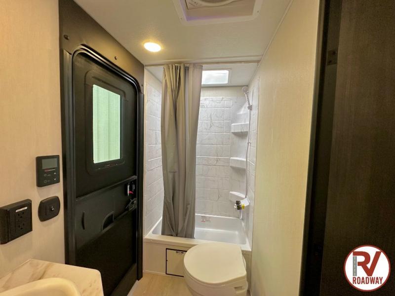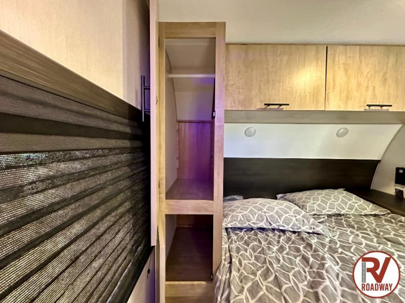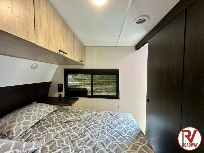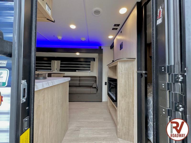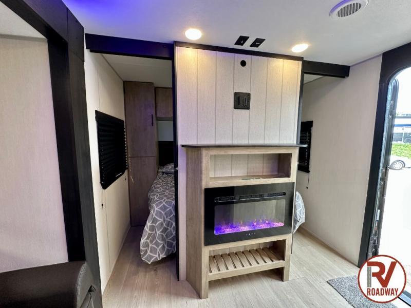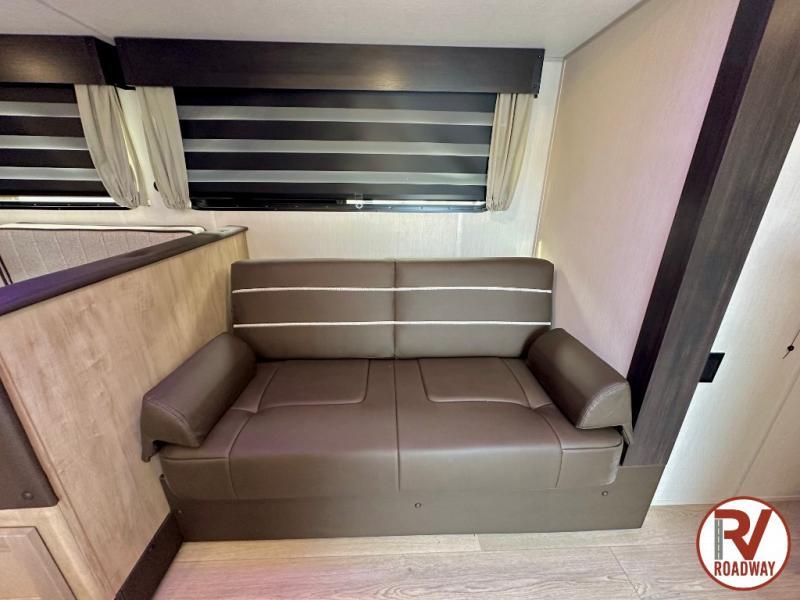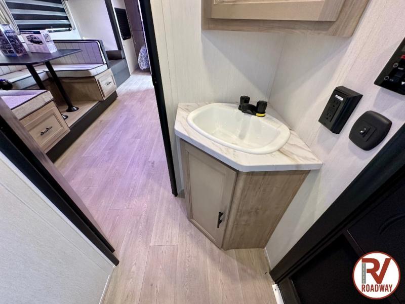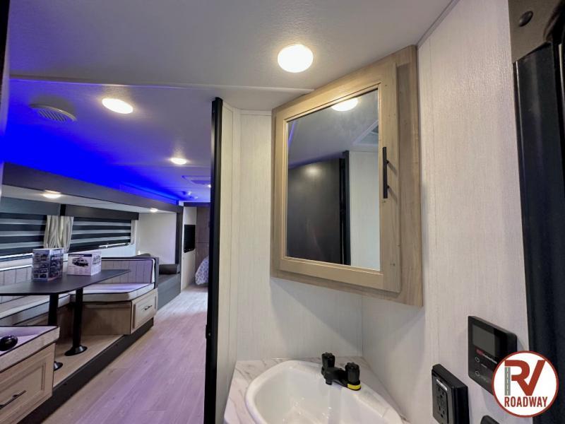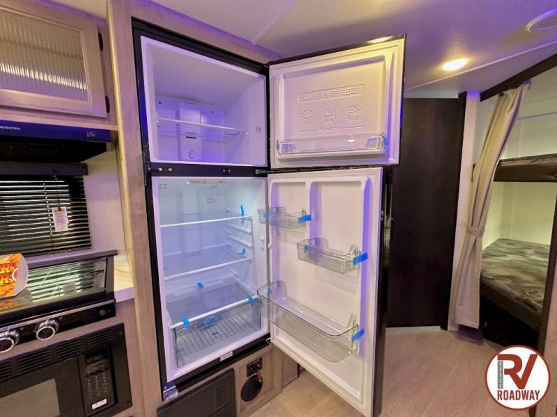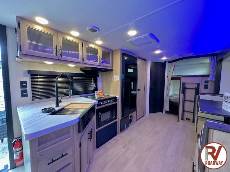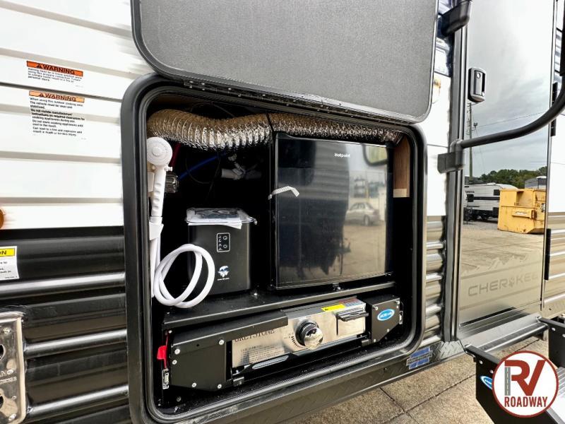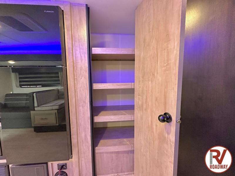 Come on inside this Cherokee Grey Wolf travel trailer and experience the convenience of a smooth flow of traffic in and out with two entry doors. The rear door leads into a full bath which is great for accessibility. Once inside, you will notice the large U-shaped dinette and the sofa which sit on the slide and create a spacious footprint for moving about, as well as great places to play games and socialize with your friends and family. A walk-in pantry provides plenty of storage allowing you to stock up on your favorite snacks and dry goods for your family adventure. At night, there is sleeping space for everyone between the double-size bunks and the RV king bed, plus the furniture.