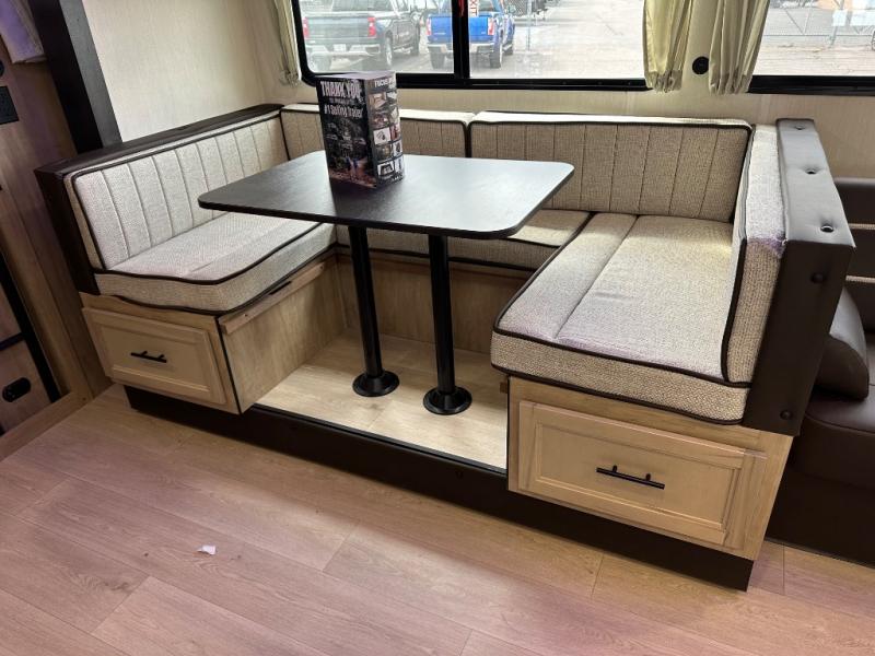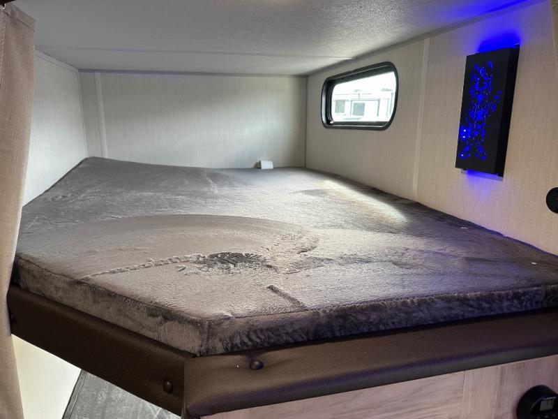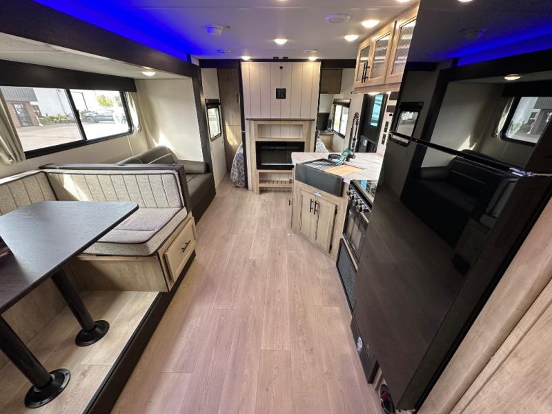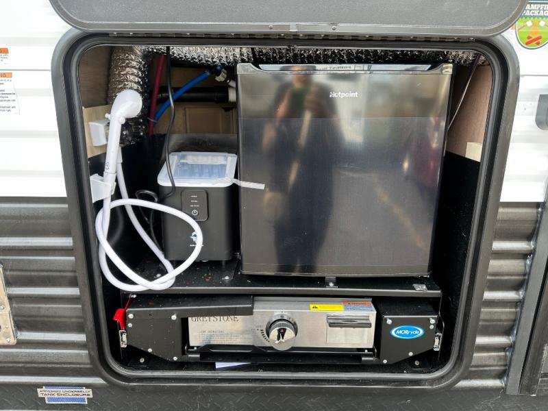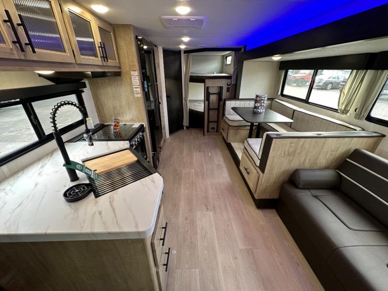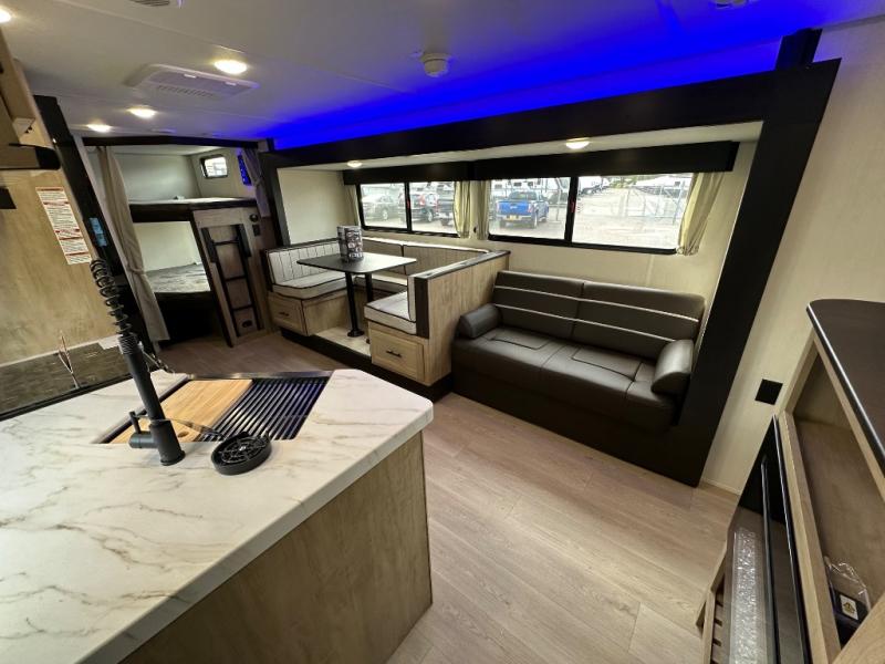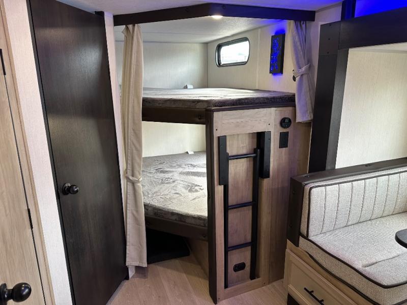 Come on inside this Cherokee Grey Wolf travel trailer and experience the convenience of a smooth flow of traffic in and out with two entry doors. The rear door leads into a full bath which is great for accessibility. Once inside, you will notice the large U-shaped dinette and the sofa which sit on the slide and create a spacious footprint for moving about, as well as great places to play games and socialize with your friends and family. A walk-in pantry provides plenty of storage allowing you to stock up on your favorite snacks and dry goods for your family adventure. At night, there is sleeping space for everyone between the double-size bunks and the RV king bed, plus the furniture.