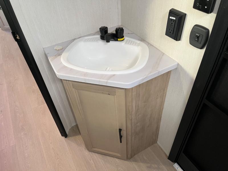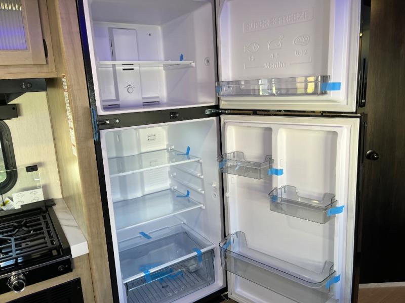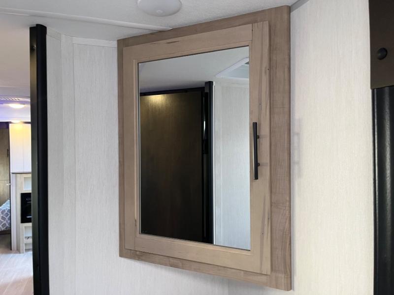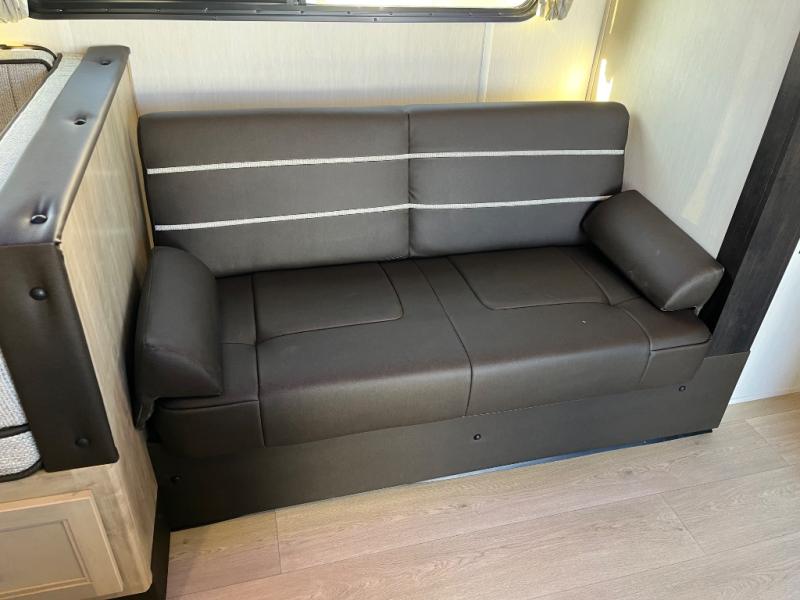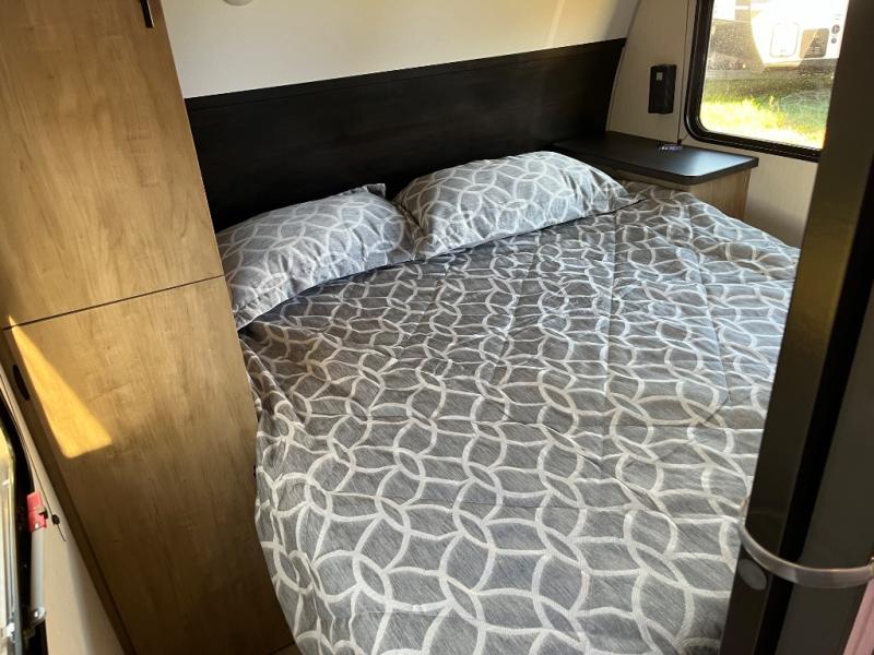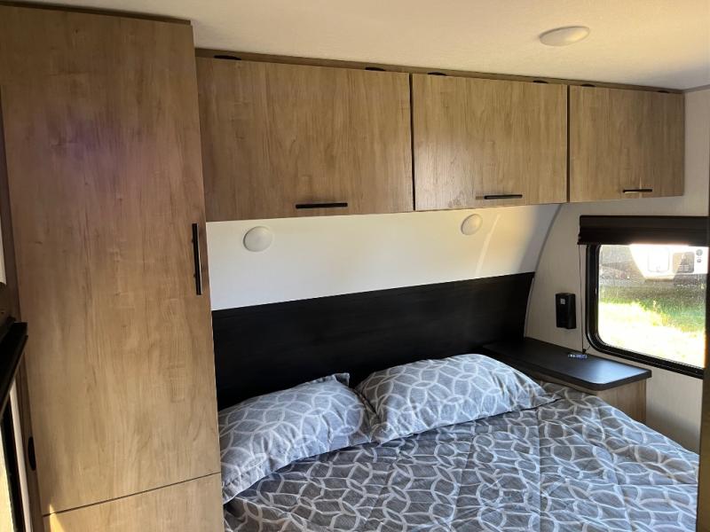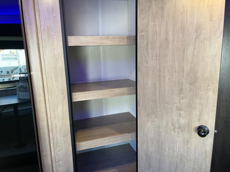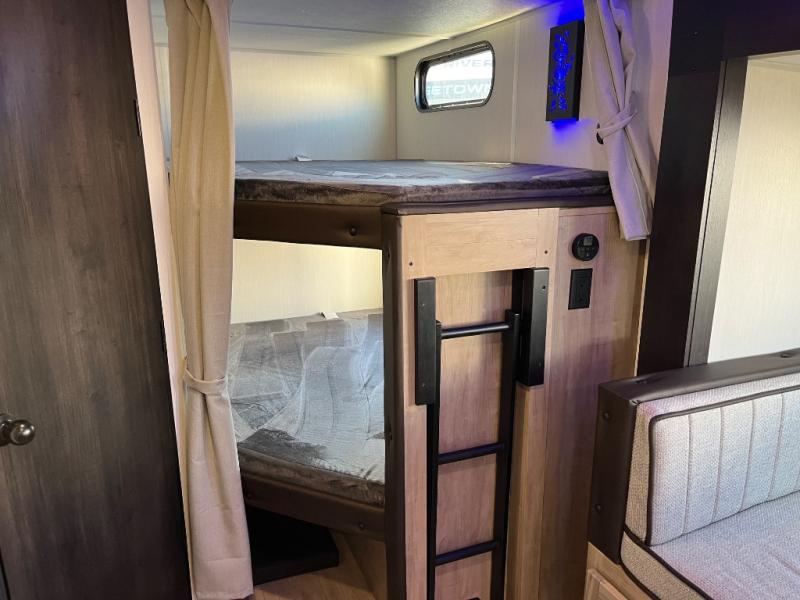 Come on inside this Cherokee Grey Wolf travel trailer and experience the convenience of a smooth flow of traffic in and out with two entry doors. The rear door leads into a full bath which is great for accessibility. Once inside, you will notice the large U-shaped dinette and the sofa which sit on the slide and create a spacious footprint for moving about, as well as great places to play games and socialize with your friends and family. A walk-in pantry provides plenty of storage allowing you to stock up on your favorite snacks and dry goods for your family adventure. At night, there is sleeping space for everyone between the double-size bunks and the RV king bed, plus the furniture.