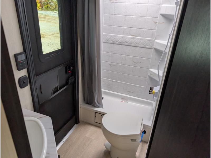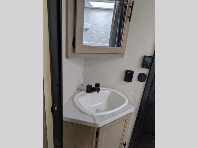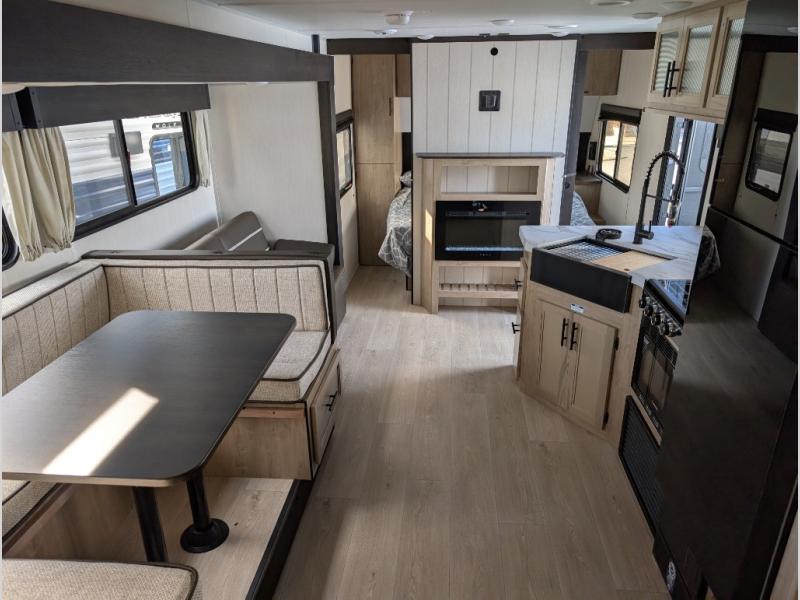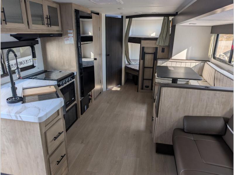 Come on inside this Cherokee Grey Wolf travel trailer and experience the convenience of a smooth flow of traffic in and out with two entry doors. The rear door leads into a full bath which is great for accessibility. Once inside, you will notice the large U-shaped dinette and the sofa which sit on the slide and create a spacious footprint for moving about, as well as great places to play games and socialize with your friends and family. A walk-in pantry provides plenty of storage allowing you to stock up on your favorite snacks and dry goods for your family adventure. At night, there is sleeping space for everyone between the double-size bunks and the RV king bed, plus the furniture.