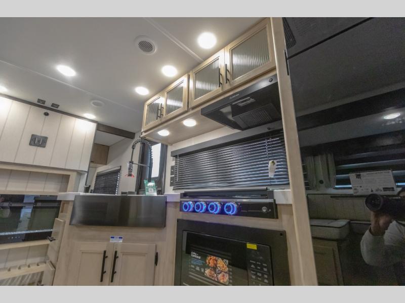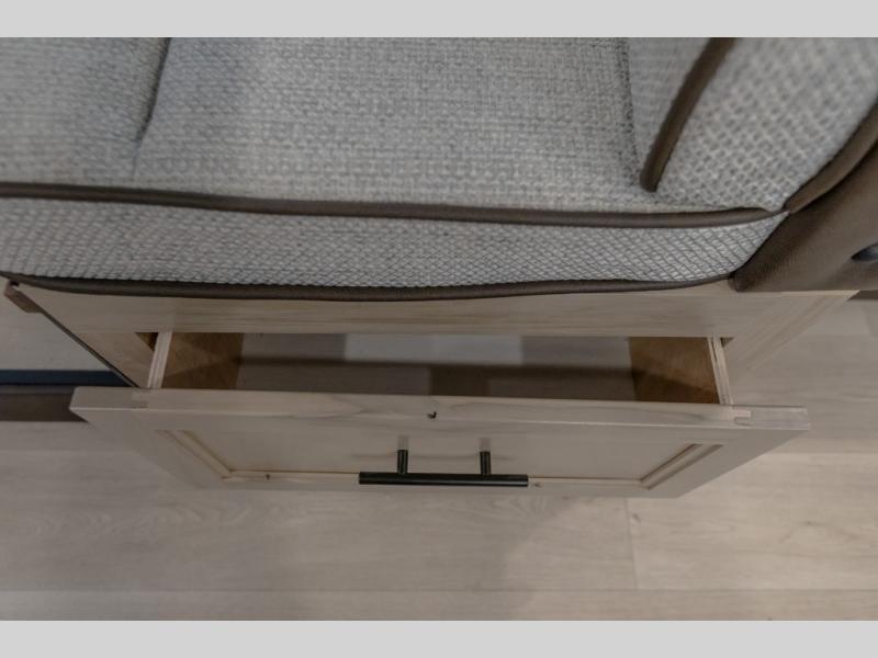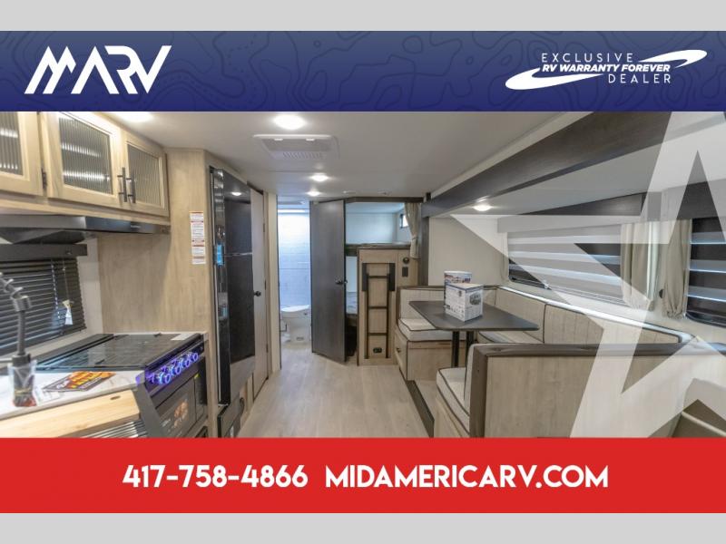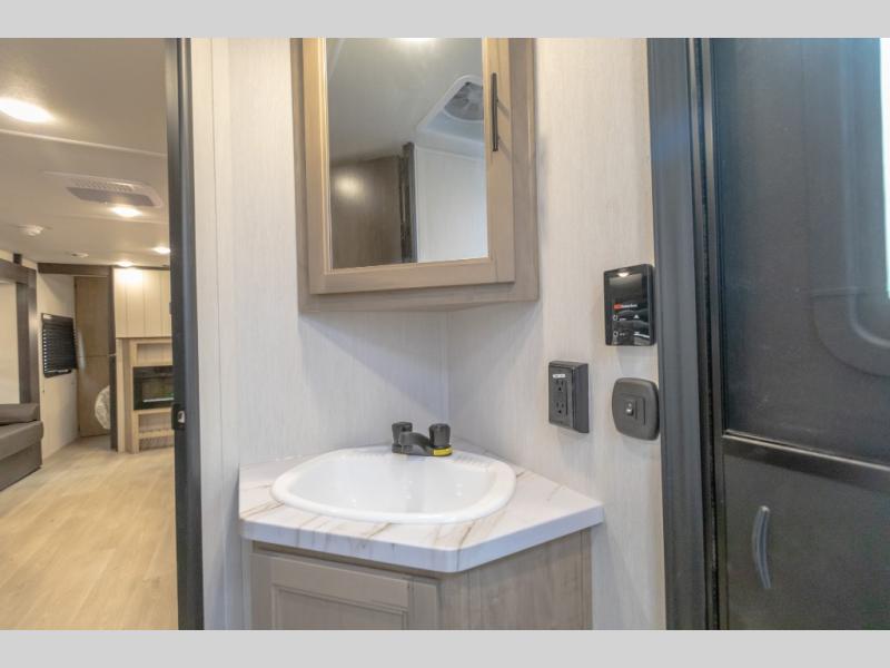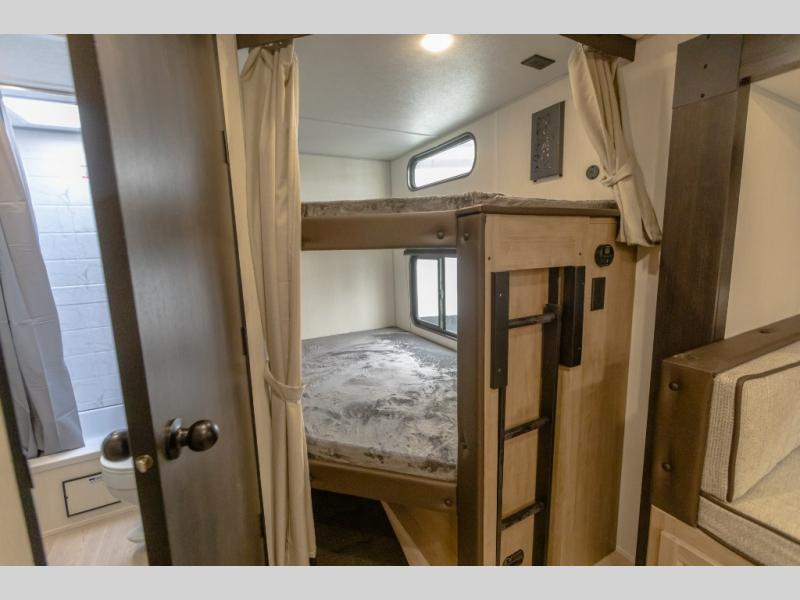 Come on inside this Cherokee Grey Wolf travel trailer and experience the convenience of a smooth flow of traffic in and out with two entry doors. The rear door leads into a full bath which is great for accessibility. Once inside, you will notice the large U-shaped dinette and the sofa which sit on the slide and create a spacious footprint for moving about, as well as great places to play games and socialize with your friends and family. A walk-in pantry provides plenty of storage allowing you to stock up on your favorite snacks and dry goods for your family adventure. At night, there is sleeping space for everyone between the double-size bunks and the RV king bed, plus the furniture.