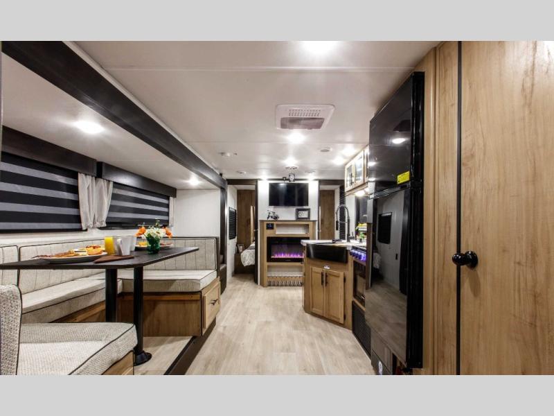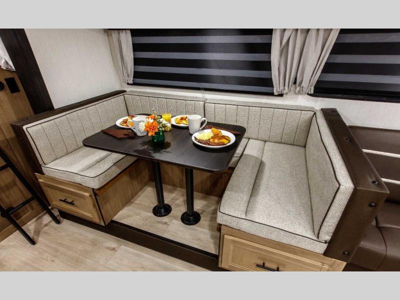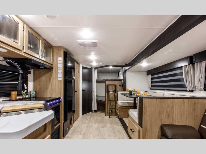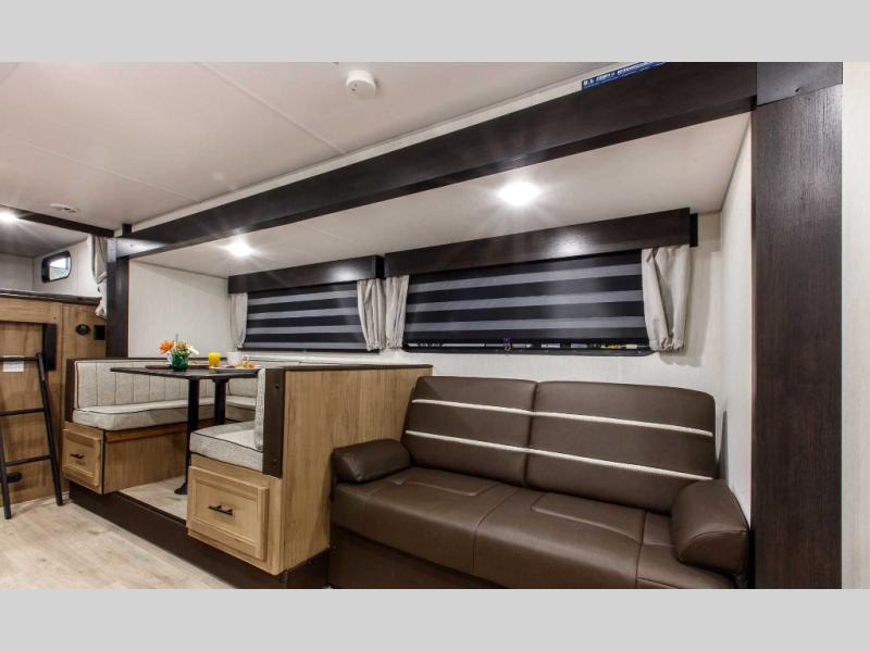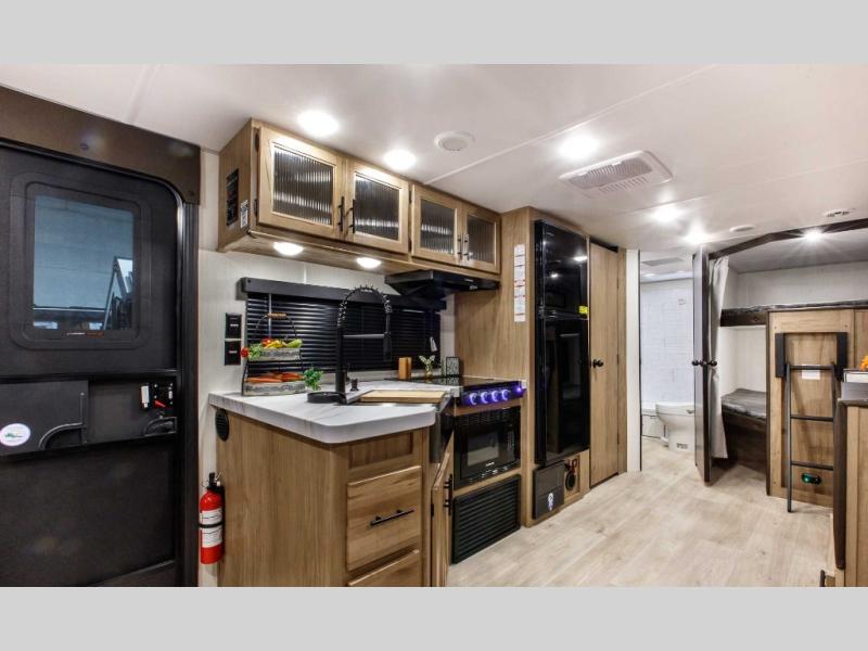 Come on inside this Cherokee Grey Wolf travel trailer and experience the convenience of a smooth flow of traffic in and out with two entry doors. The rear door leads into a full bath which is great for accessibility. Once inside, you will notice the large U-shaped dinette and the sofa which sit on the slide and create a spacious footprint for moving about, as well as great places to play games and socialize with your friends and family. A walk-in pantry provides plenty of storage allowing you to stock up on your favorite snacks and dry goods for your family adventure. At night, there is sleeping space for everyone between the double-size bunks and the RV king bed, plus the furniture.