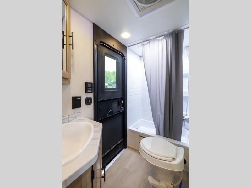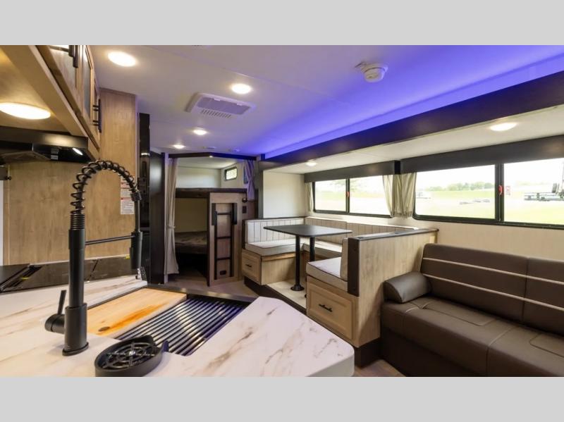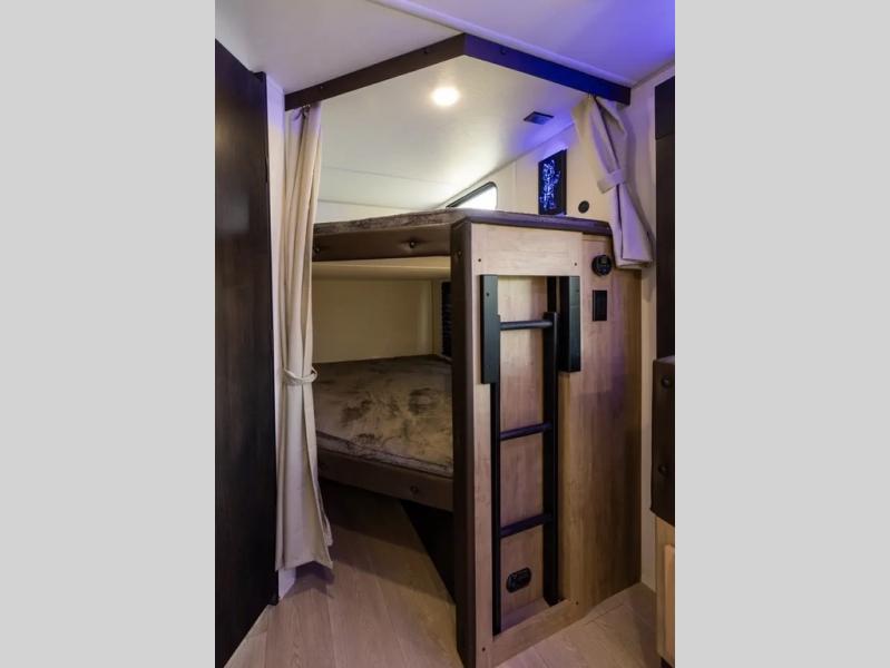 Come on inside this Cherokee Grey Wolf travel trailer and experience the convenience of a smooth flow of traffic in and out with two entry doors. The rear door leads into a full bath which is great for accessibility. Once inside, you will notice the large U-shaped dinette and the sofa which sit on the slide and create a spacious footprint for moving about, as well as great places to play games and socialize with your friends and family. A walk-in pantry provides plenty of storage allowing you to stock up on your favorite snacks and dry goods for your family adventure. At night, there is sleeping space for everyone between the double-size bunks and the RV king bed, plus the furniture.