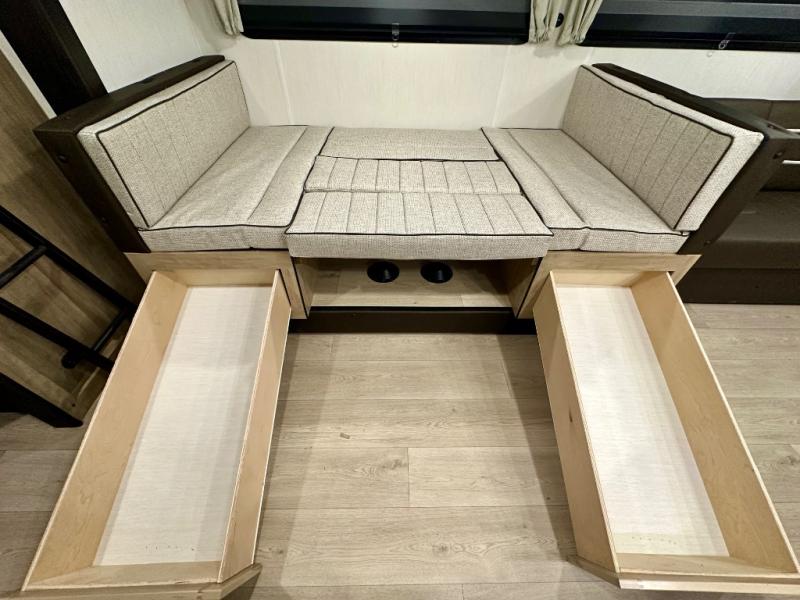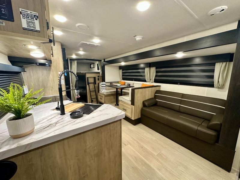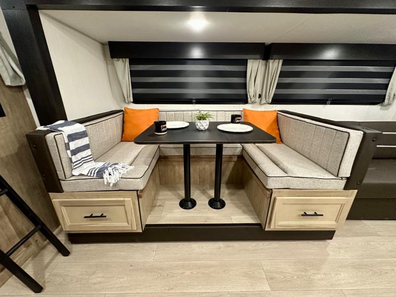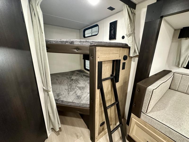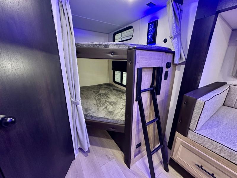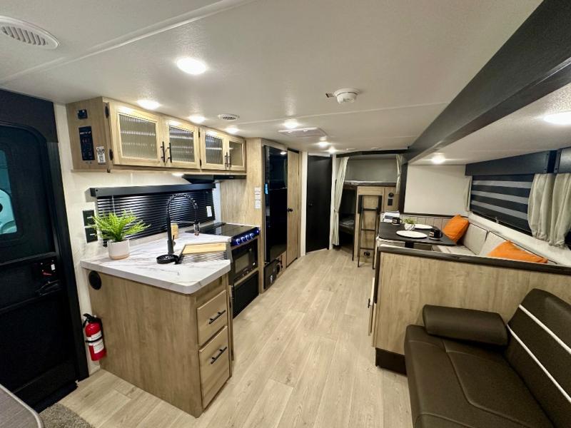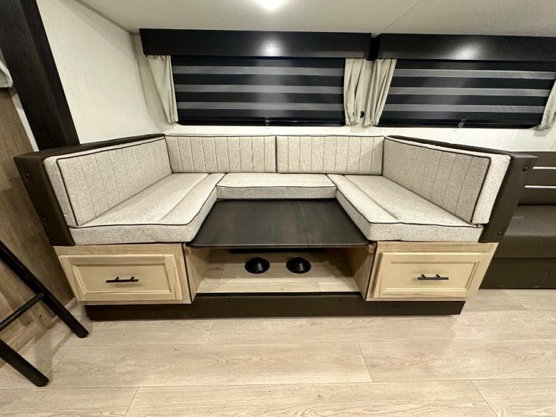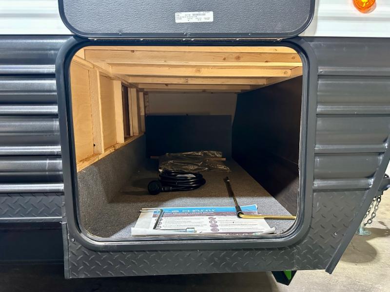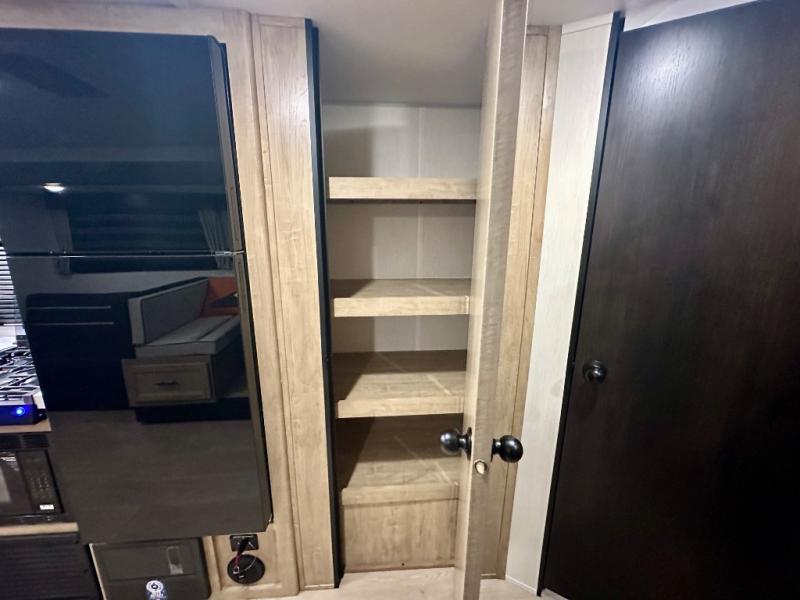 Come on inside this Cherokee Grey Wolf travel trailer and experience the convenience of a smooth flow of traffic in and out with two entry doors. The rear door leads into a full bath which is great for accessibility. Once inside, you will notice the large U-shaped dinette and the sofa which sit on the slide and create a spacious footprint for moving about, as well as great places to play games and socialize with your friends and family. A walk-in pantry provides plenty of storage allowing you to stock up on your favorite snacks and dry goods for your family adventure. At night, there is sleeping space for everyone between the double-size bunks and the RV king bed, plus the furniture.