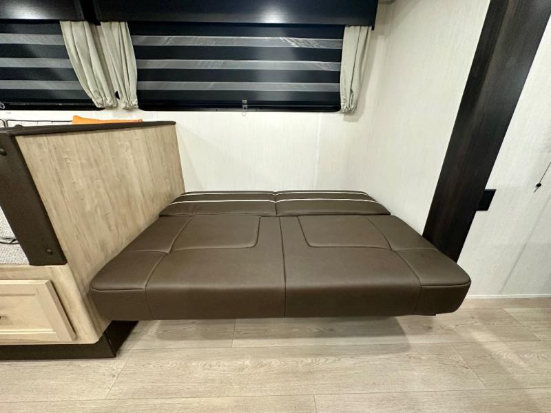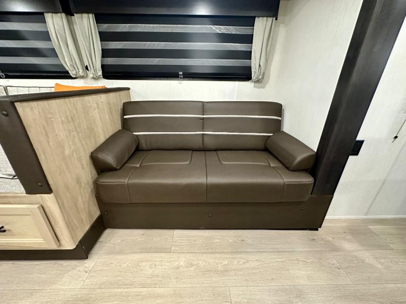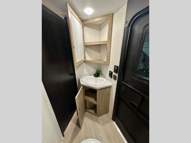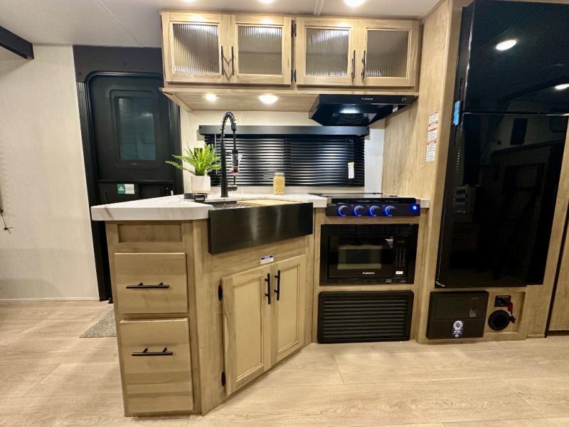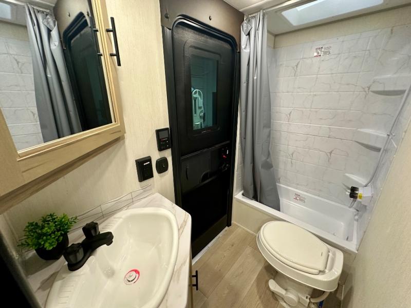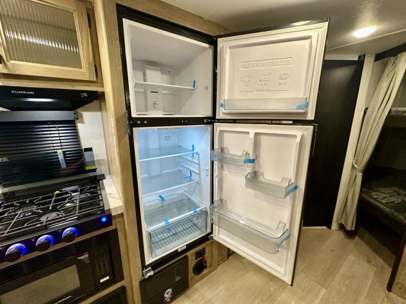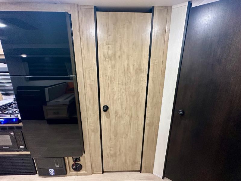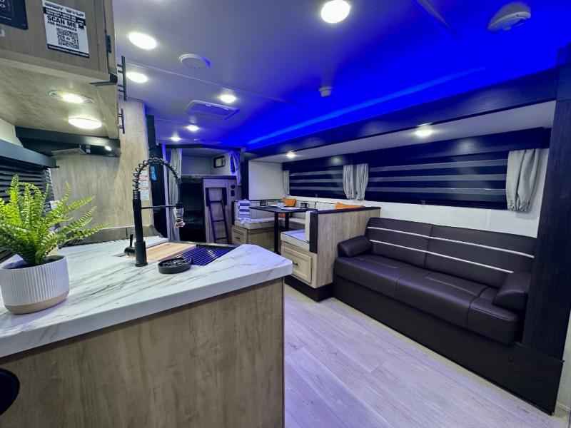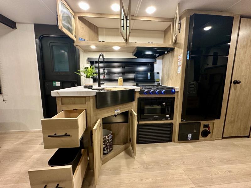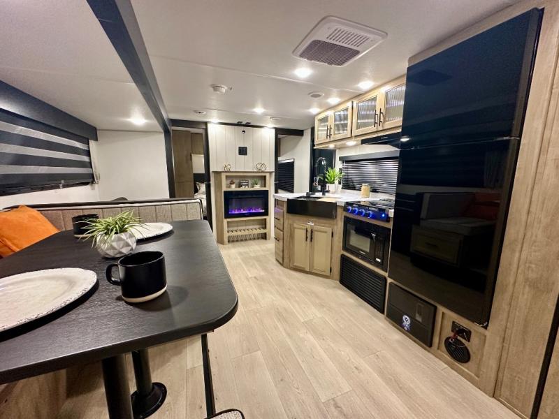 Come on inside this Cherokee Grey Wolf travel trailer and experience the convenience of a smooth flow of traffic in and out with two entry doors. The rear door leads into a full bath which is great for accessibility. Once inside, you will notice the large U-shaped dinette and the sofa which sit on the slide and create a spacious footprint for moving about, as well as great places to play games and socialize with your friends and family. A walk-in pantry provides plenty of storage allowing you to stock up on your favorite snacks and dry goods for your family adventure. At night, there is sleeping space for everyone between the double-size bunks and the RV king bed, plus the furniture.