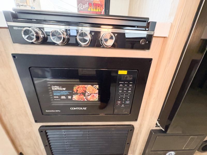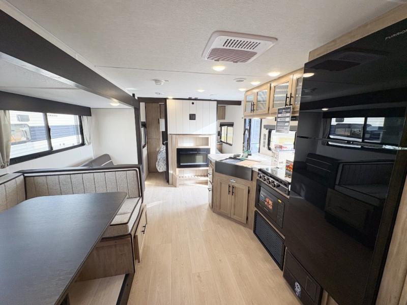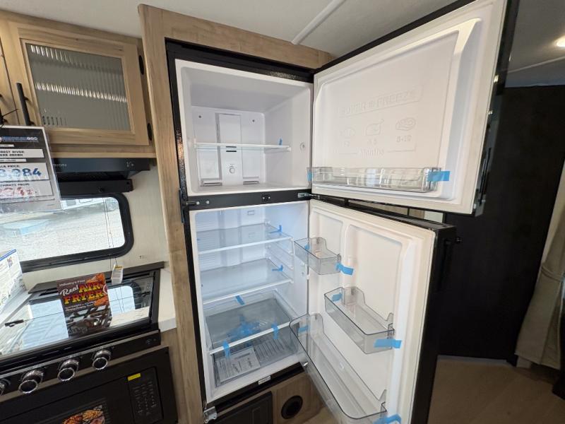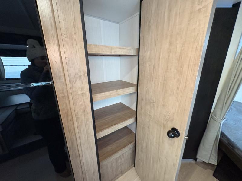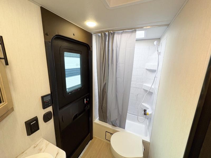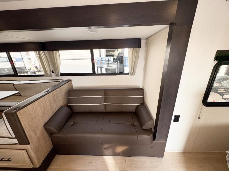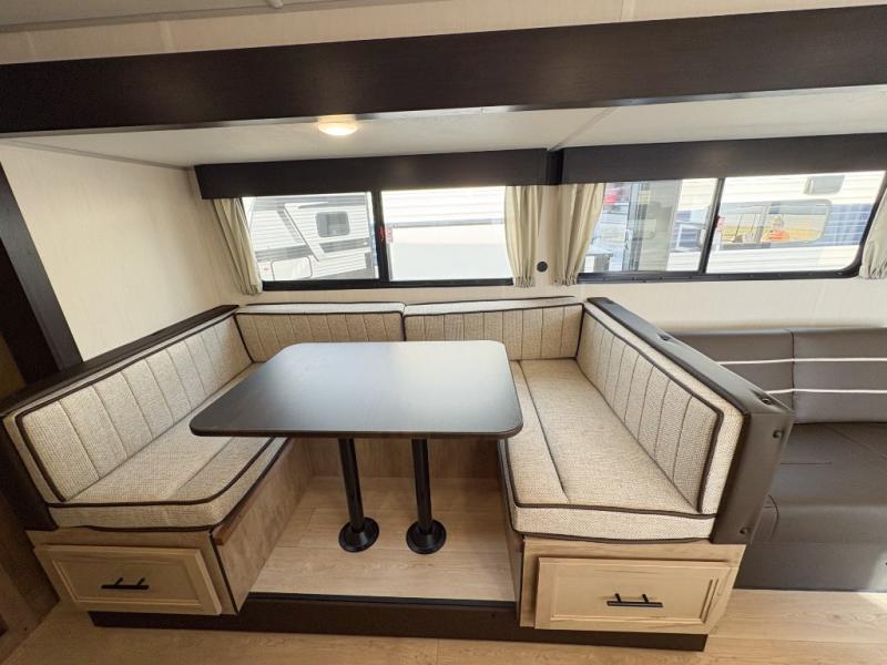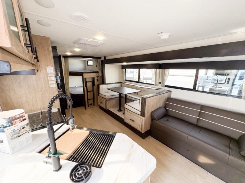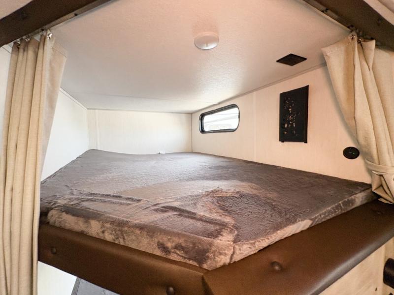 Come on inside this Cherokee Grey Wolf travel trailer and experience the convenience of a smooth flow of traffic in and out with two entry doors. The rear door leads into a full bath which is great for accessibility. Once inside, you will notice the large U-shaped dinette and the sofa which sit on the slide and create a spacious footprint for moving about, as well as great places to play games and socialize with your friends and family. A walk-in pantry provides plenty of storage allowing you to stock up on your favorite snacks and dry goods for your family adventure. At night, there is sleeping space for everyone between the double-size bunks and the RV king bed, plus the furniture.