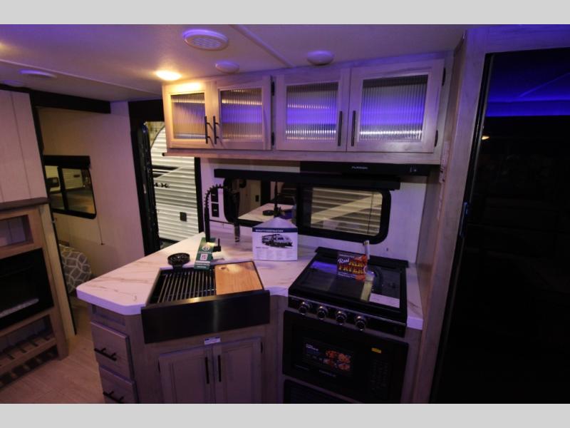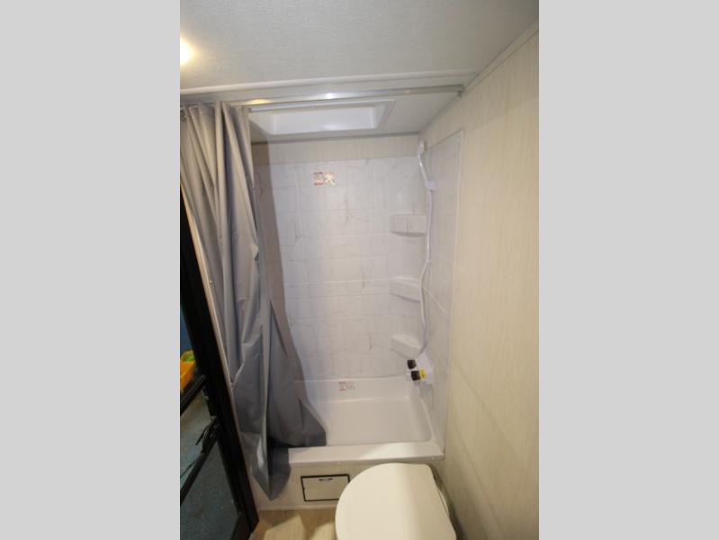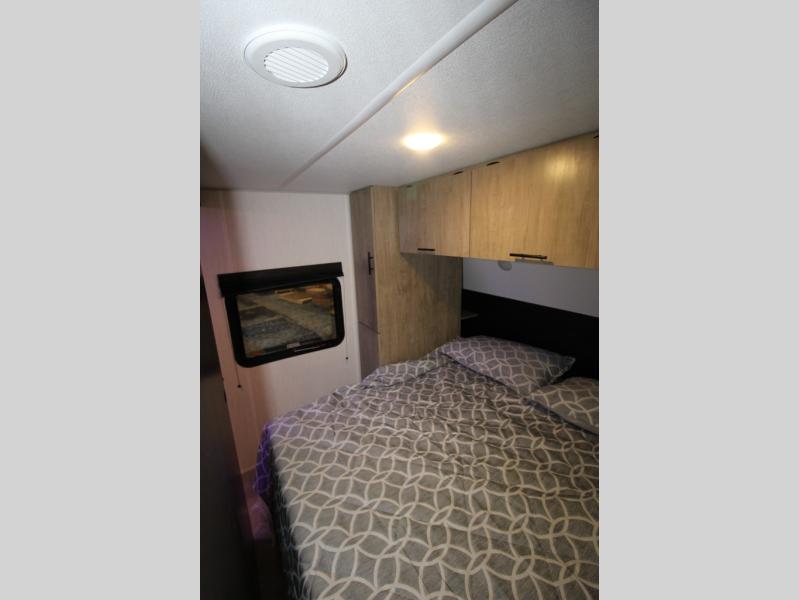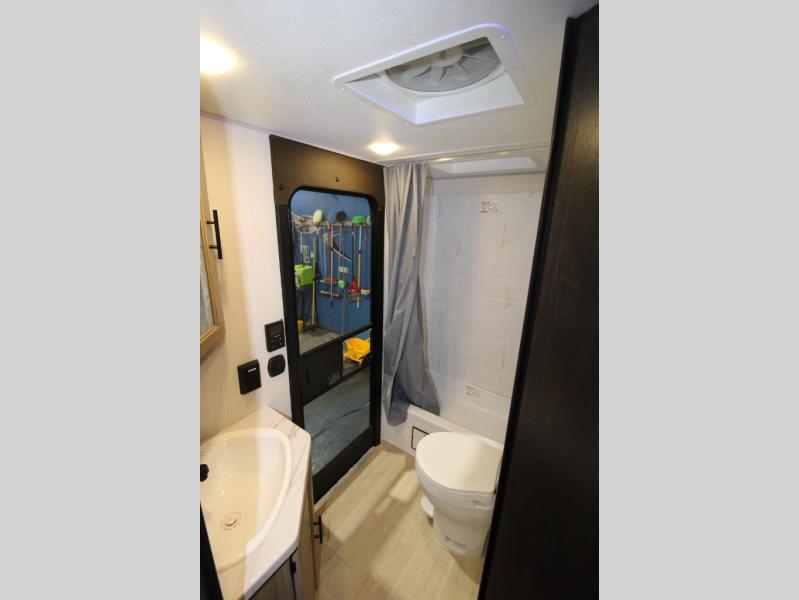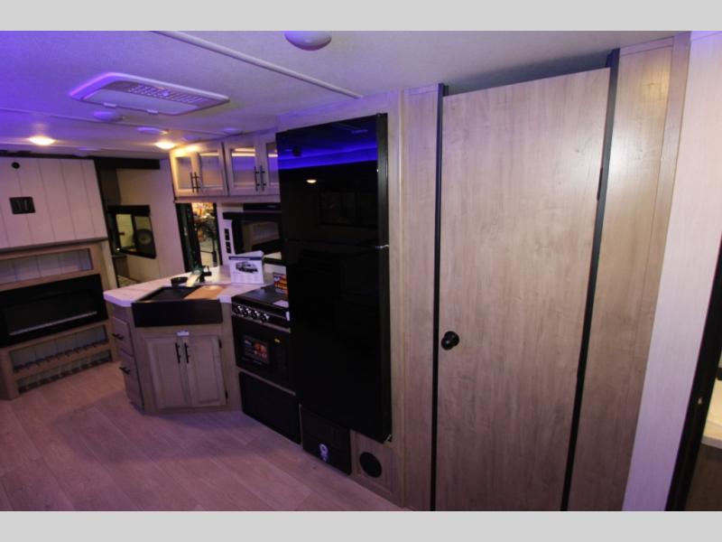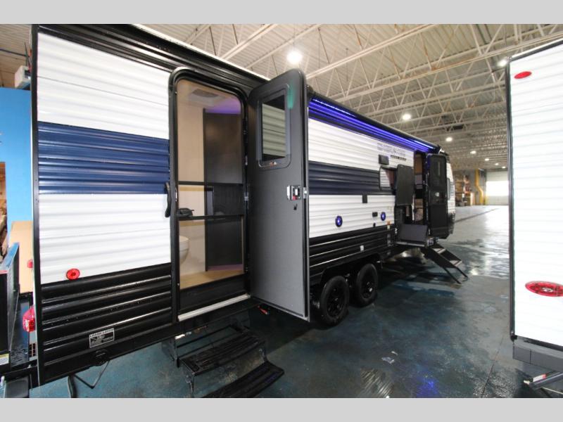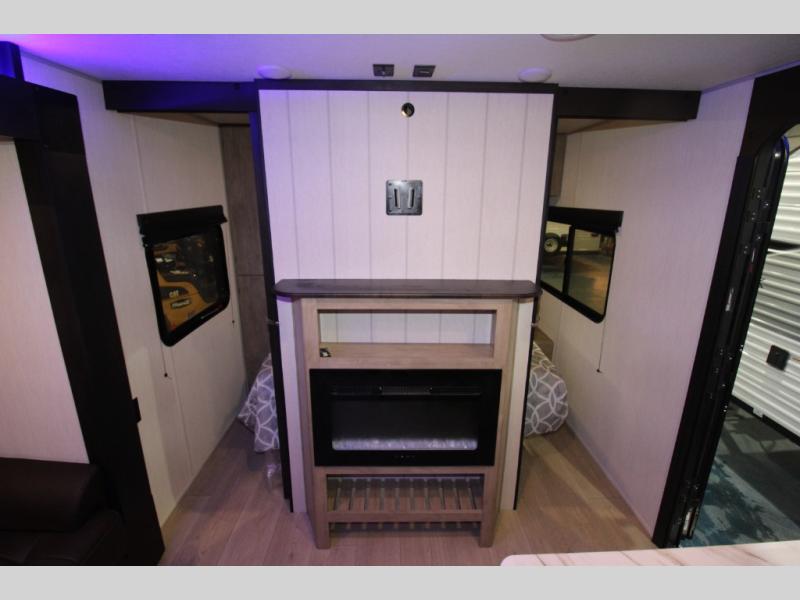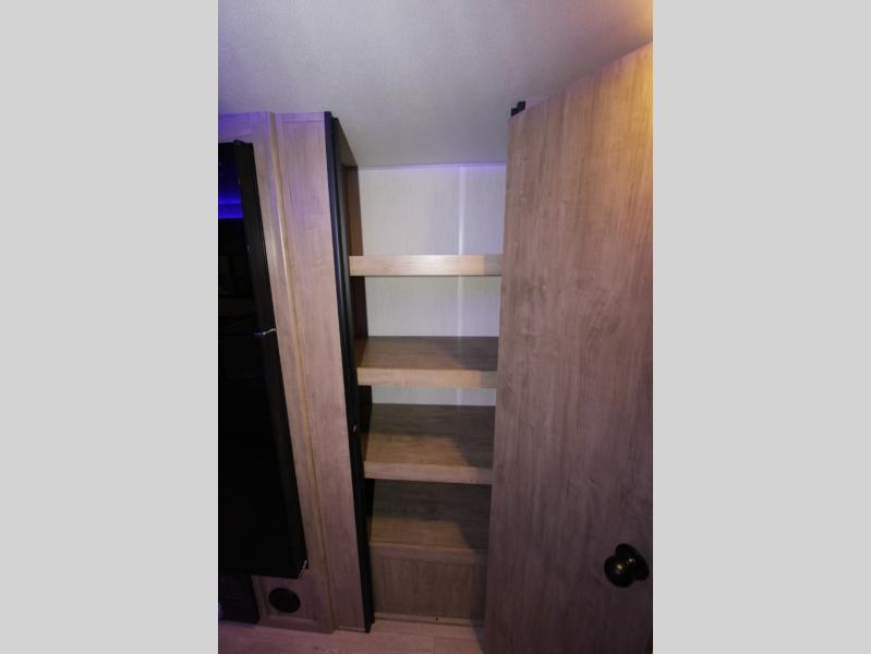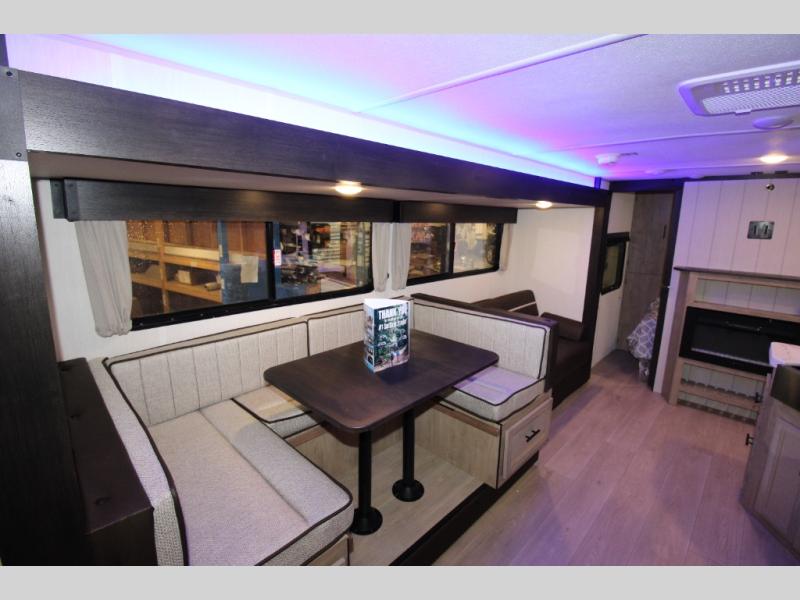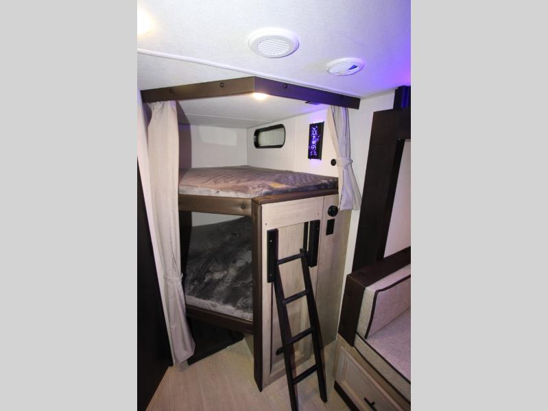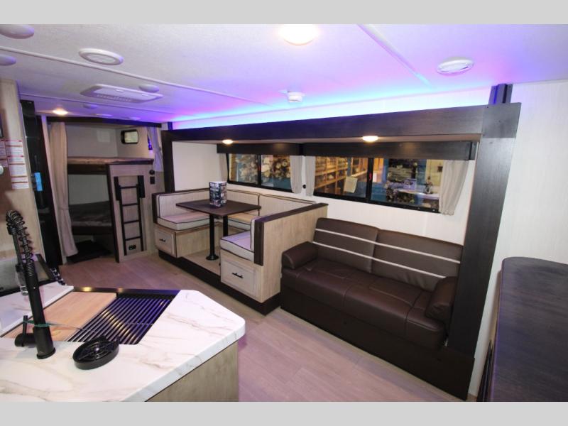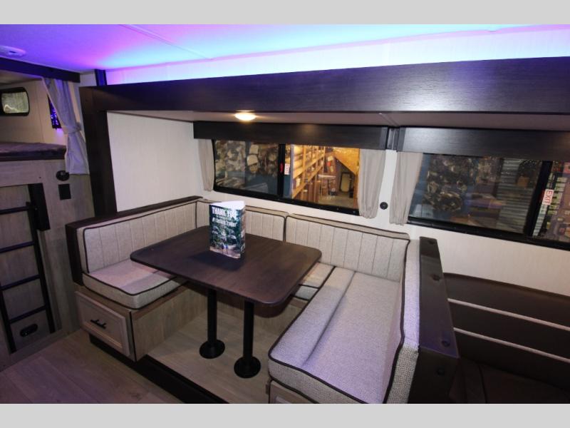 Come on inside this Cherokee Grey Wolf travel trailer and experience the convenience of a smooth flow of traffic in and out with two entry doors. The rear door leads into a full bath which is great for accessibility. Once inside, you will notice the large U-shaped dinette and the sofa which sit on the slide and create a spacious footprint for moving about, as well as great places to play games and socialize with your friends and family. A walk-in pantry provides plenty of storage allowing you to stock up on your favorite snacks and dry goods for your family adventure. At night, there is sleeping space for everyone between the double-size bunks and the RV king bed, plus the furniture.