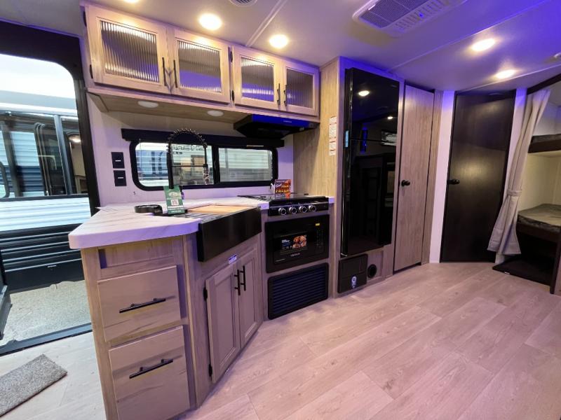 Come on inside this Cherokee Grey Wolf travel trailer and experience the convenience of a smooth flow of traffic in and out with two entry doors. The rear door leads into a full bath which is great for accessibility. Once inside, you will notice the large U-shaped dinette and the sofa which sit on the slide and create a spacious footprint for moving about, as well as great places to play games and socialize with your friends and family. A walk-in pantry provides plenty of storage allowing you to stock up on your favorite snacks and dry goods for your family adventure. At night, there is sleeping space for everyone between the double-size bunks and the RV king bed, plus the furniture.