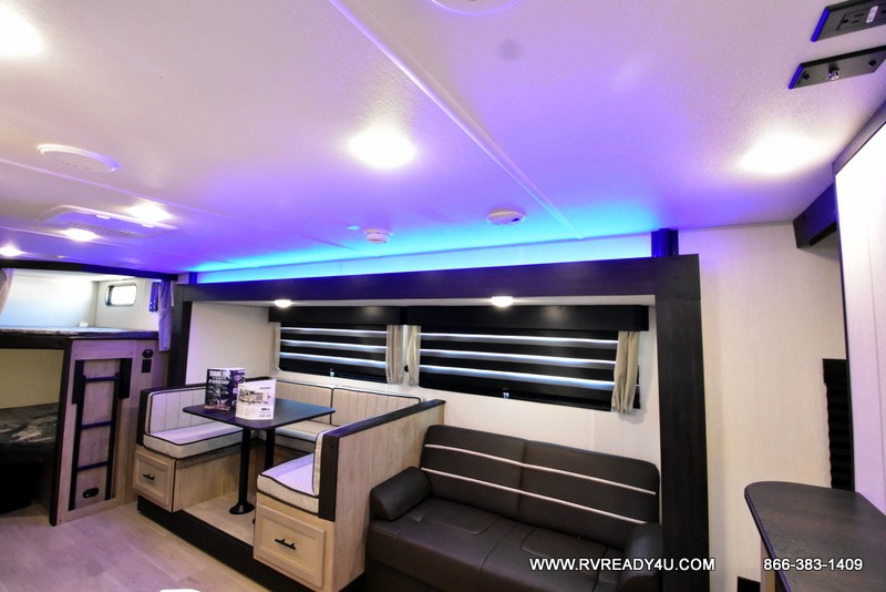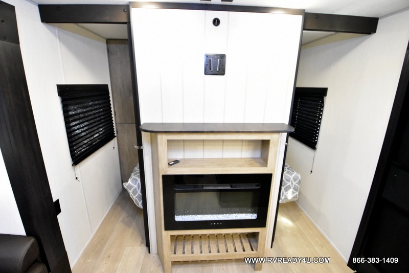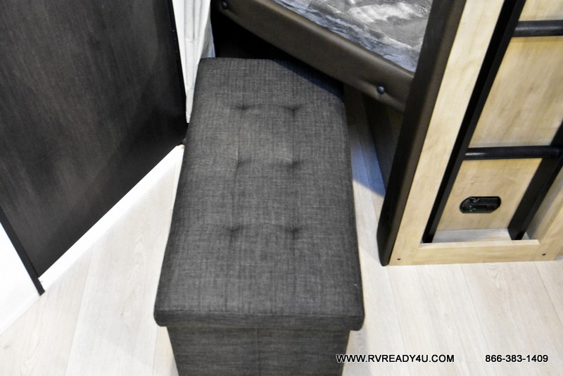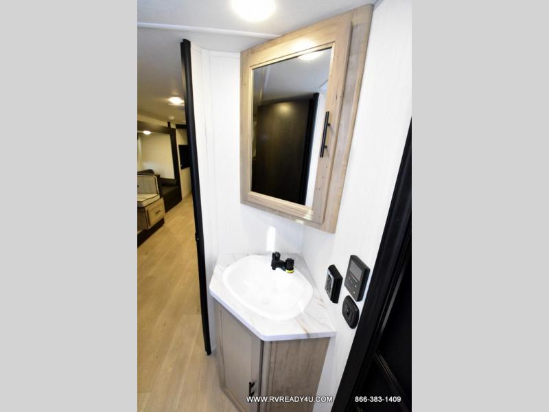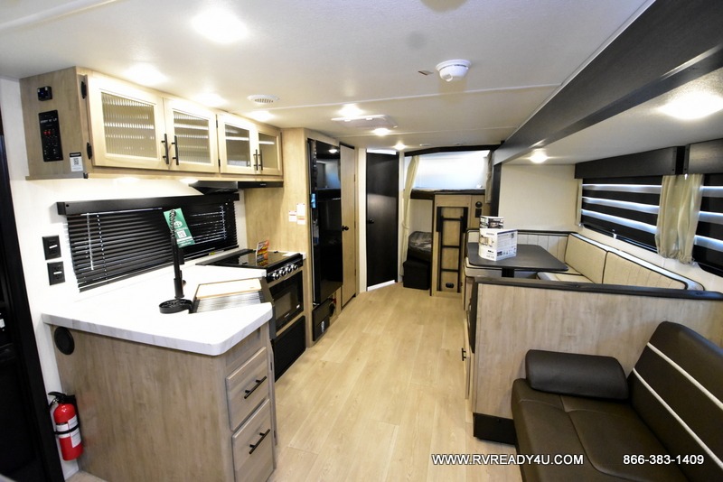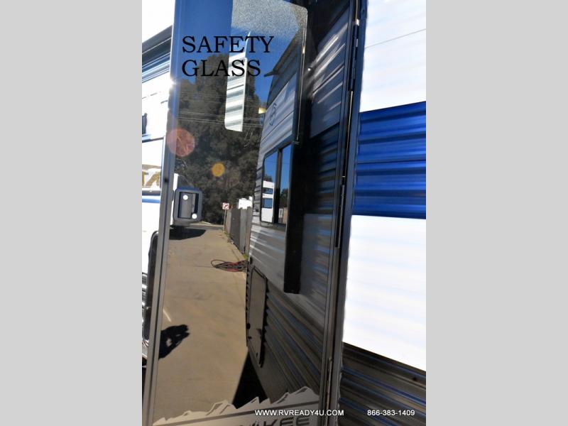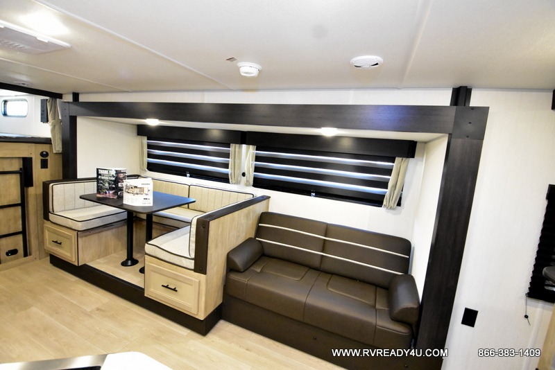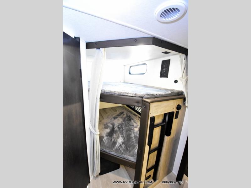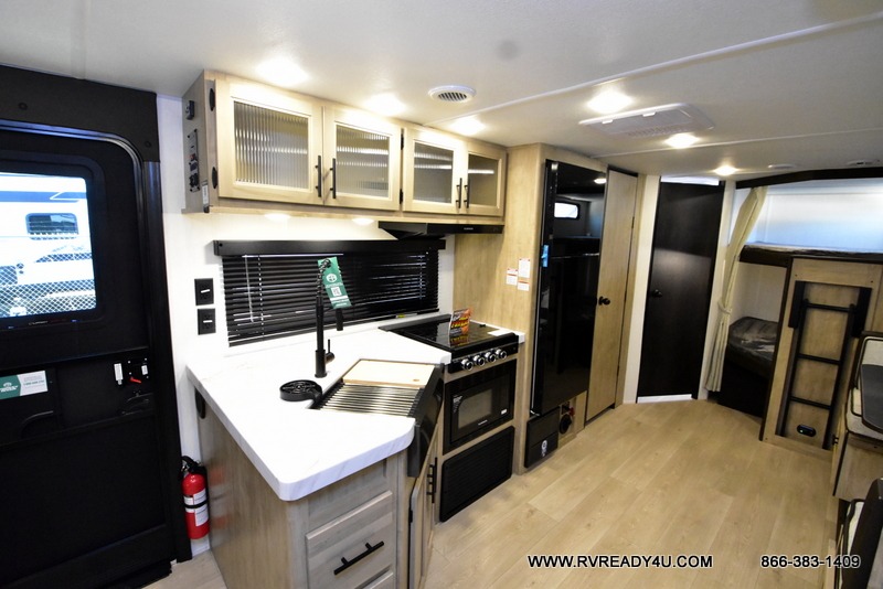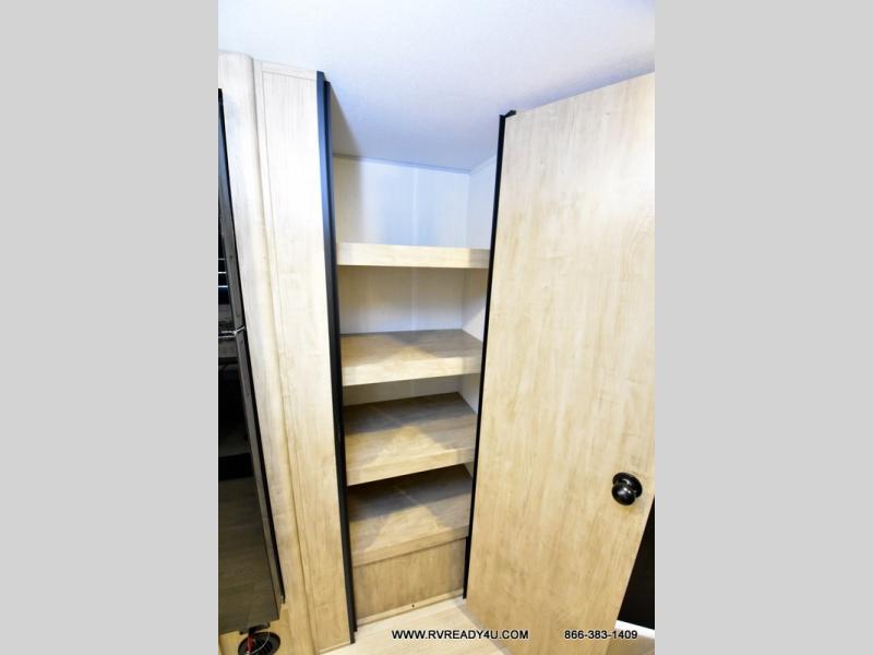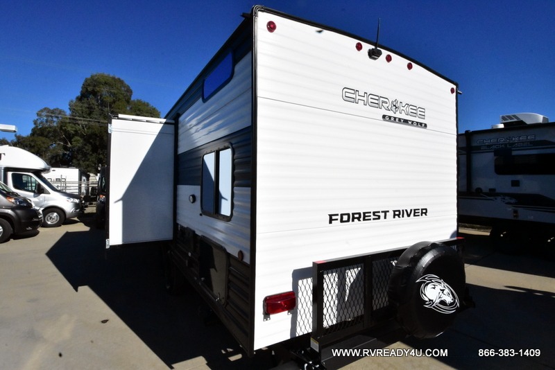 Come on inside this Cherokee Grey Wolf travel trailer and experience the convenience of a smooth flow of traffic in and out with two entry doors. The rear door leads into a full bath which is great for accessibility. Once inside, you will notice the large U-shaped dinette and the sofa which sit on the slide and create a spacious footprint for moving about, as well as great places to play games and socialize with your friends and family. A walk-in pantry provides plenty of storage allowing you to stock up on your favorite snacks and dry goods for your family adventure. At night, there is sleeping space for everyone between the double-size bunks and the RV king bed, plus the furniture.