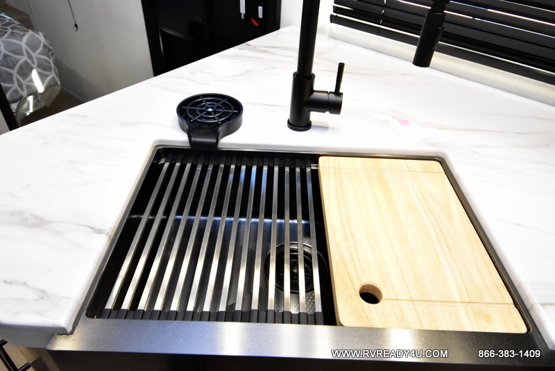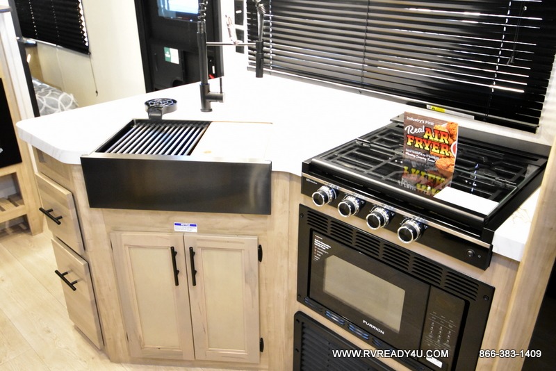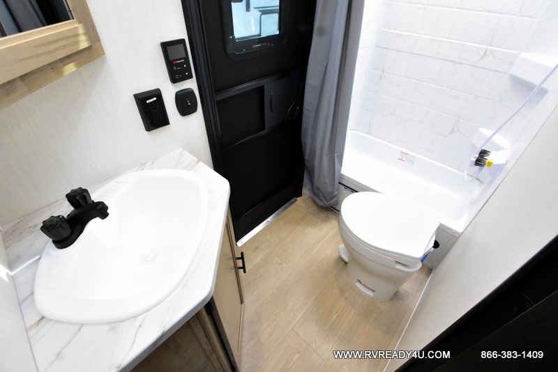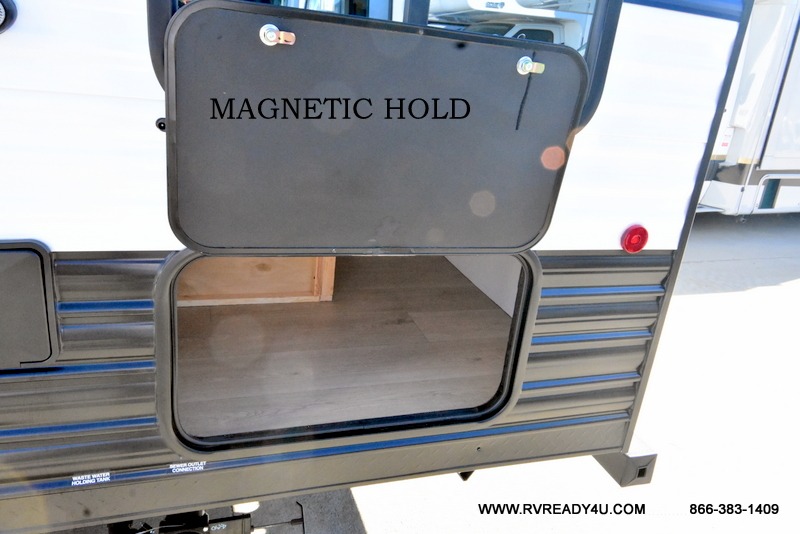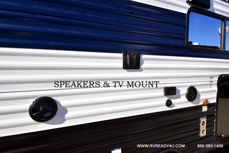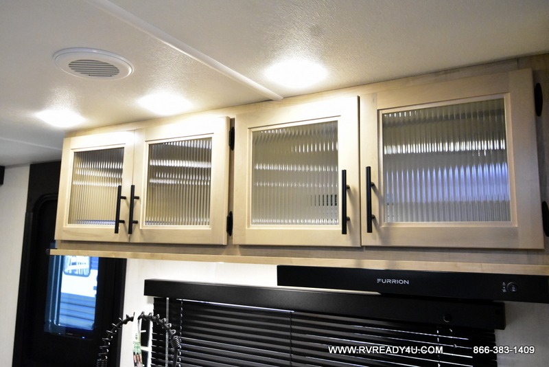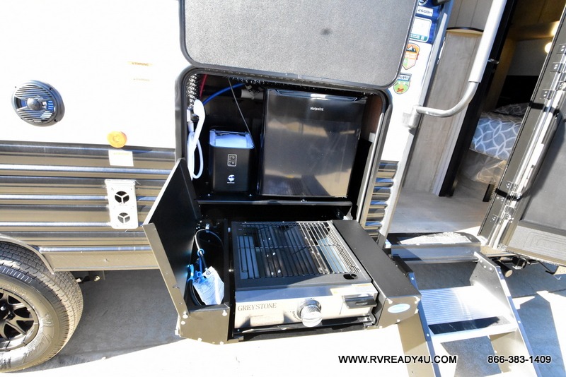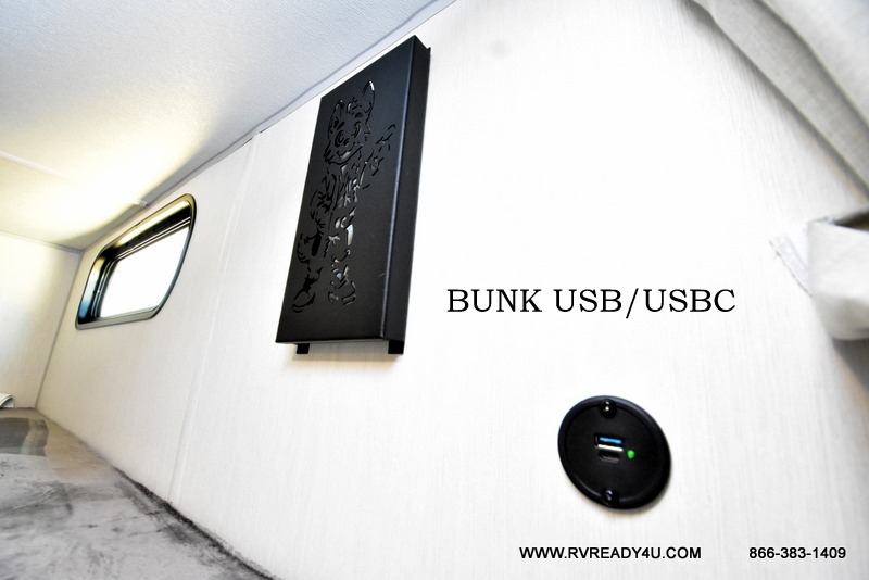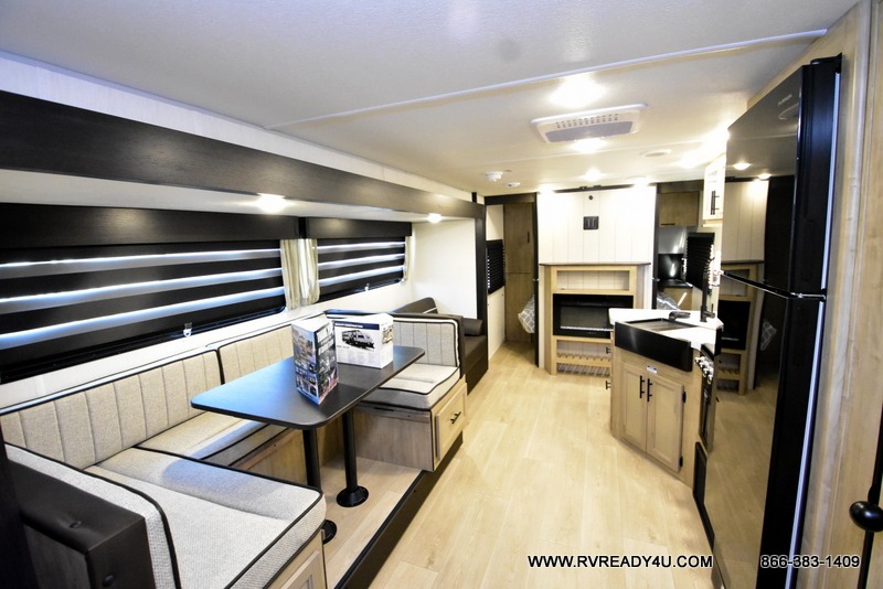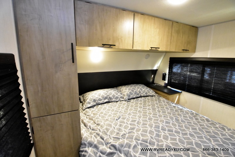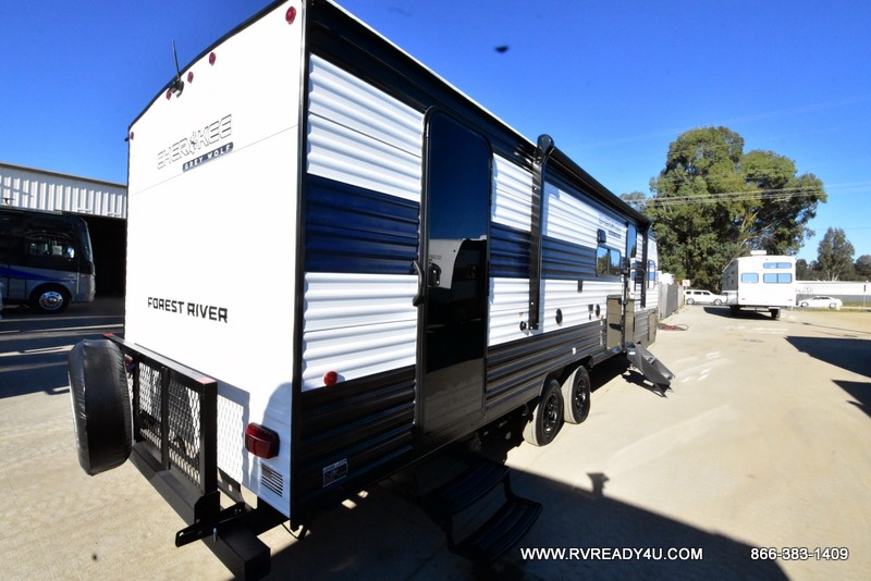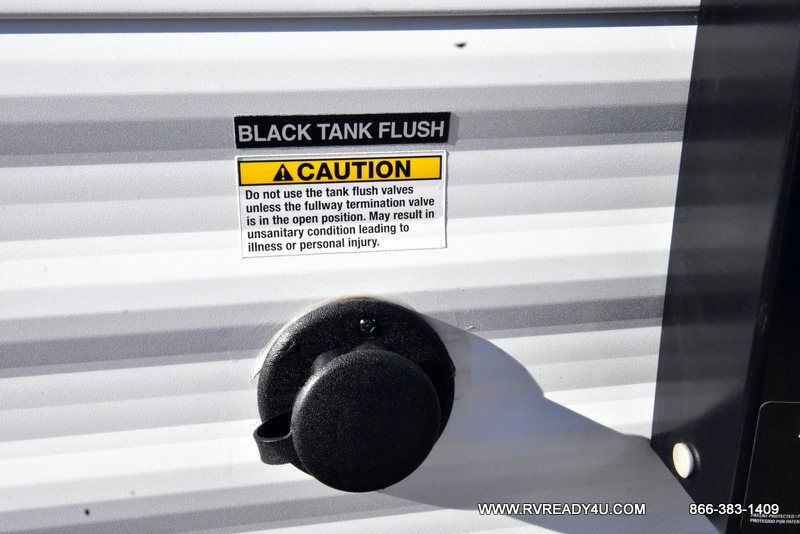 Come on inside this Cherokee Grey Wolf travel trailer and experience the convenience of a smooth flow of traffic in and out with two entry doors. The rear door leads into a full bath which is great for accessibility. Once inside, you will notice the large U-shaped dinette and the sofa which sit on the slide and create a spacious footprint for moving about, as well as great places to play games and socialize with your friends and family. A walk-in pantry provides plenty of storage allowing you to stock up on your favorite snacks and dry goods for your family adventure. At night, there is sleeping space for everyone between the double-size bunks and the RV king bed, plus the furniture.