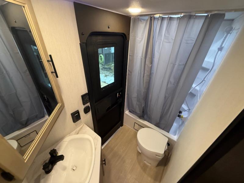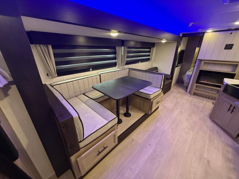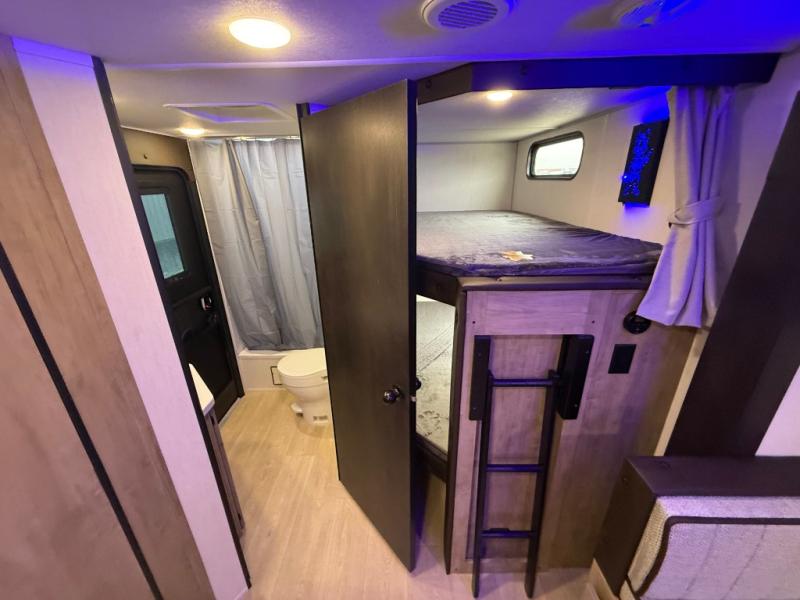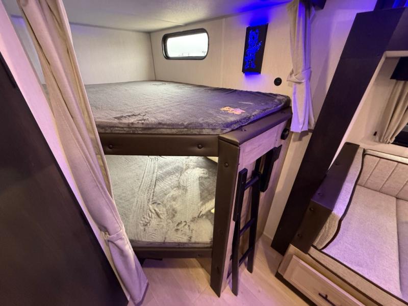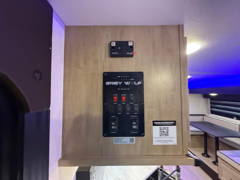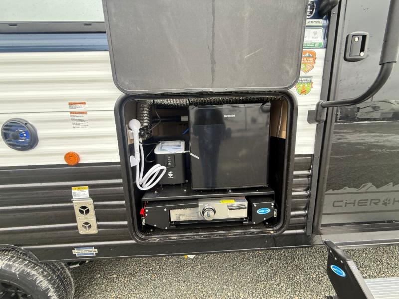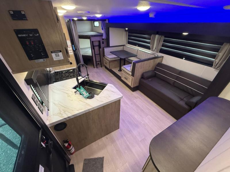 Come on inside this Cherokee Grey Wolf travel trailer and experience the convenience of a smooth flow of traffic in and out with two entry doors. The rear door leads into a full bath which is great for accessibility. Once inside, you will notice the large U-shaped dinette and the sofa which sit on the slide and create a spacious footprint for moving about, as well as great places to play games and socialize with your friends and family. A walk-in pantry provides plenty of storage allowing you to stock up on your favorite snacks and dry goods for your family adventure. At night, there is sleeping space for everyone between the double-size bunks and the RV king bed, plus the furniture.