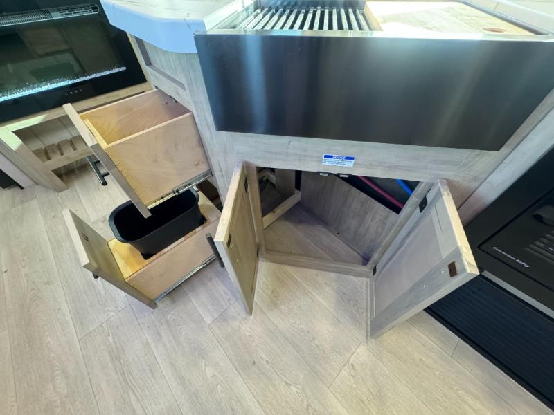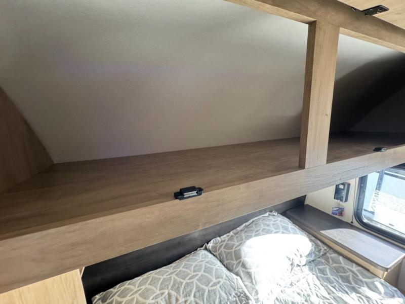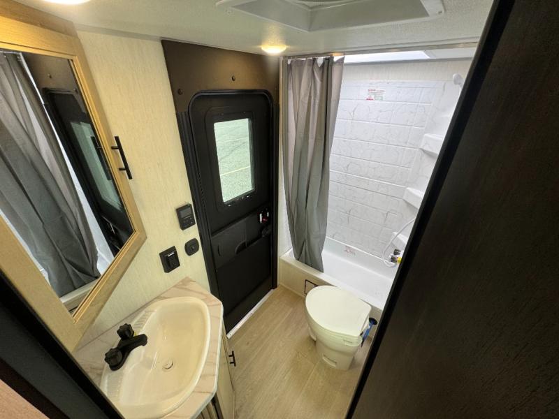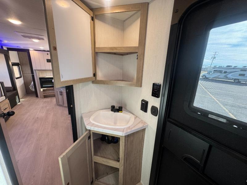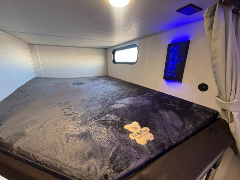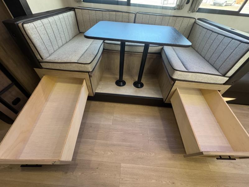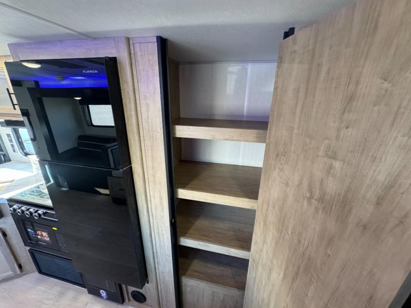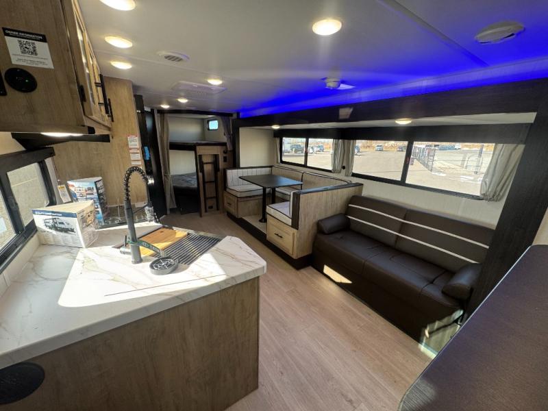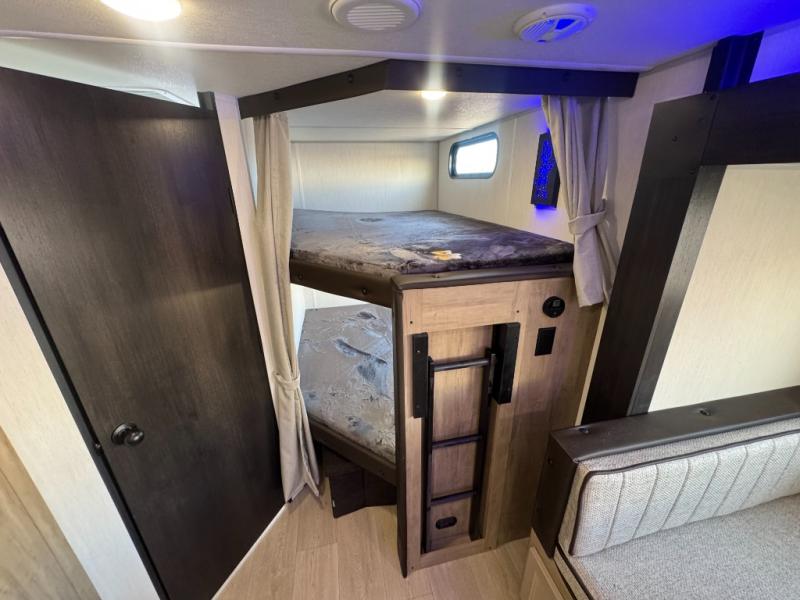 Come on inside this Cherokee Grey Wolf travel trailer and experience the convenience of a smooth flow of traffic in and out with two entry doors. The rear door leads into a full bath which is great for accessibility. Once inside, you will notice the large U-shaped dinette and the sofa which sit on the slide and create a spacious footprint for moving about, as well as great places to play games and socialize with your friends and family. A walk-in pantry provides plenty of storage allowing you to stock up on your favorite snacks and dry goods for your family adventure. At night, there is sleeping space for everyone between the double-size bunks and the RV king bed, plus the furniture.