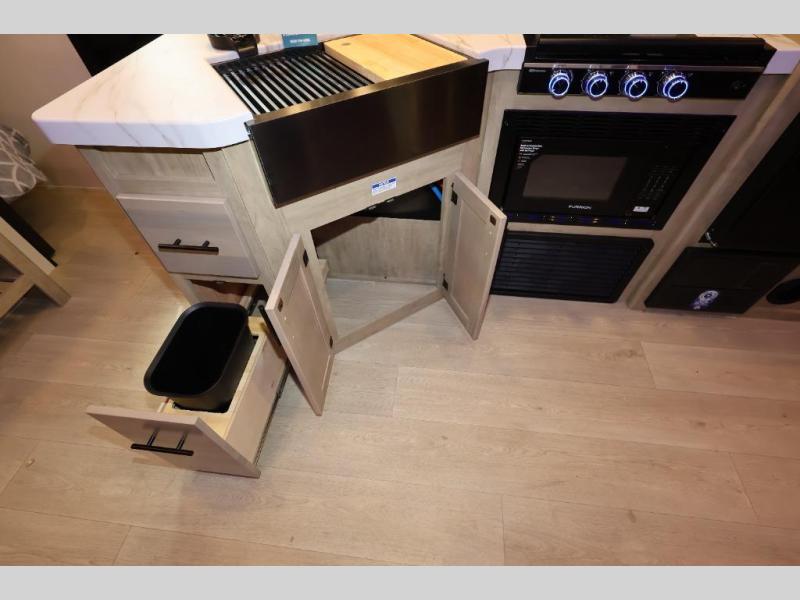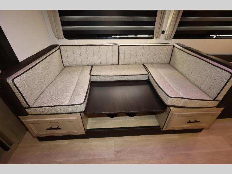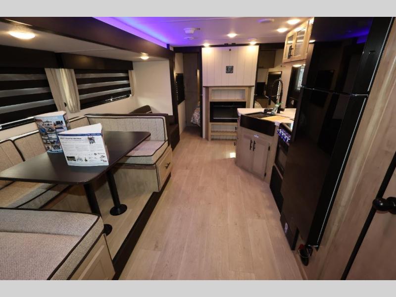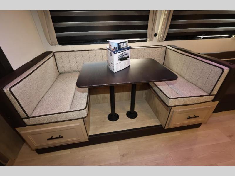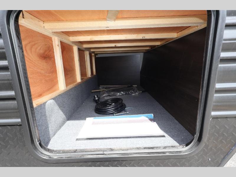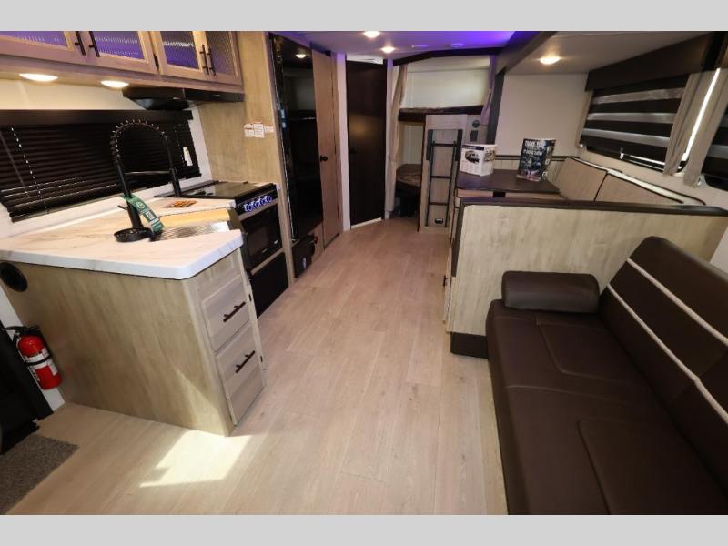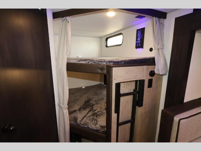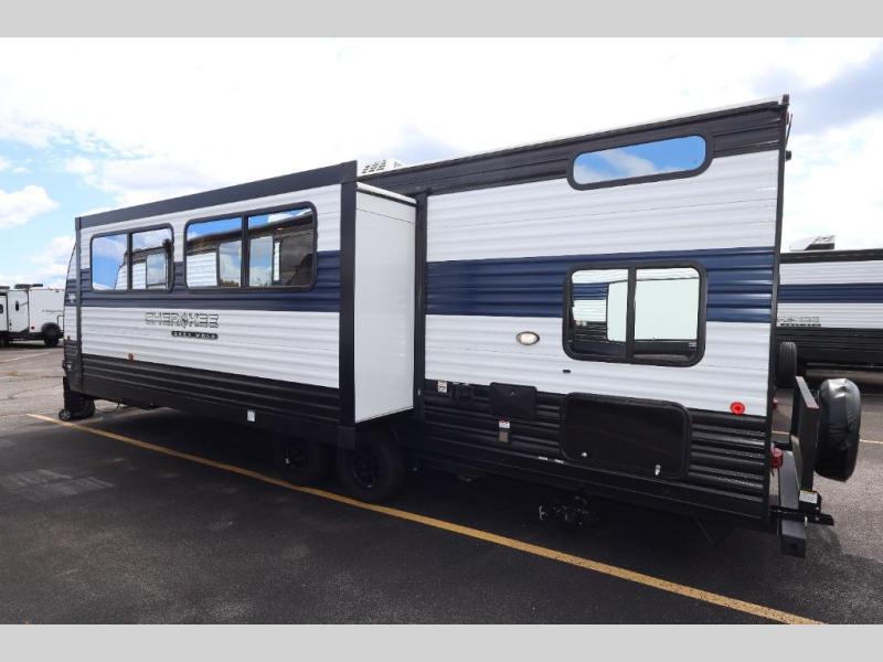Come on inside this Cherokee Grey Wolf travel trailer and experience the convenience of a smooth flow of traffic in and out with two entry doors. The rear door leads into a full bath which is great for accessibility. Once inside, you will notice the large U-shaped dinette and the sofa which sit on the slide and create a spacious footprint for moving about, as well as great places to play games and socialize with your friends and family. A walk-in pantry provides plenty of storage allowing you to stock up on your favorite snacks and dry goods for your family adventure. At night, there is sleeping space for everyone between the double-size bunks and the RV king bed, plus the furniture.