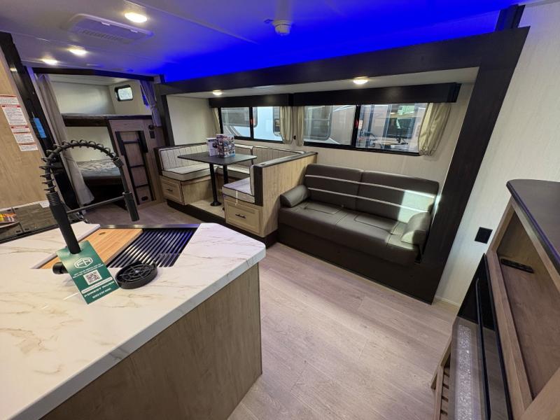 Come on inside this Cherokee Grey Wolf travel trailer and experience the convenience of a smooth flow of traffic in and out with two entry doors. The rear door leads into a full bath which is great for accessibility. Once inside, you will notice the large U-shaped dinette and the sofa which sit on the slide and create a spacious footprint for moving about, as well as great places to play games and socialize with your friends and family. A walk-in pantry provides plenty of storage allowing you to stock up on your favorite snacks and dry goods for your family adventure. At night, there is sleeping space for everyone between the double-size bunks and the RV king bed, plus the furniture.