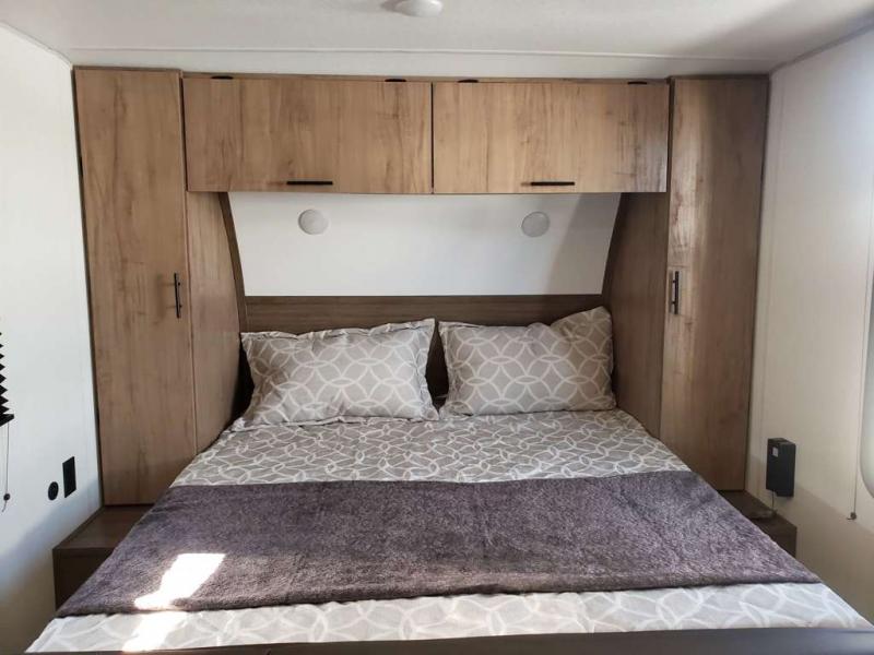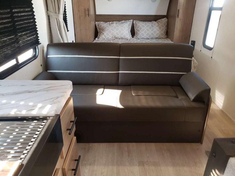 If you like to camp with more friends and family, this travel trailer is for you! Since there are double-size bunks, a queen bed, plus a sofa and booth dinette, you can sleep eight people each night! The front bedroom includes the RV king bed, along with dual bedroom wardrobes and USB ports to charge your phones overnight. A full kitchen, complete with an air fryer and refrigerator will let the chef do their thing, and everyone can head outdoors to sit under the 15' patio awning!