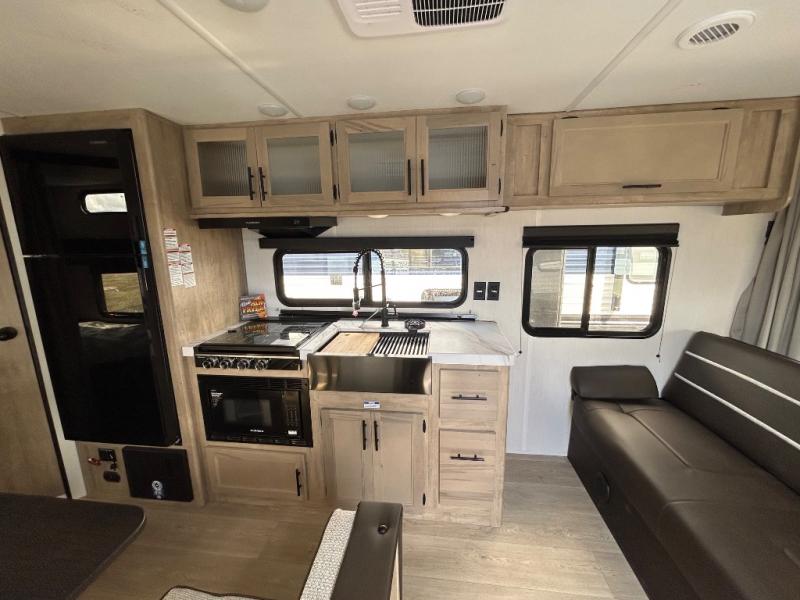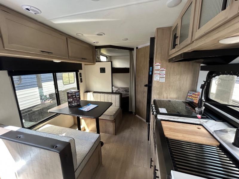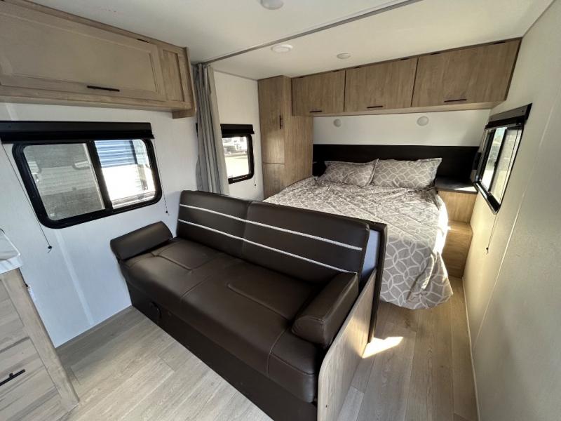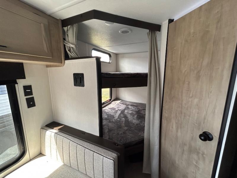 If you like to camp with more friends and family, this travel trailer is for you! Since there are double-size bunks, a queen bed, plus a sofa and booth dinette, you can sleep eight people each night! The front bedroom includes the RV king bed, along with dual bedroom wardrobes and USB ports to charge your phones overnight. A full kitchen, complete with an air fryer and refrigerator will let the chef do their thing, and everyone can head outdoors to sit under the 15' patio awning!