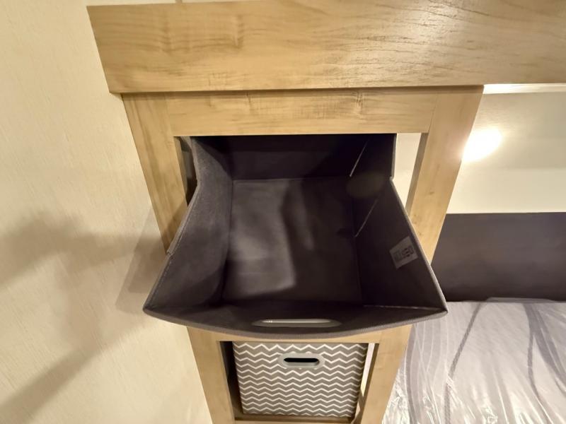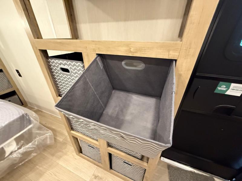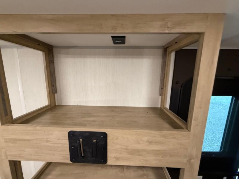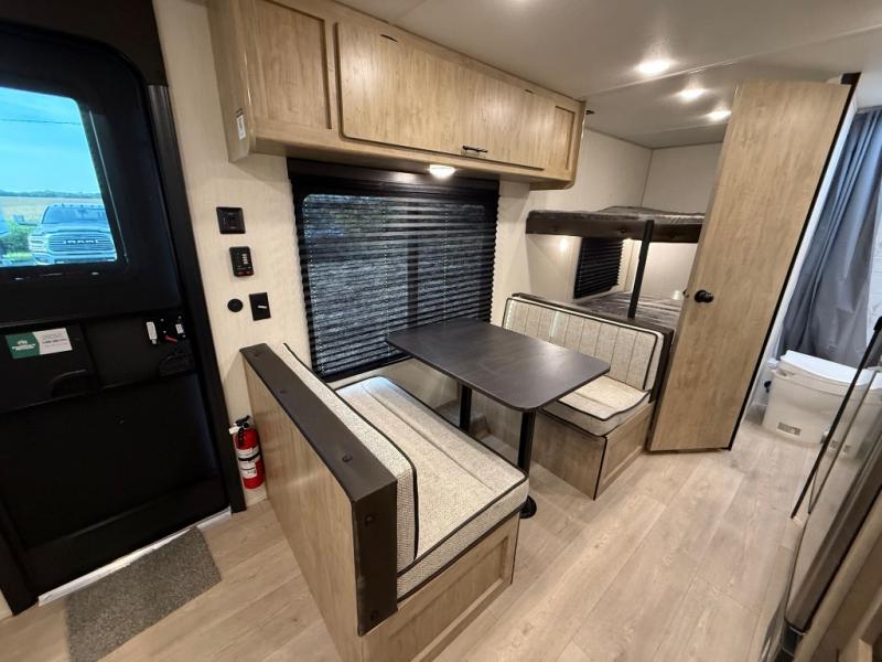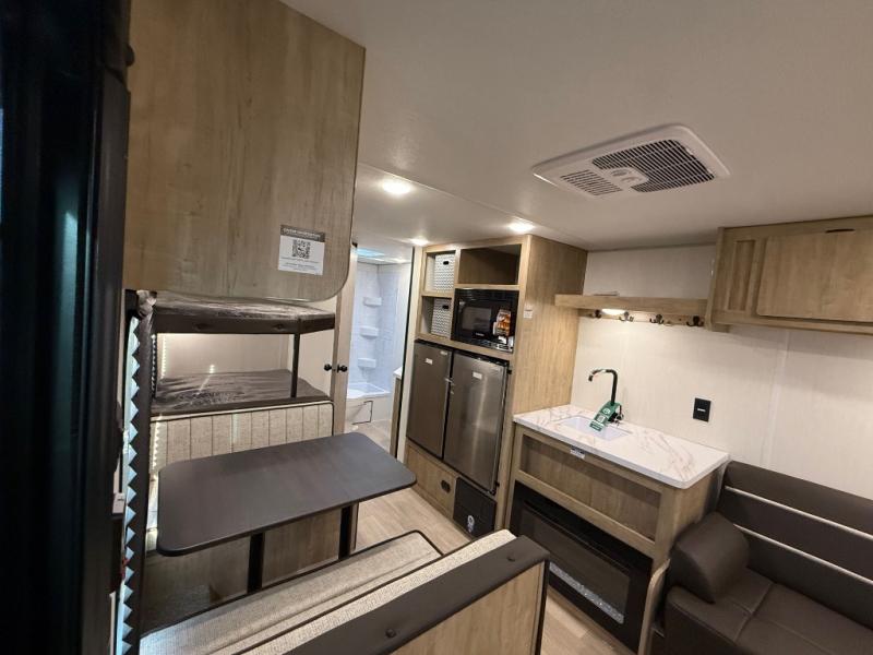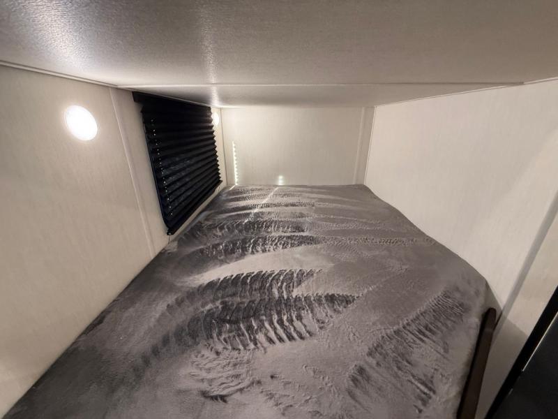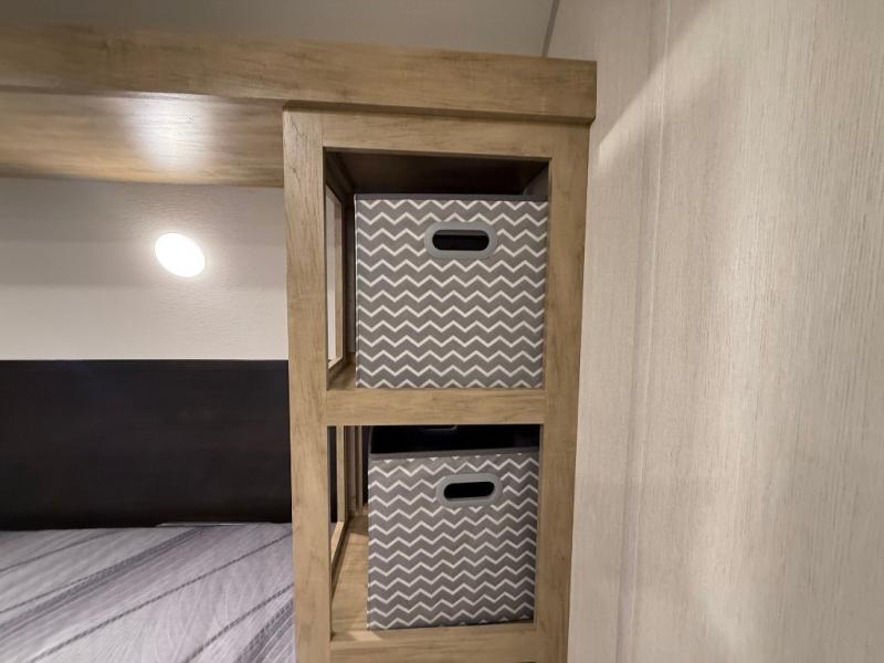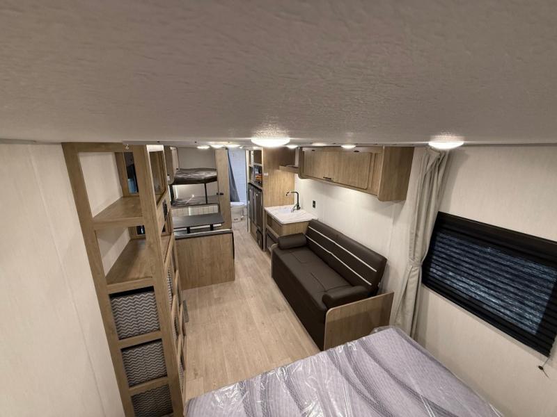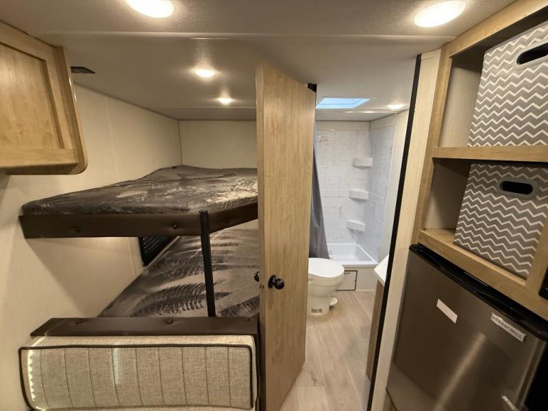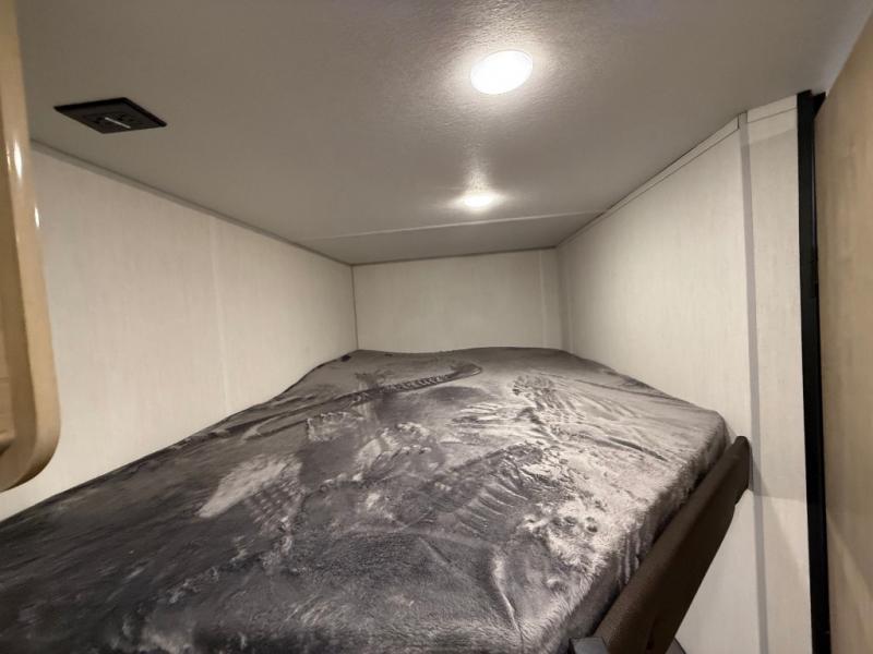 Enjoy family adventures in this bunk model which features sleeping for eight to ten depending on size with a queen bed up front, double-size bunks in the rear curbside corner, and you could even convert the booth dinette and sofa to sleep more. Inside, you will find ample storage with overhead cabinets and a large shelf above the queen bed, plus more shelves next to the entry door, as well as a pantry and storage on either side of the bed. You will appreciate the full bath with tub/shower, toilet, and sink so you can skip the campground facilities. On the outside, you will also find a 12' awning for added outdoor living, and outside storage for your camping gear, plus more!