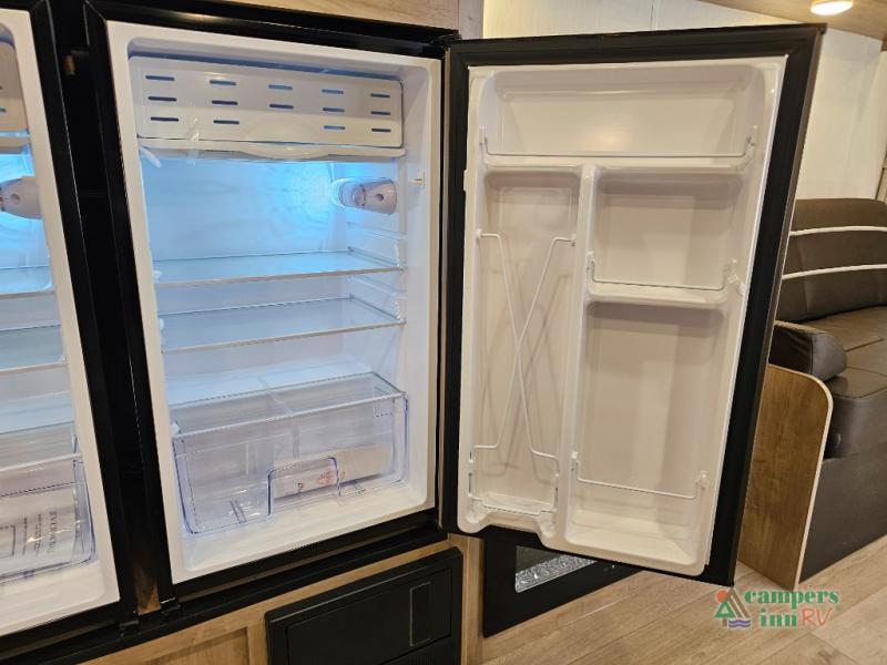 Modern Kitchen: Equipped with a 12V, high-efficiency 10 cubic foot residential-style refrigerator, Chef Select black stainless steel kitchen suite, and seamless countertops.