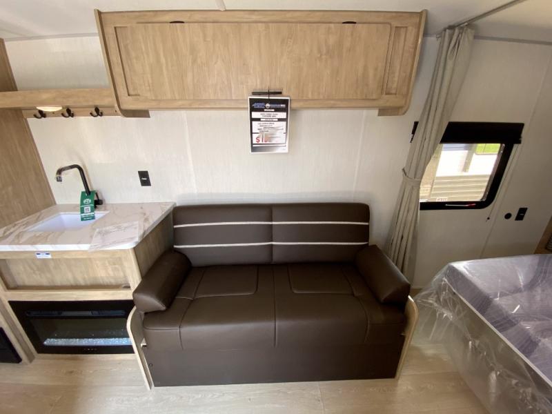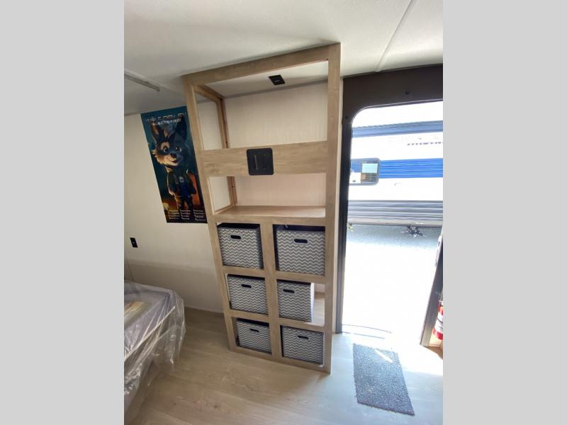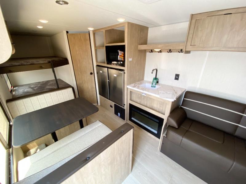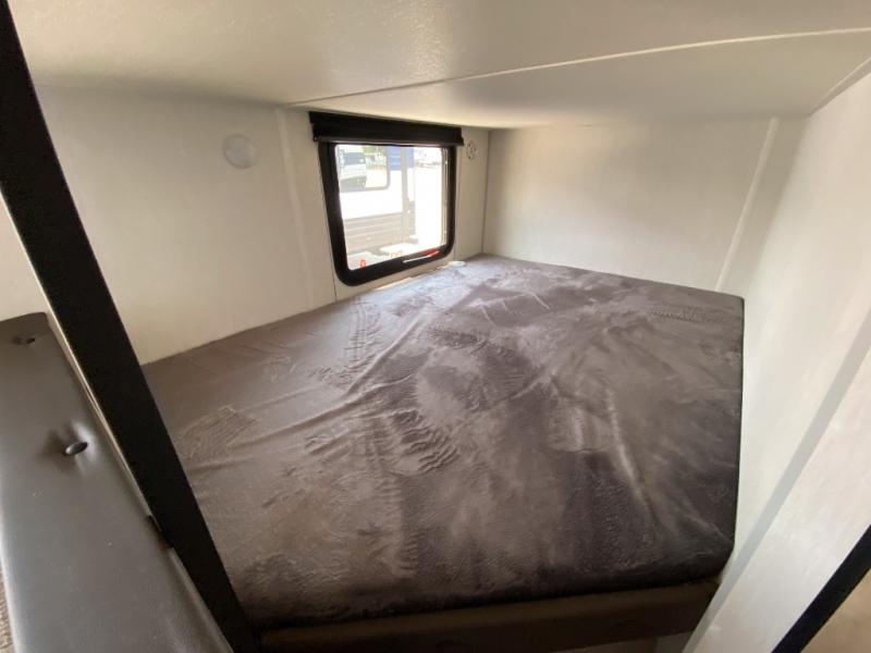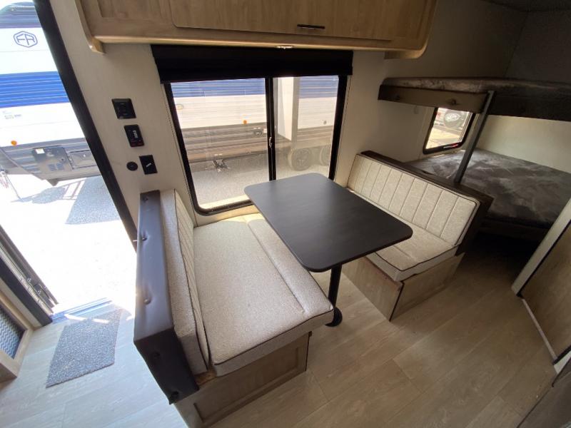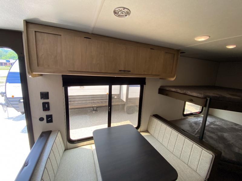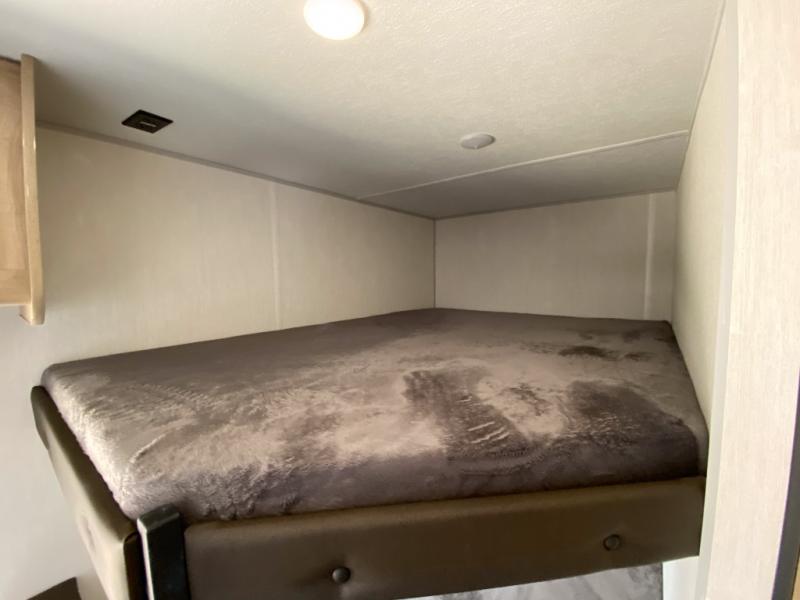 Enjoy family adventures in this bunk model which features sleeping for eight to ten depending on size with a queen bed up front, double-size bunks in the rear curbside corner, and you could even convert the booth dinette and sofa to sleep more. Inside, you will find ample storage with overhead cabinets and a large shelf above the queen bed, plus more shelves next to the entry door, as well as a pantry and storage on either side of the bed. You will appreciate the full bath with tub/shower, toilet, and sink so you can skip the campground facilities. On the outside, you will also find a 12' awning for added outdoor living, and outside storage for your camping gear, plus more!