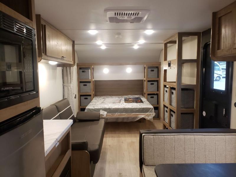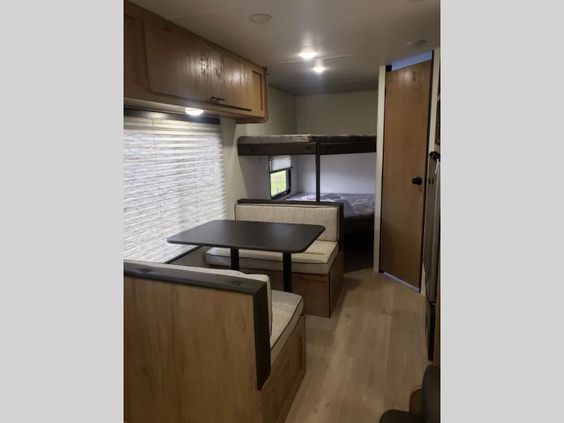 Enjoy family adventures in this bunk model which features sleeping for eight to ten depending on size with a queen bed up front, double-size bunks in the rear curbside corner, and you could even convert the booth dinette and sofa to sleep more. Inside, you will find ample storage with overhead cabinets and a large shelf above the queen bed, plus more shelves next to the entry door, as well as a pantry and storage on either side of the bed. You will appreciate the full bath with tub/shower, toilet, and sink so you can skip the campground facilities. On the outside, you will also find a 12' awning for added outdoor living, and outside storage for your camping gear, plus more!