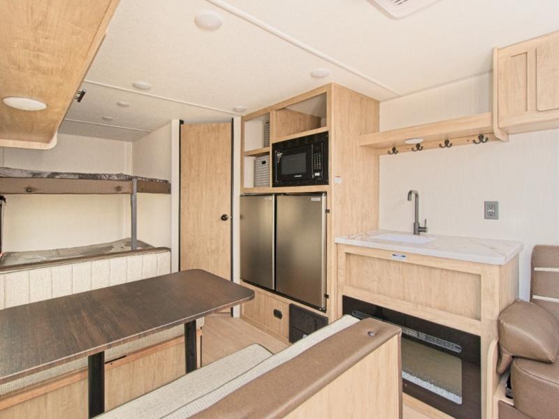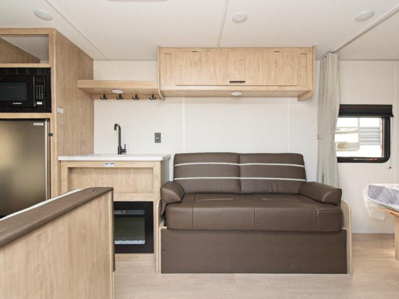 This versatile travel trailer sleeps up to 10, featuring double-size bunk beds tucked into the rear for cozy overnights and a queen bed upfront for the ultimate parent retreat. The booth dinette and sofa easily transform into extra sleeping space when needed.