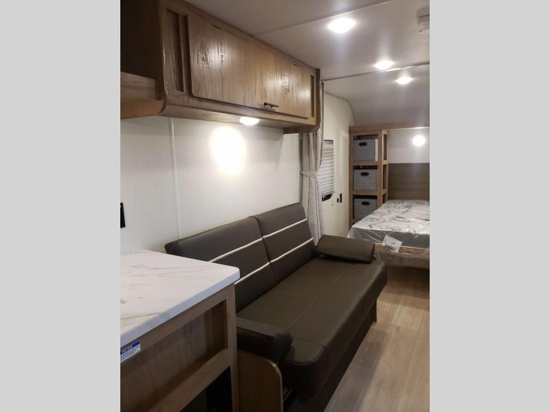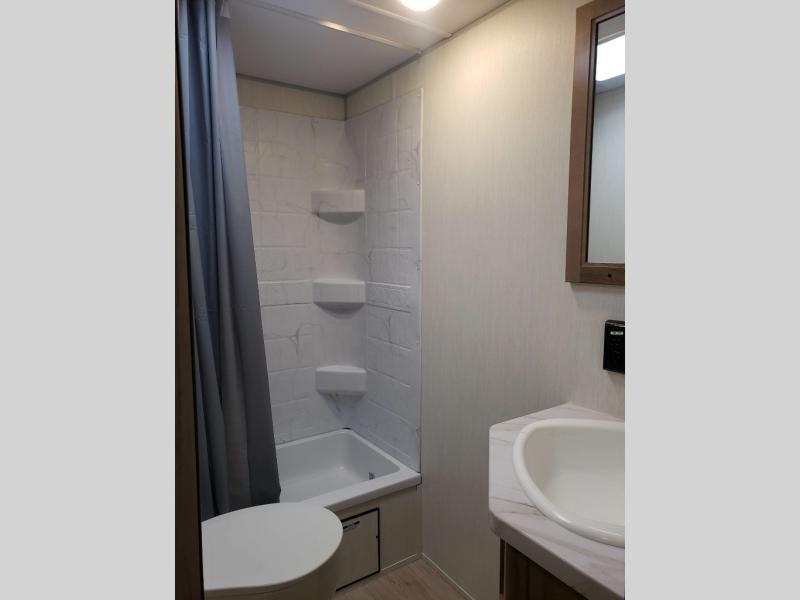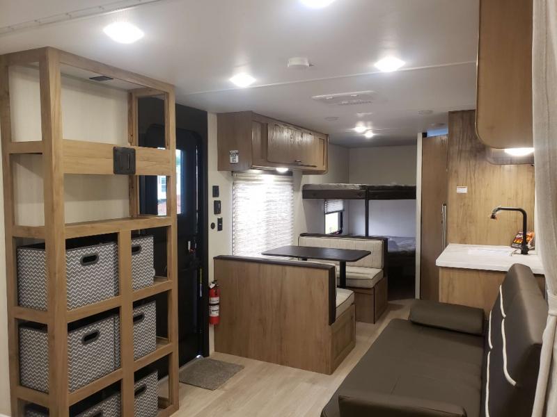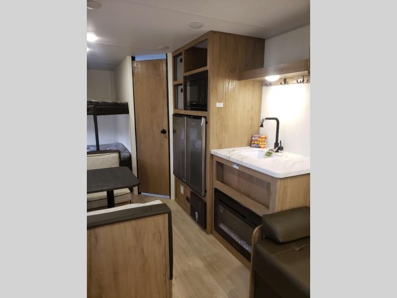 Enjoy family adventures in this bunk model which features sleeping for eight to ten depending on size with a queen bed up front, double-size bunks in the rear curbside corner, and you could even convert the booth dinette and sofa to sleep more. Inside, you will find ample storage with overhead cabinets and a large shelf above the queen bed, plus more shelves next to the entry door, as well as a pantry and storage on either side of the bed. You will appreciate the full bath with tub/shower, toilet, and sink so you can skip the campground facilities. On the outside, you will also find a 12' awning for added outdoor living, and outside storage for your camping gear, plus more!