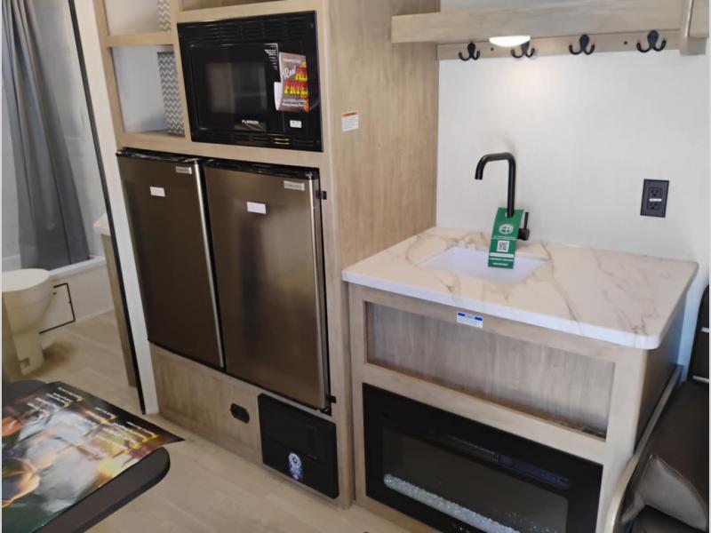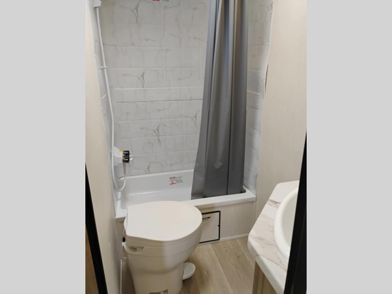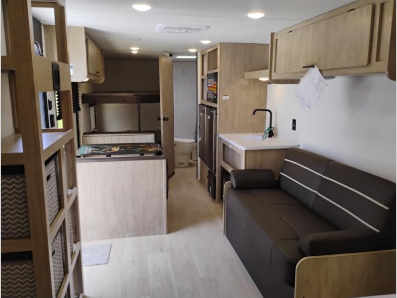 Enjoy family adventures in this bunk model which features sleeping for eight to ten depending on size with a queen bed up front, double-size bunks in the rear curbside corner, and you could even convert the booth dinette and sofa to sleep more. Inside, you will find ample storage with overhead cabinets and a large shelf above the queen bed, plus more shelves next to the entry door, as well as a pantry and storage on either side of the bed. You will appreciate the full bath with tub/shower, toilet, and sink so you can skip the campground facilities. On the outside, you will also find a 12' awning for added outdoor living, and outside storage for your camping gear, plus more!
